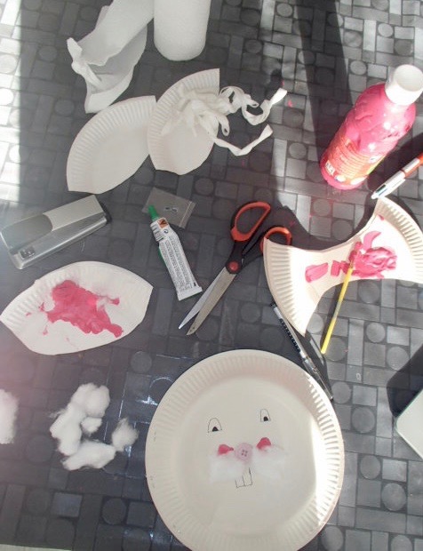 Les mains roses de peinture, 2 doigts collés avec du coton au bout (formidable), et un bon coup d’éponge nécessaire sur la table.
