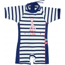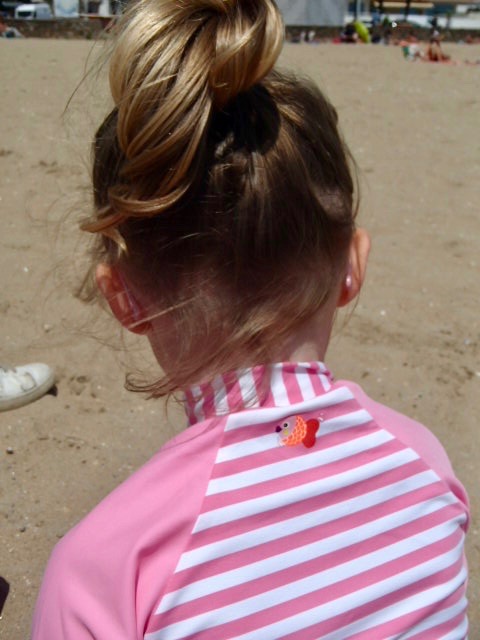 Le Chapeau anti-UV indispensable, le T.Shirt anti-UV et Le Short anti-UV dissociable, j’adore ces couleurs très acidulées tout rose bonbon à l’image de ma chipie 😉