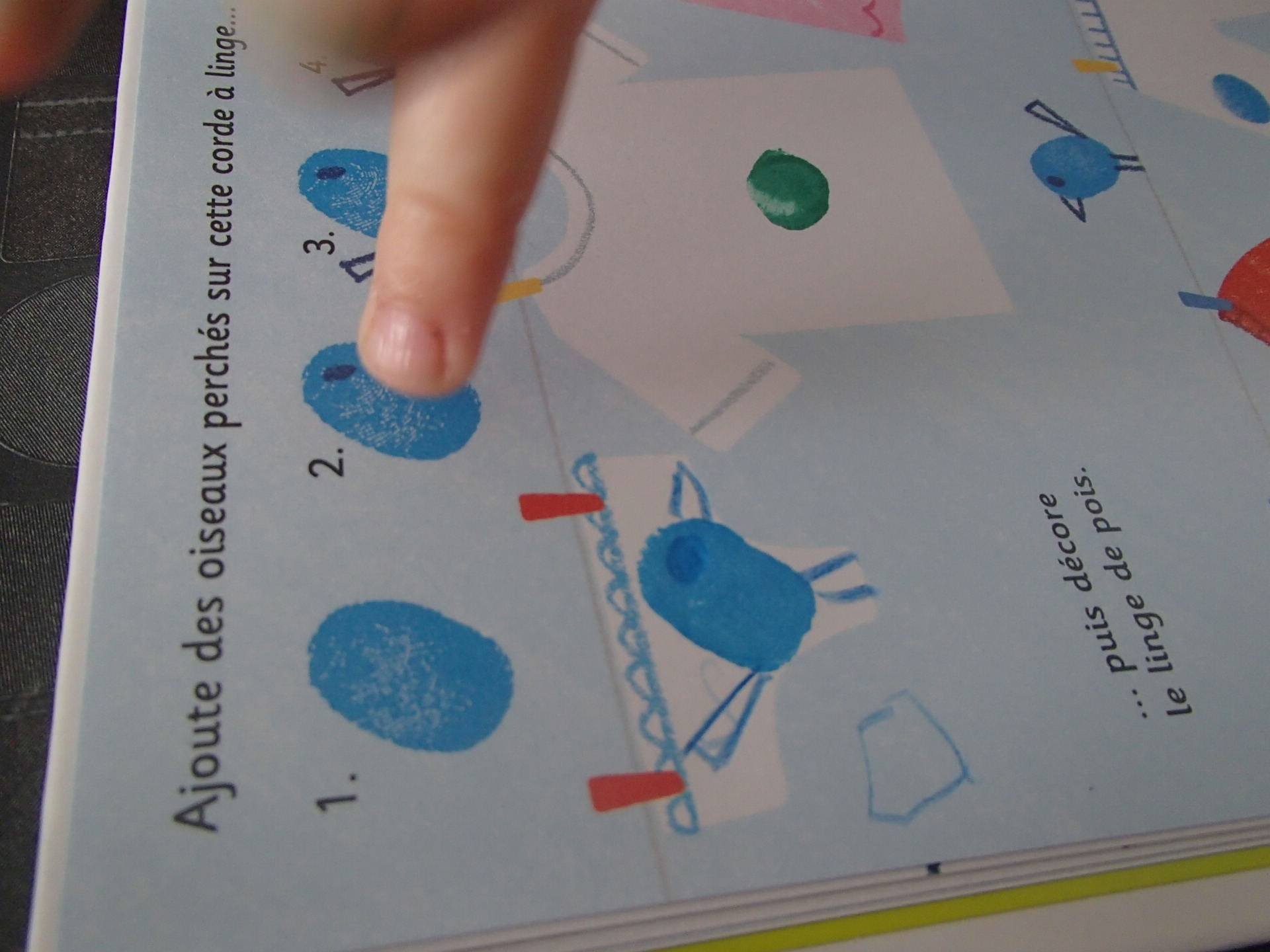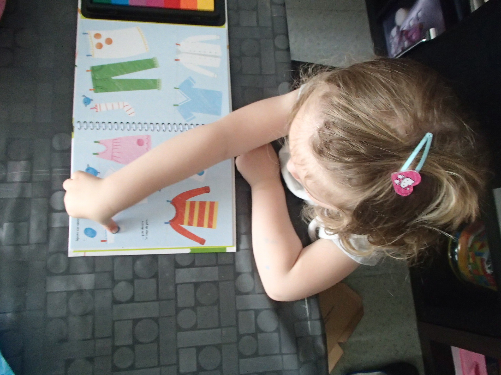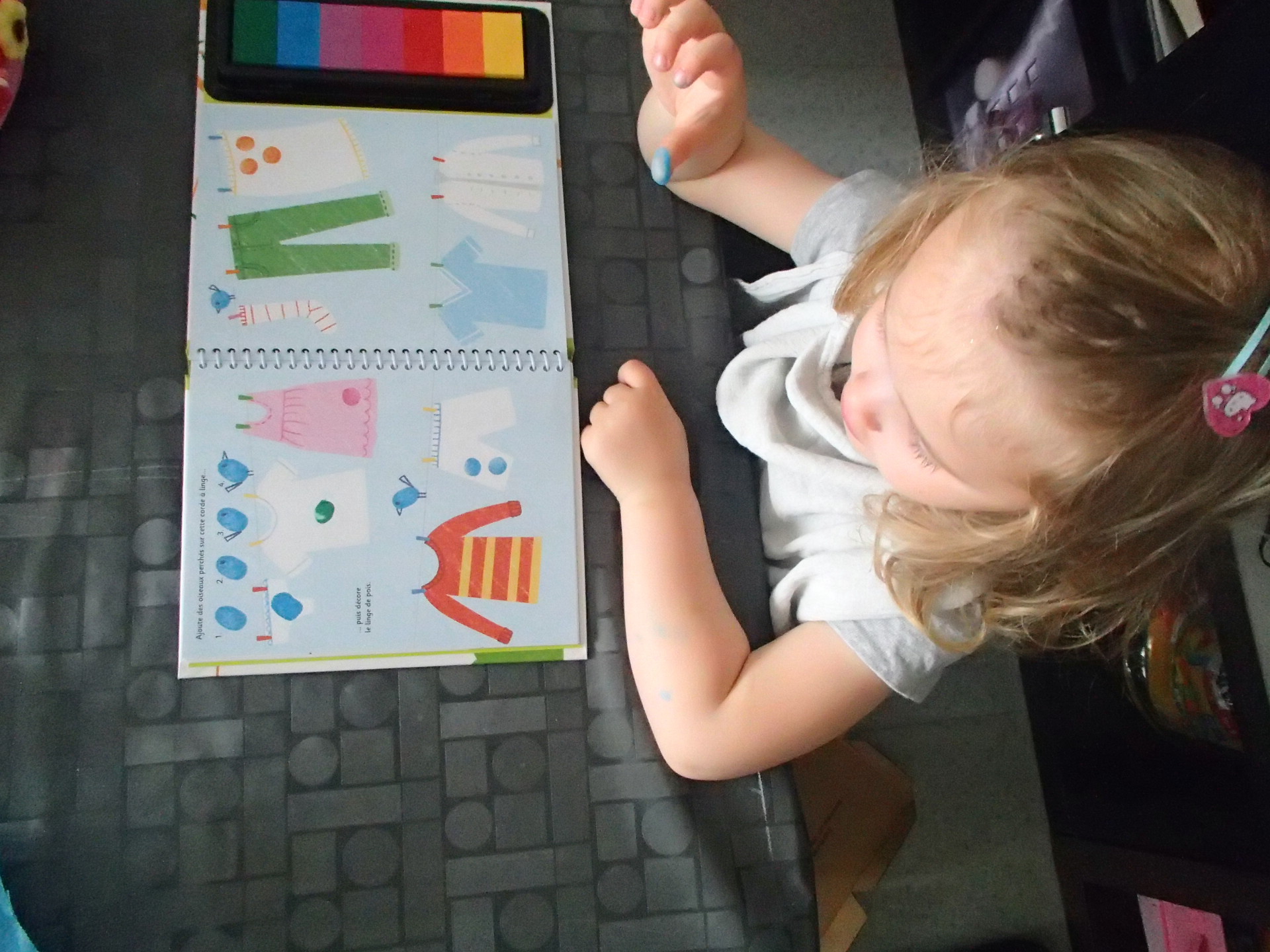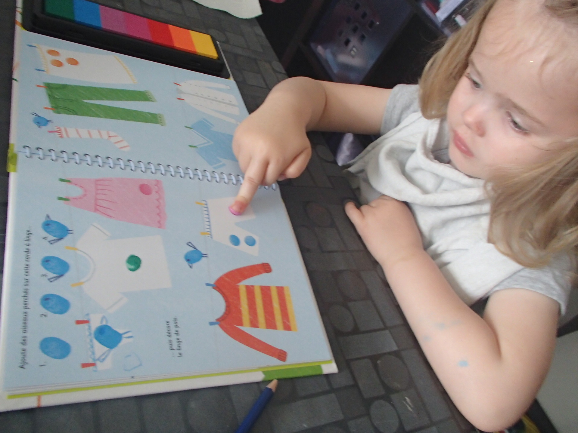 On appuie avec un de ses doigts sur le tampon de la couleur choisie, puis on tamponne selon le dessin que l’on doit reproduire sur l’espace vide, on peut également terminer avec un stylo le tracé, je pense aux oiseaux : un coup de tampon sur son doigts et on fait le bec, la queue et les pattes et hop un oiseau apparaît.