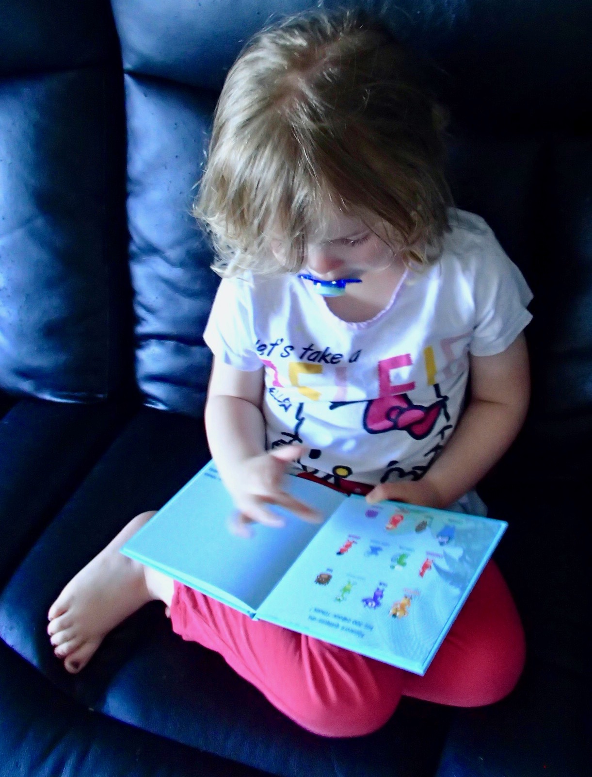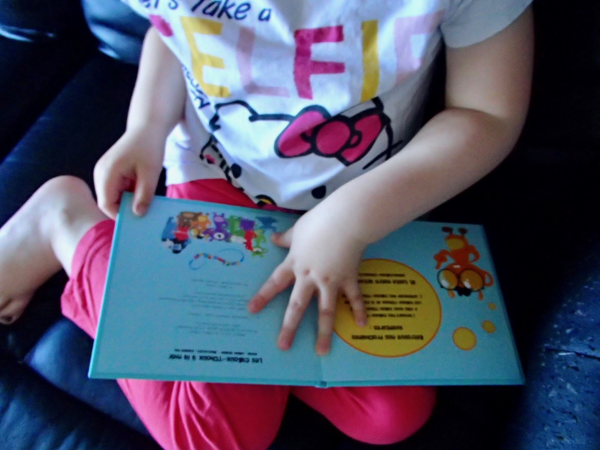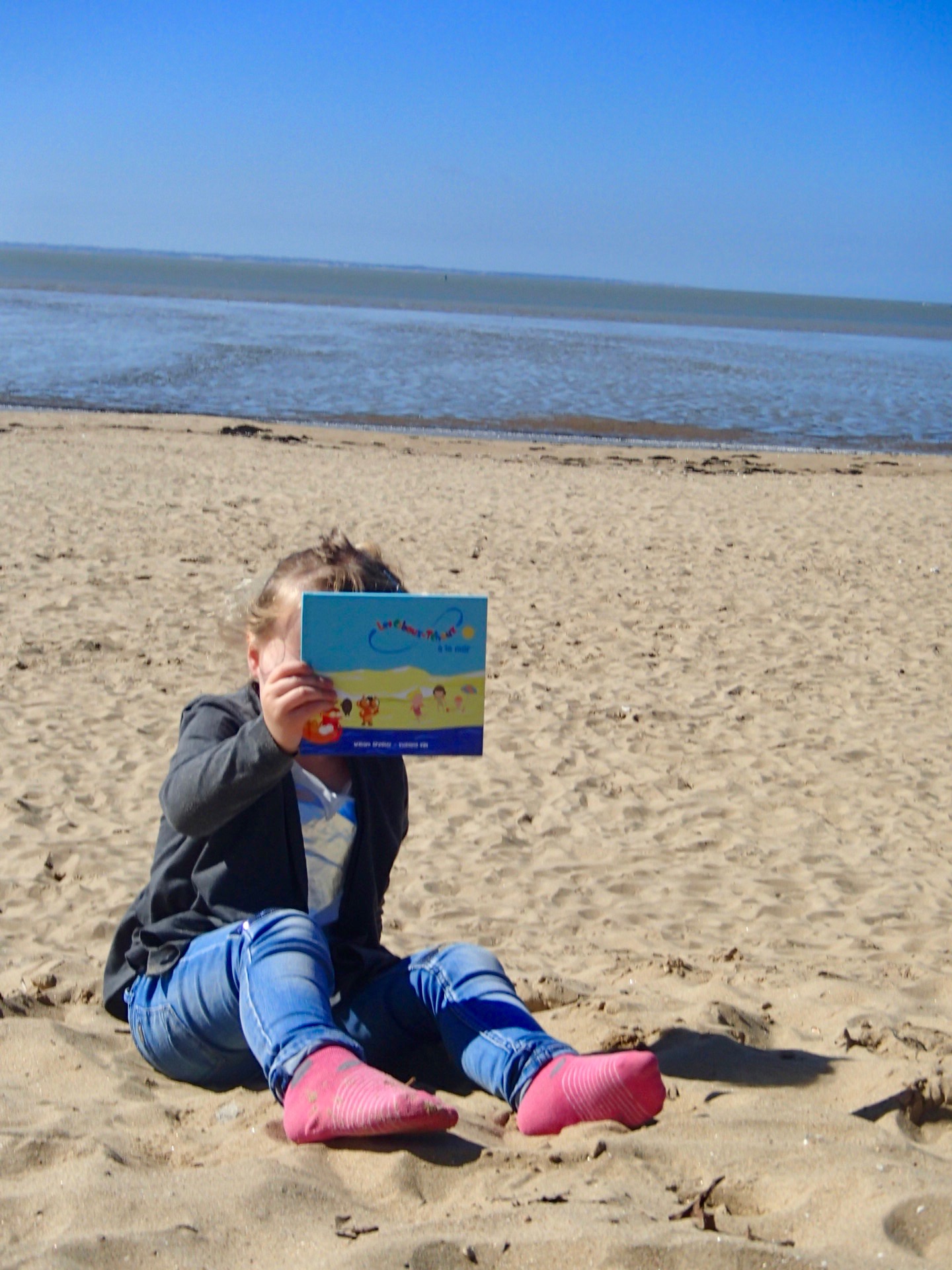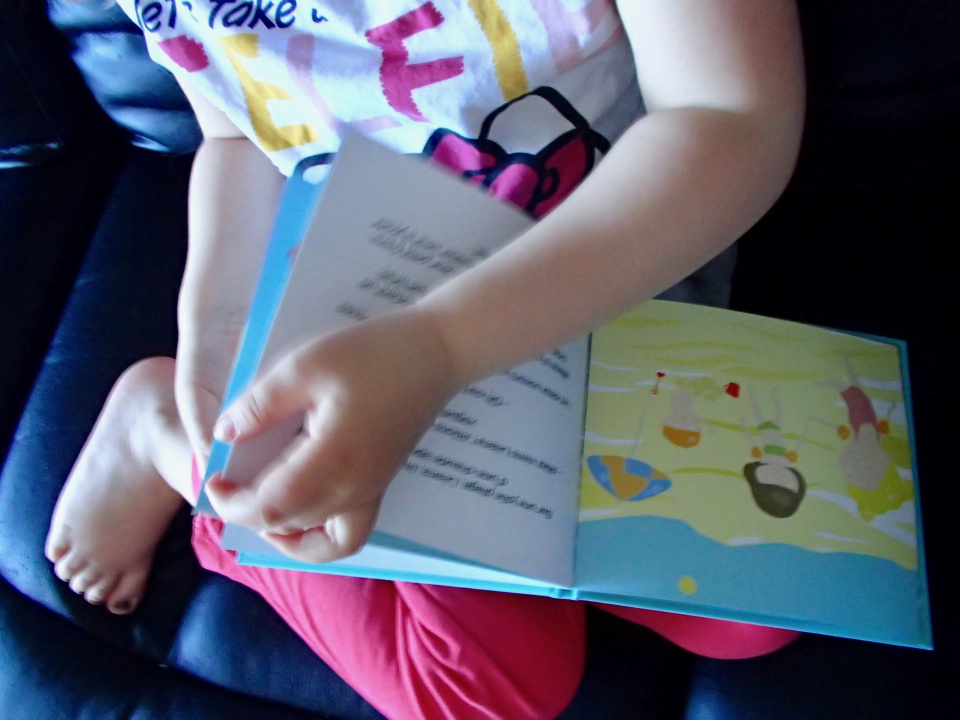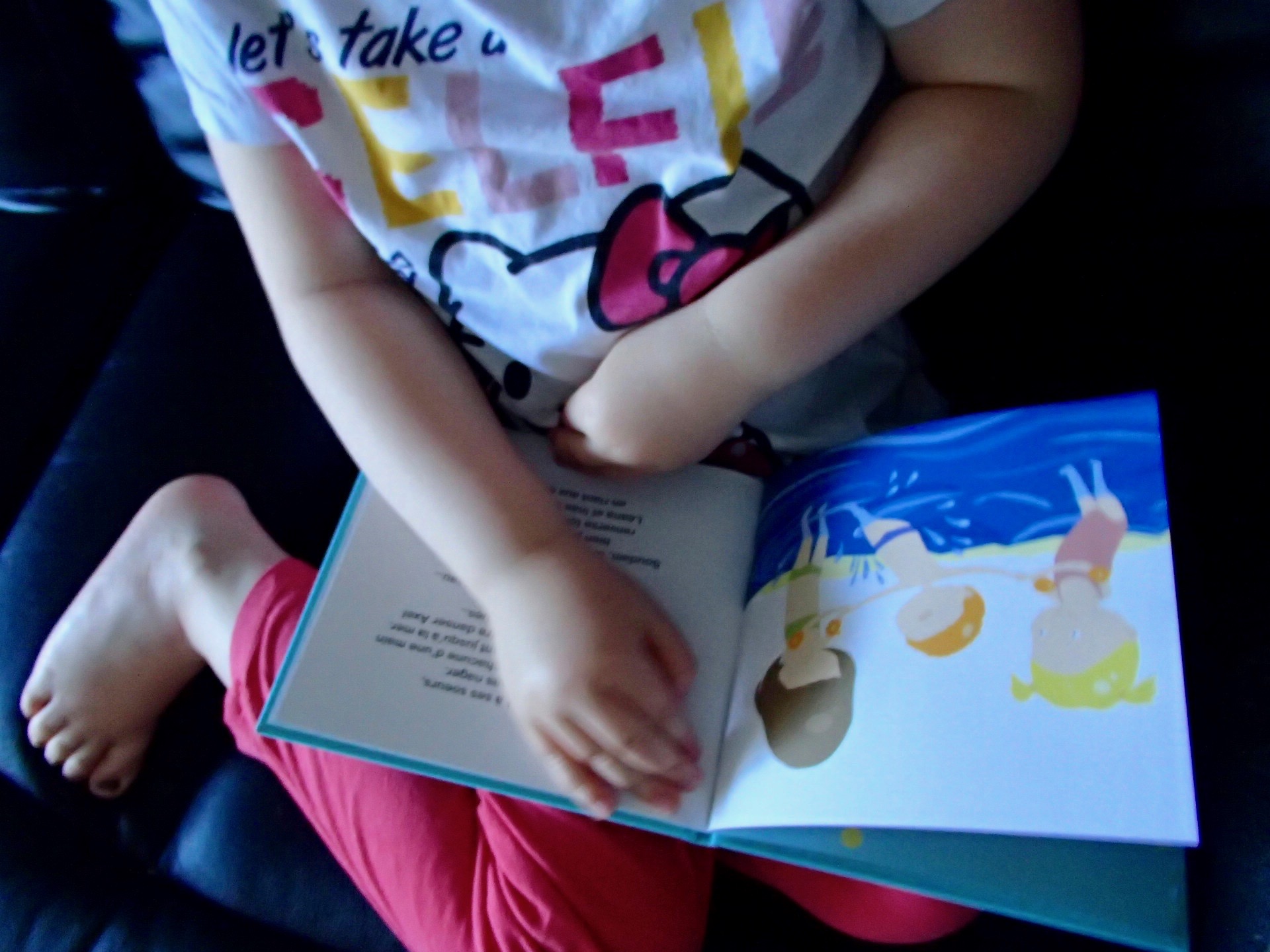 Après la douche et débarrassée du sable, chipie l’ a réclamé à nouveau pour le lire tranquillement avant d’aller dormir.