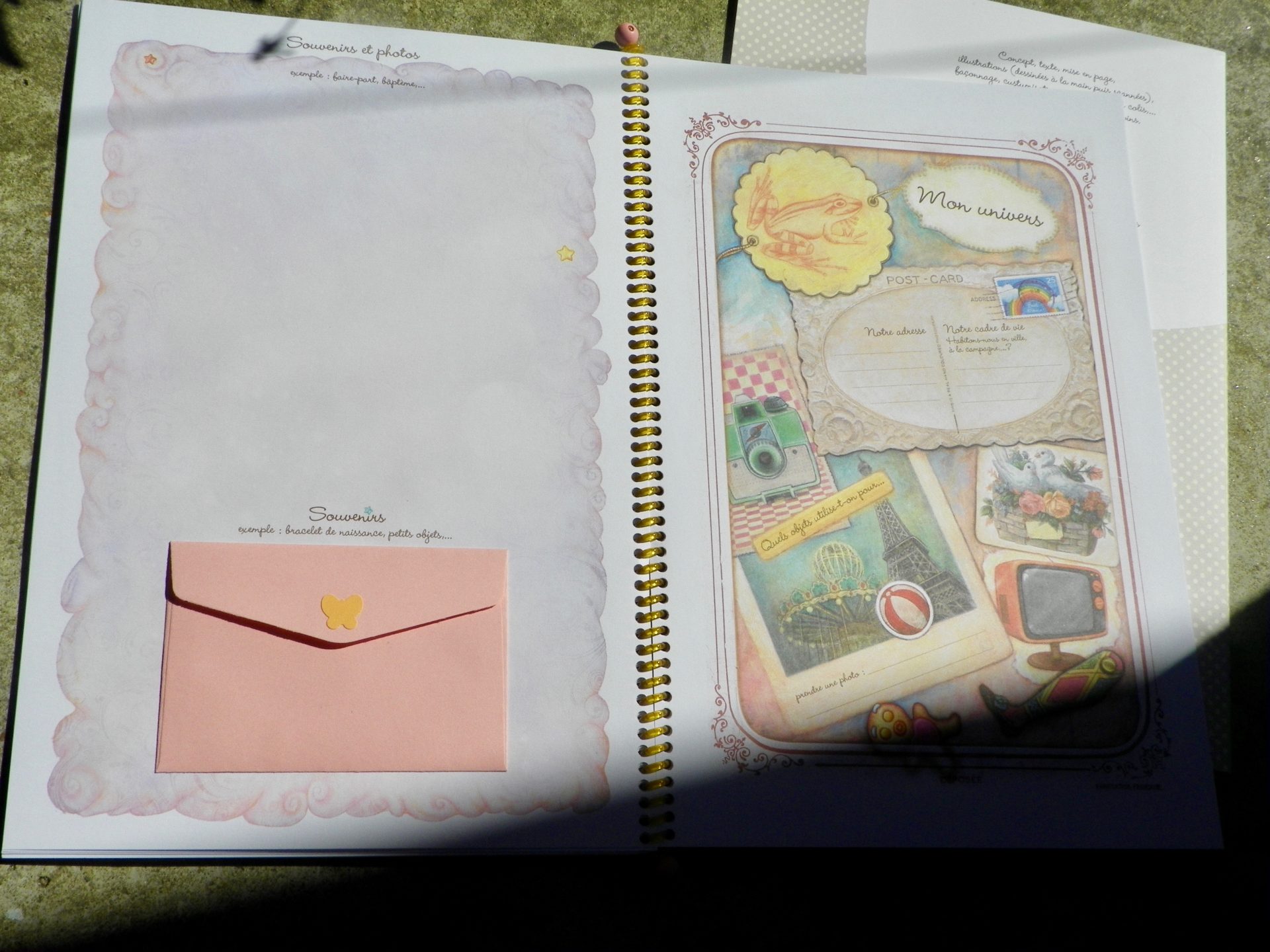 J’ai pris un grand plaisir à personnalisé ce livre pour ma chipie, avec des photos , des mots, des souvenirs (coquillages, dessins, …) et l’émotion aidant, ma petite larme s’est souvent transformée en grand sanglots de bonheur et surtout je l’ai partagée avec chipie qui a 4 ans et a aussi aimée faire ce livre avec sa maman. Elle sait que ce livre est à elle.