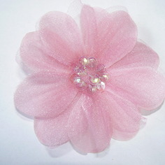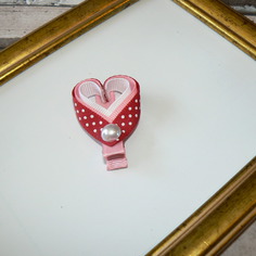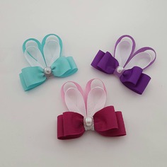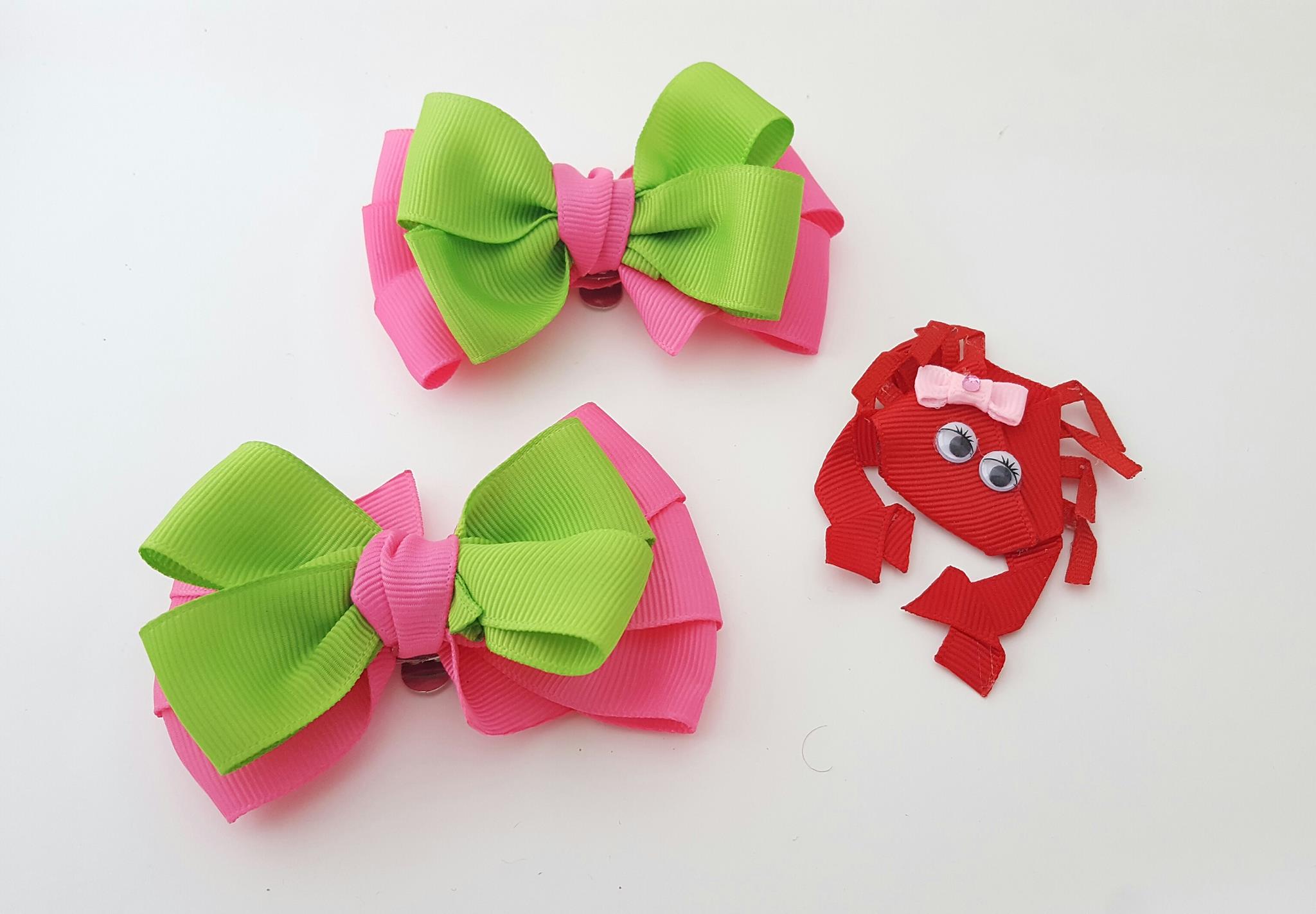 Elle travaille essentiellement le ruban en gros grain, qu’elle achète principalement aux USA, mais aussi dans les boutiques genre mondial tissu, un peu le satin ou la mousseline et parfois le tissu (notamment pour faire des nœuds papillons), et rajoute des petites choses : perles, boutons, patchs etc…