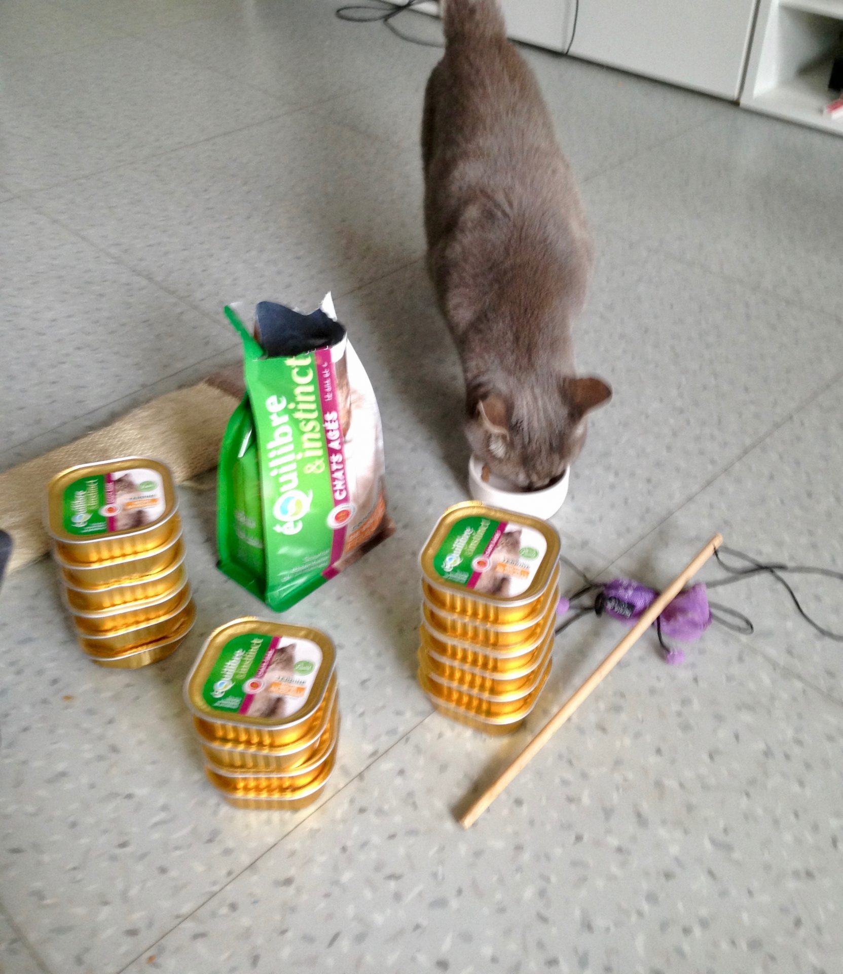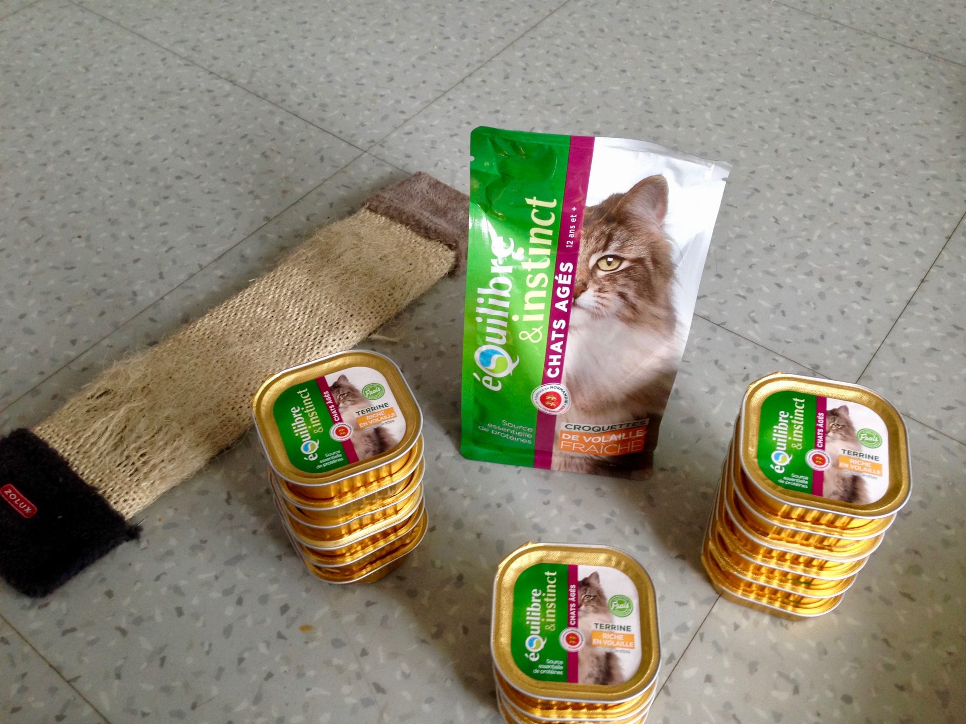 Nous avons reçus un carton avec 16 boites de pâtés pour chat au poulet et un sachet pour les chats de plus de 12 ans parfait!