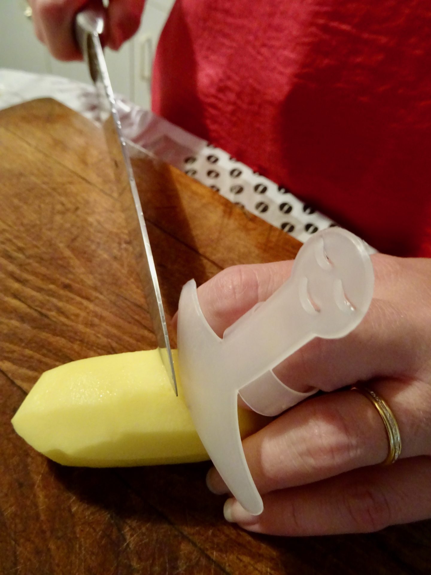 Une pomme de terre à la main, un couteau de l’autre et je me suis équipée de ce protège coupe doigts Smiley déniché sur internet : Outilsdecuisine.com.