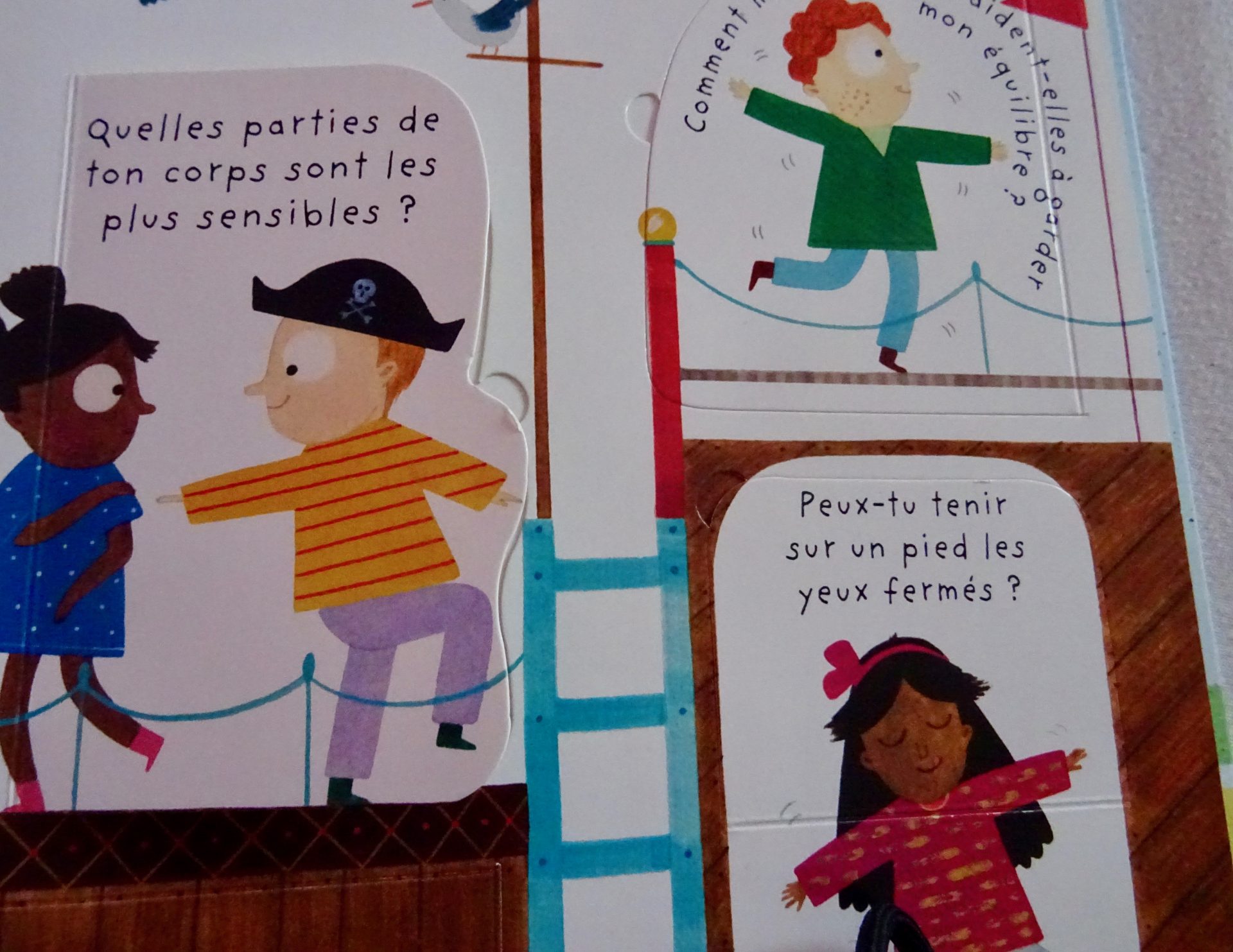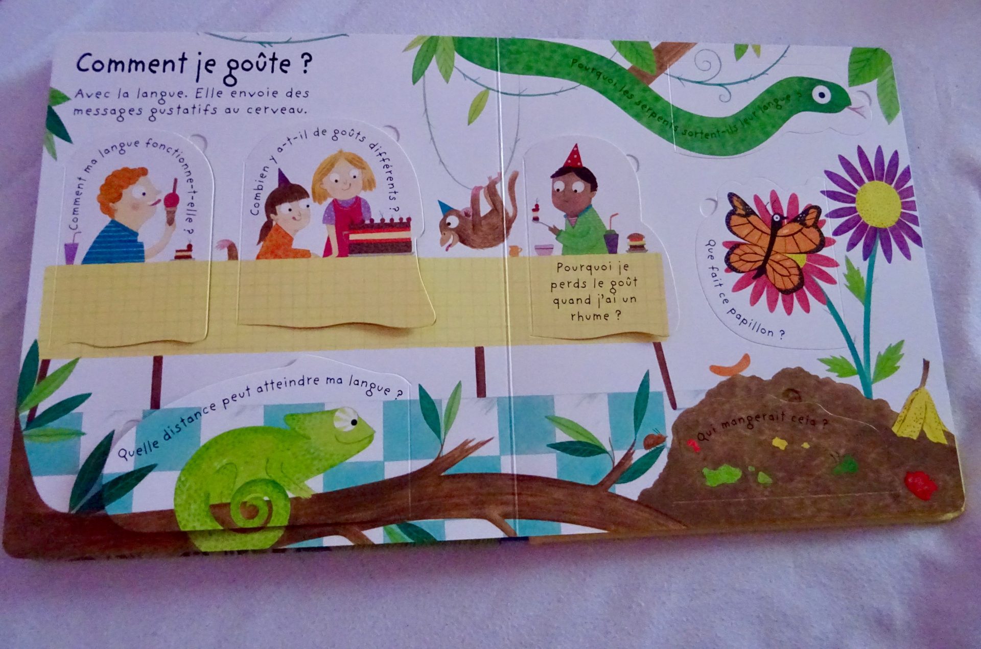 Ce livre aborde les 5 sens ( l’ouïe, le touché, le goût, l’odorat, la vue), il suscite et éveille également la curiosité de l’enfant avec ces questions et leurs rabats pour découvrir la réponse.