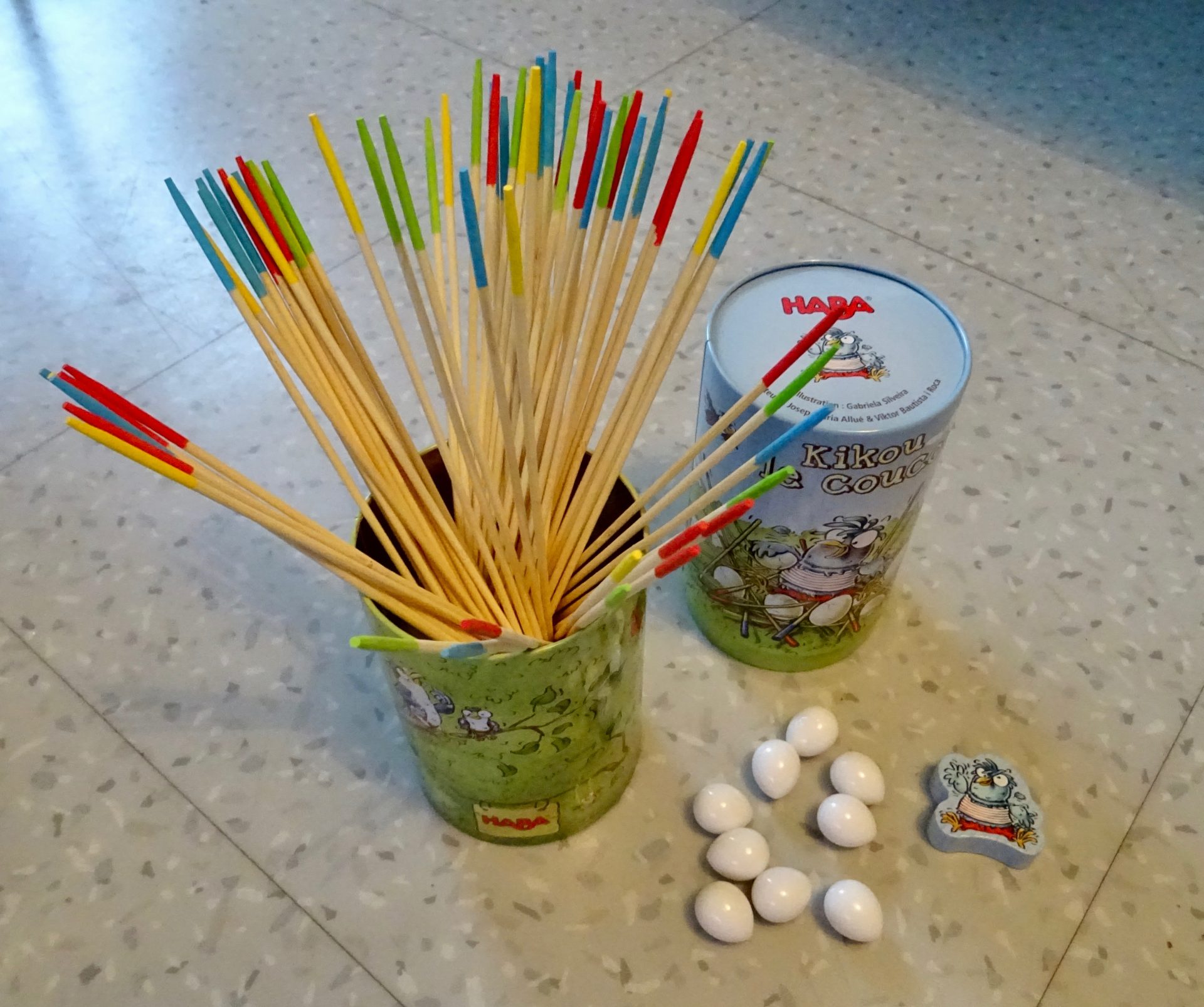 • 1 boîte de rangement en fer (la partie basse sert de support de jeu : la base du nid), 70 baguettes en bois et 20 œufs de coucou avec bien sur kikou le coucou.