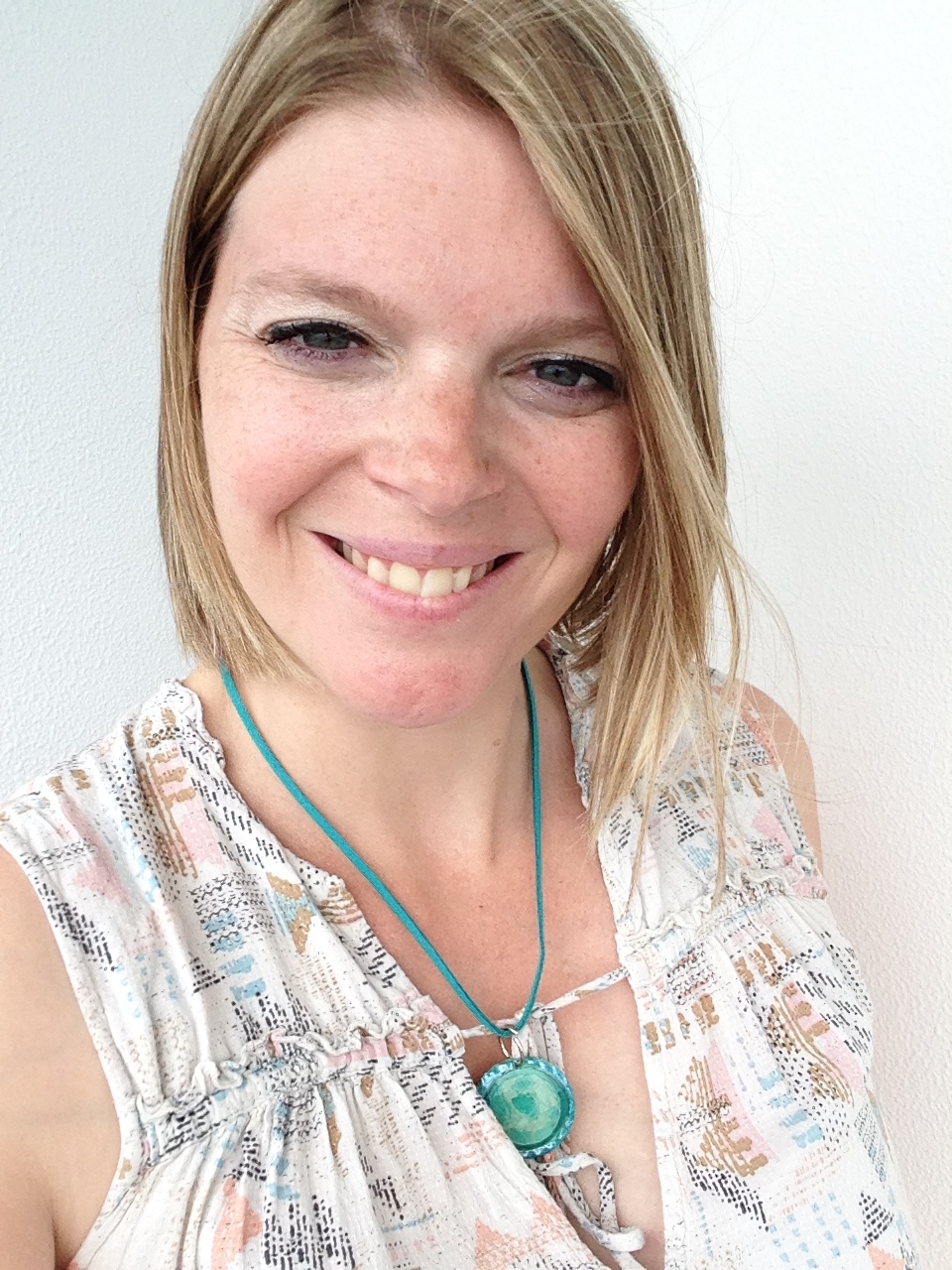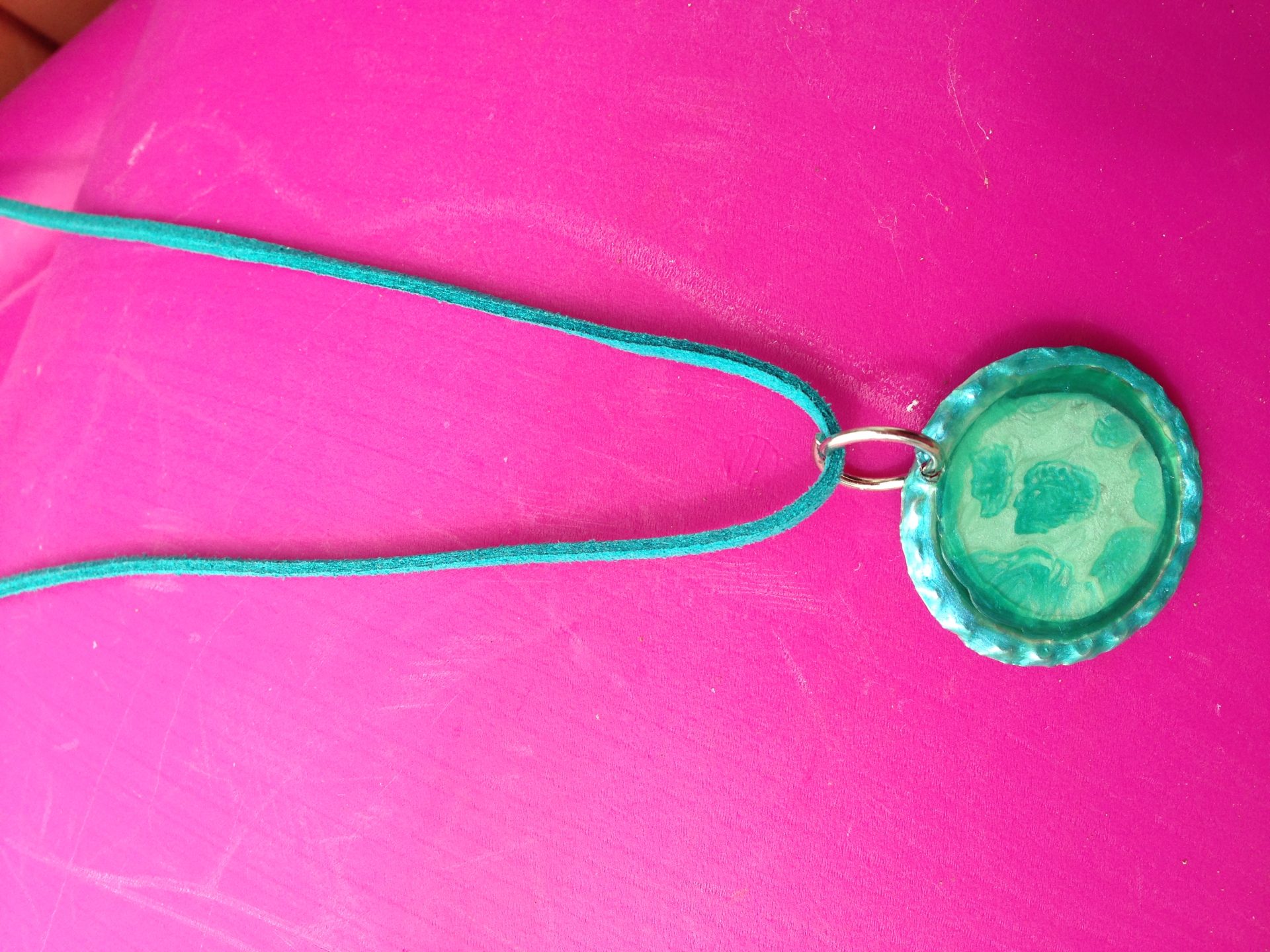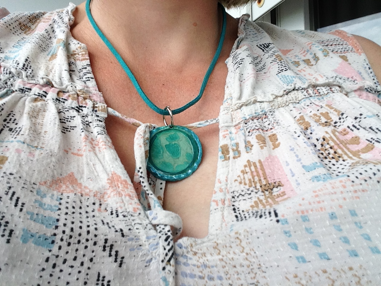 Le collier est aussi un essai ( très réussi) réalisé avec de la peinture prisme qu’elle a fait pour la première fois.