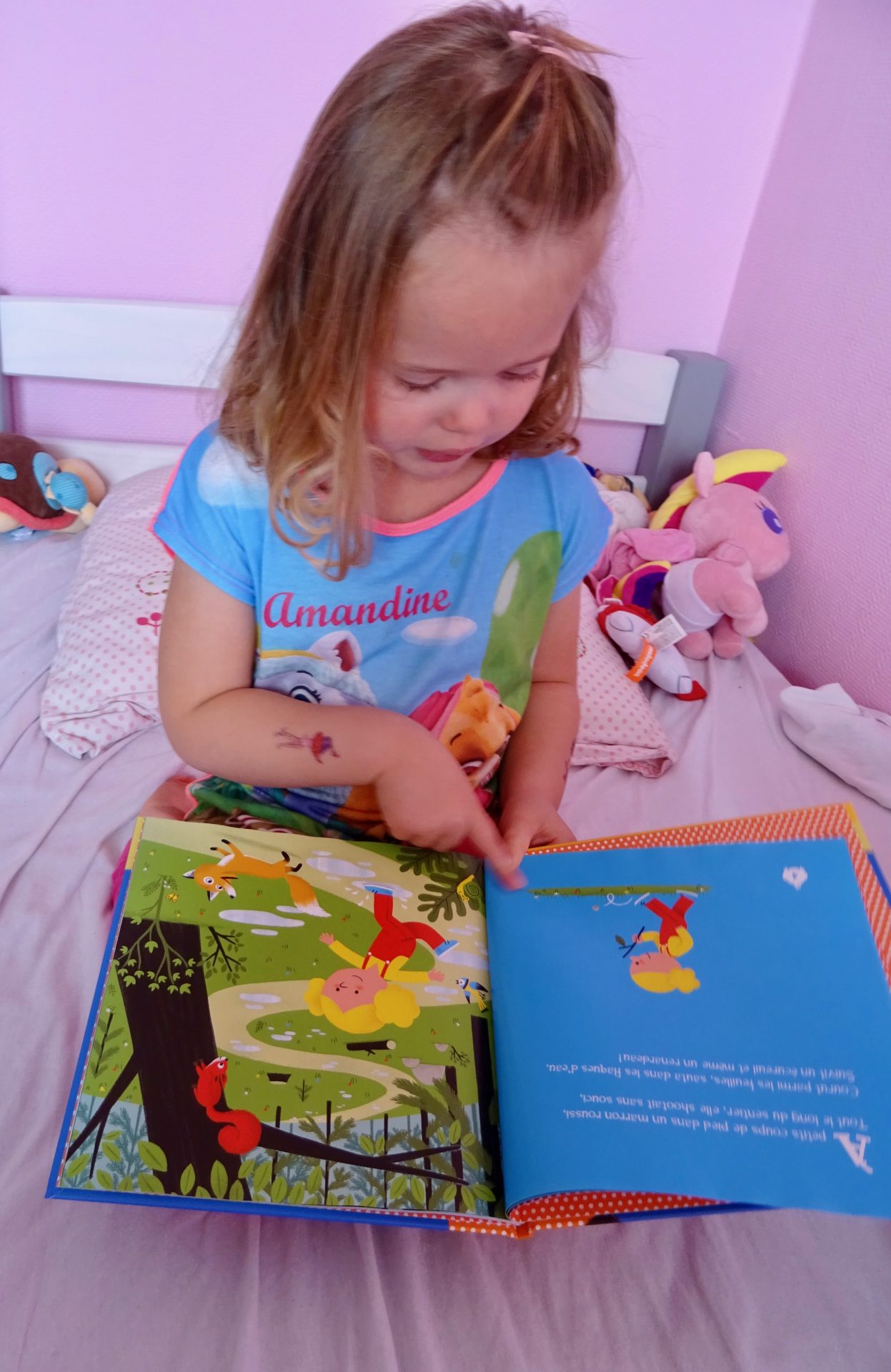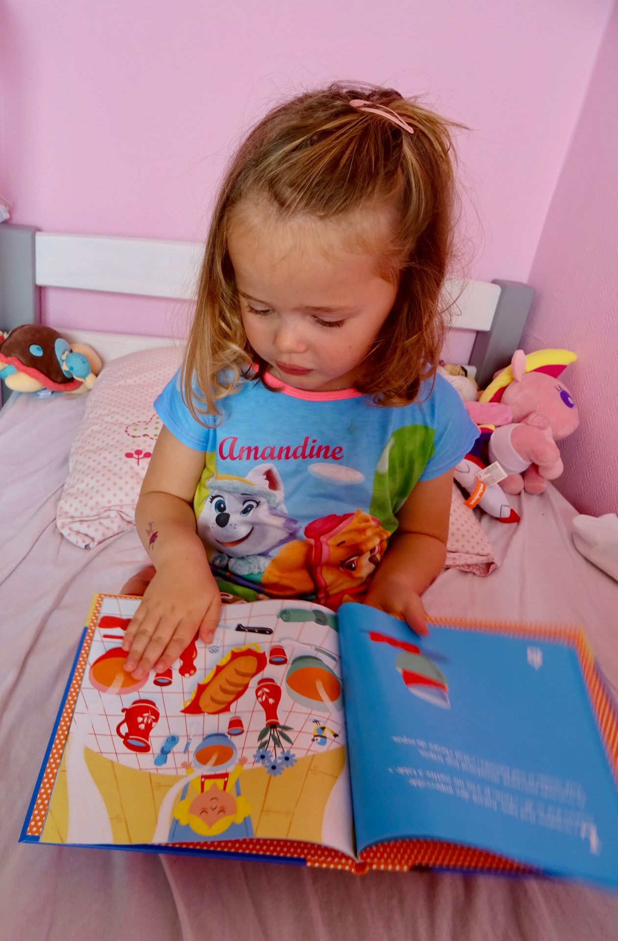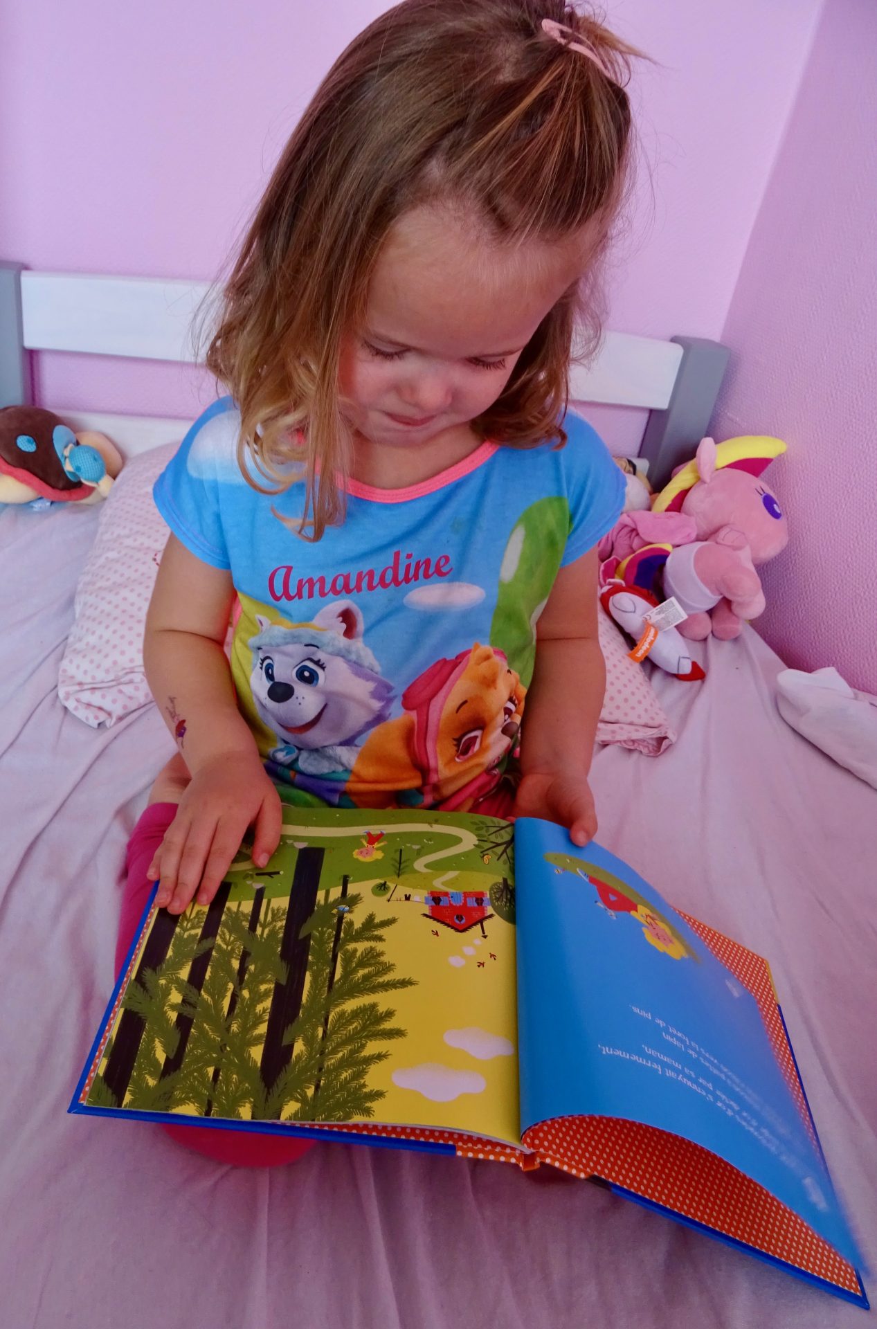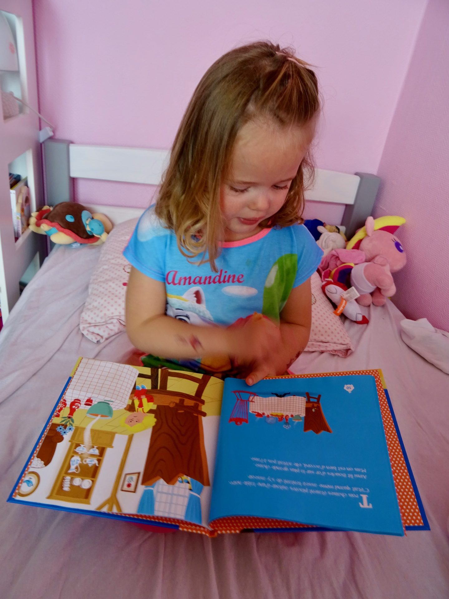 Voici chipie en train de feuilletée les pages et la raconter tout simplement avec ses mots, car c’est une histoire tellement facile et connue qu’elle est vite mémorisée.