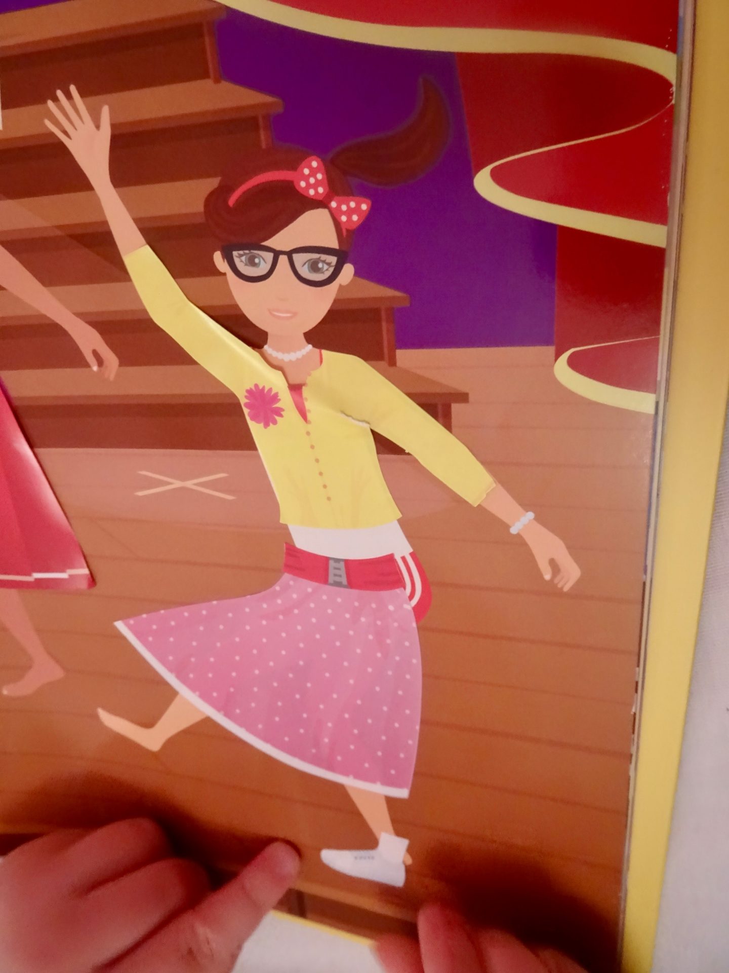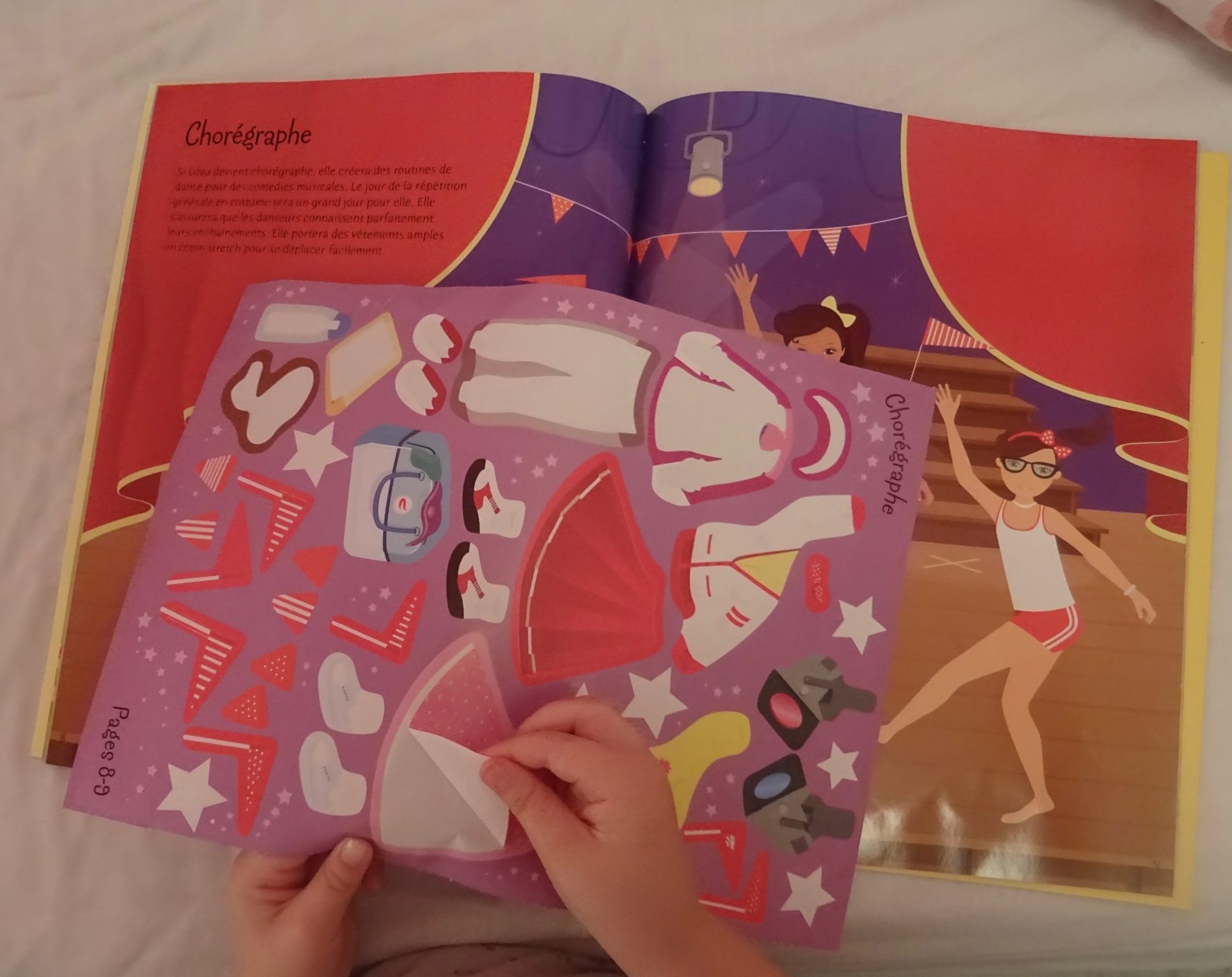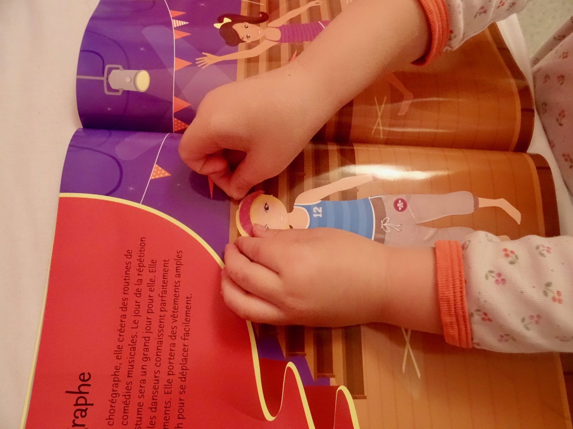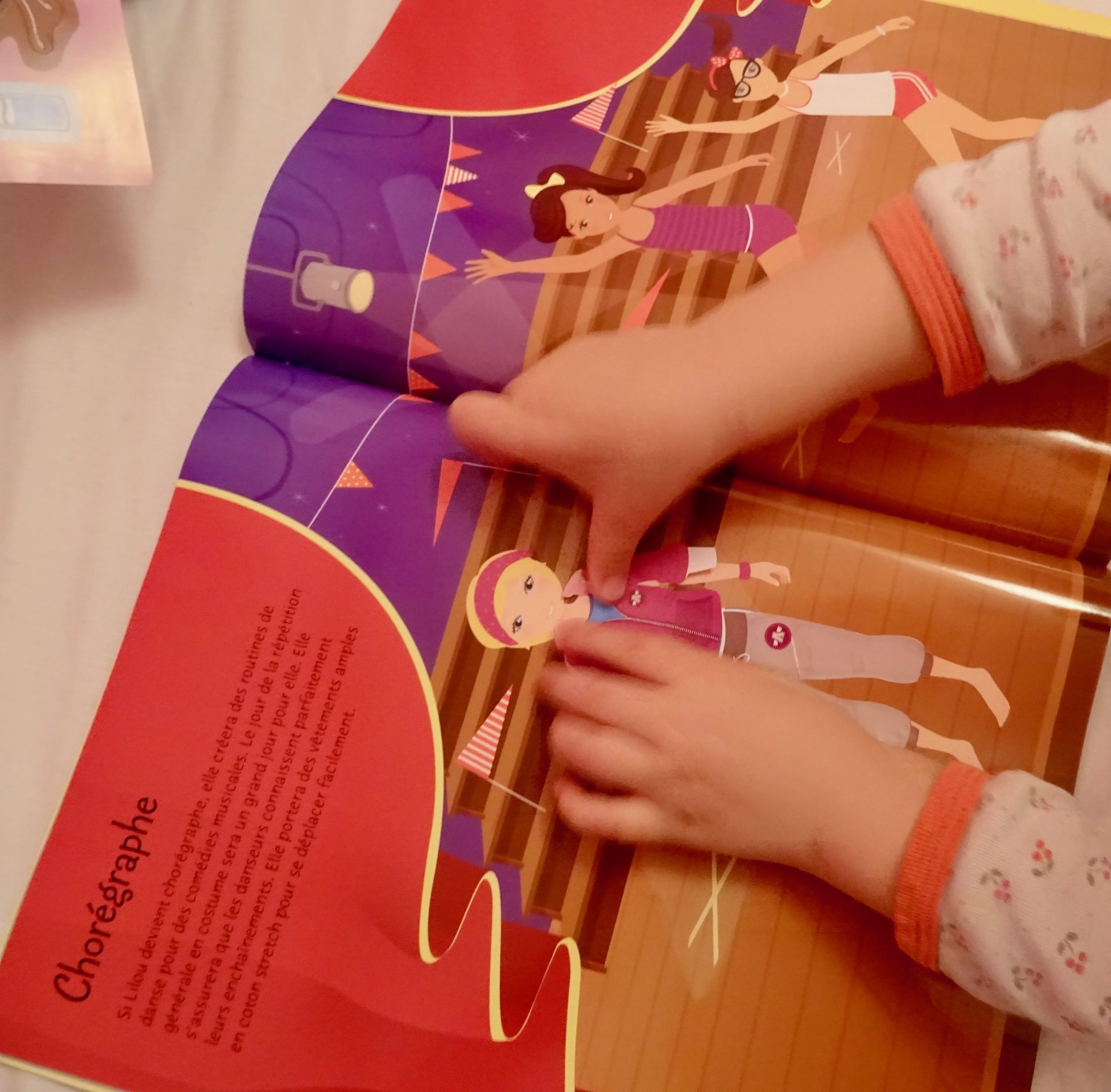 C’est parti pour la chorégraphe. On lit la petite histoire qui nous conte que Lilou la chorégraphe organise une comédie musicale où elle se prépare avec ses amies en essayant les costumes…