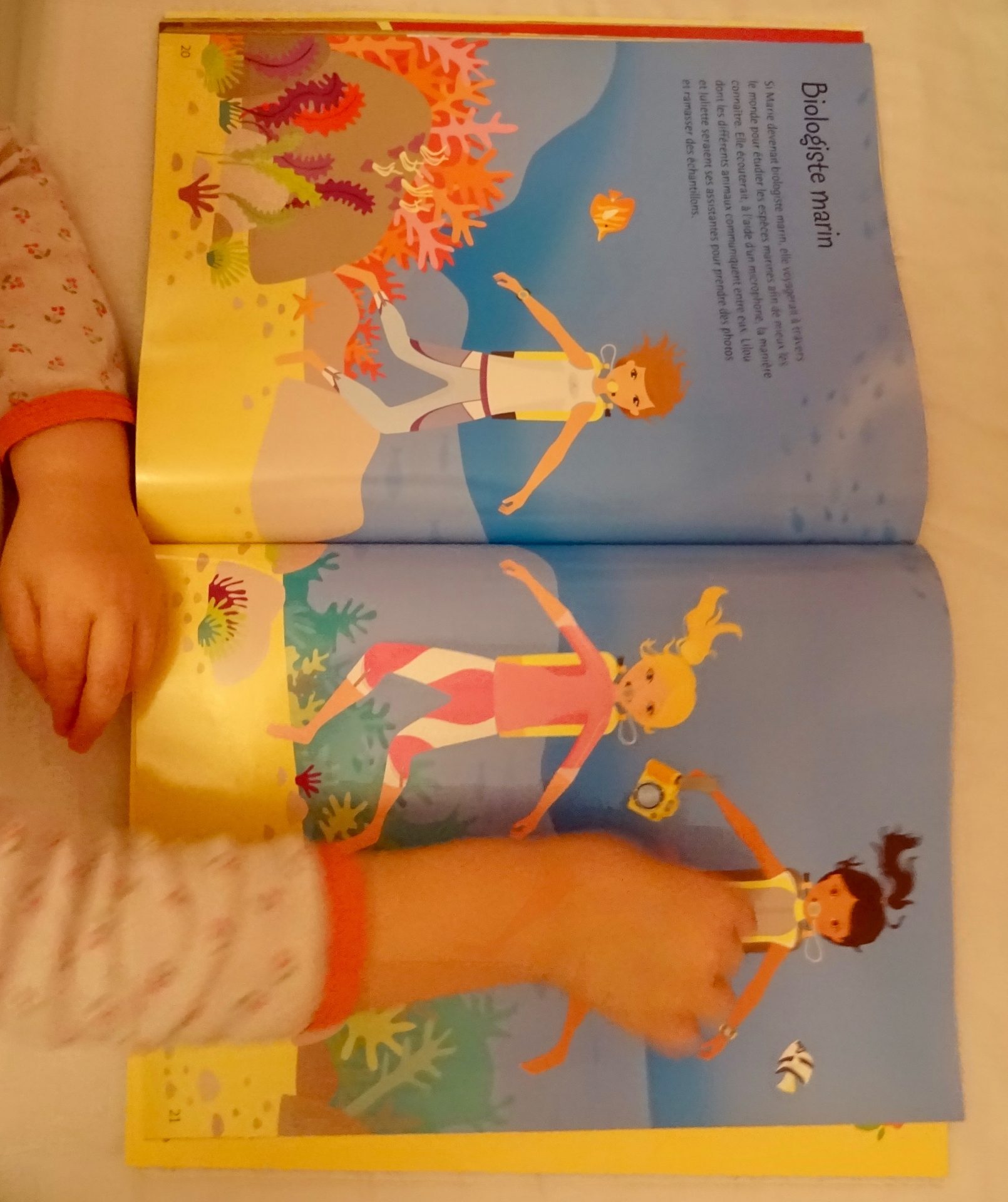 On commence par lire lire l’histoire et on fait connaissance avec Lilou, Marie et Juliette, 3 bonnes amies qui rêvent des métiers qu’elles aimeraient exercer plus tard.