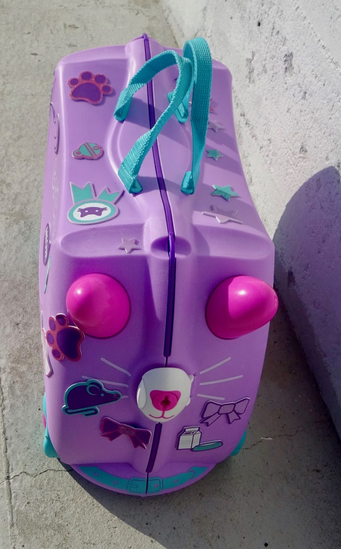 Toute ravie de pouvoir tester cette valise en forme de chat sur laquelle ont peut grimper dessus (charge 50kg) et rouler comme sur un trotteur…