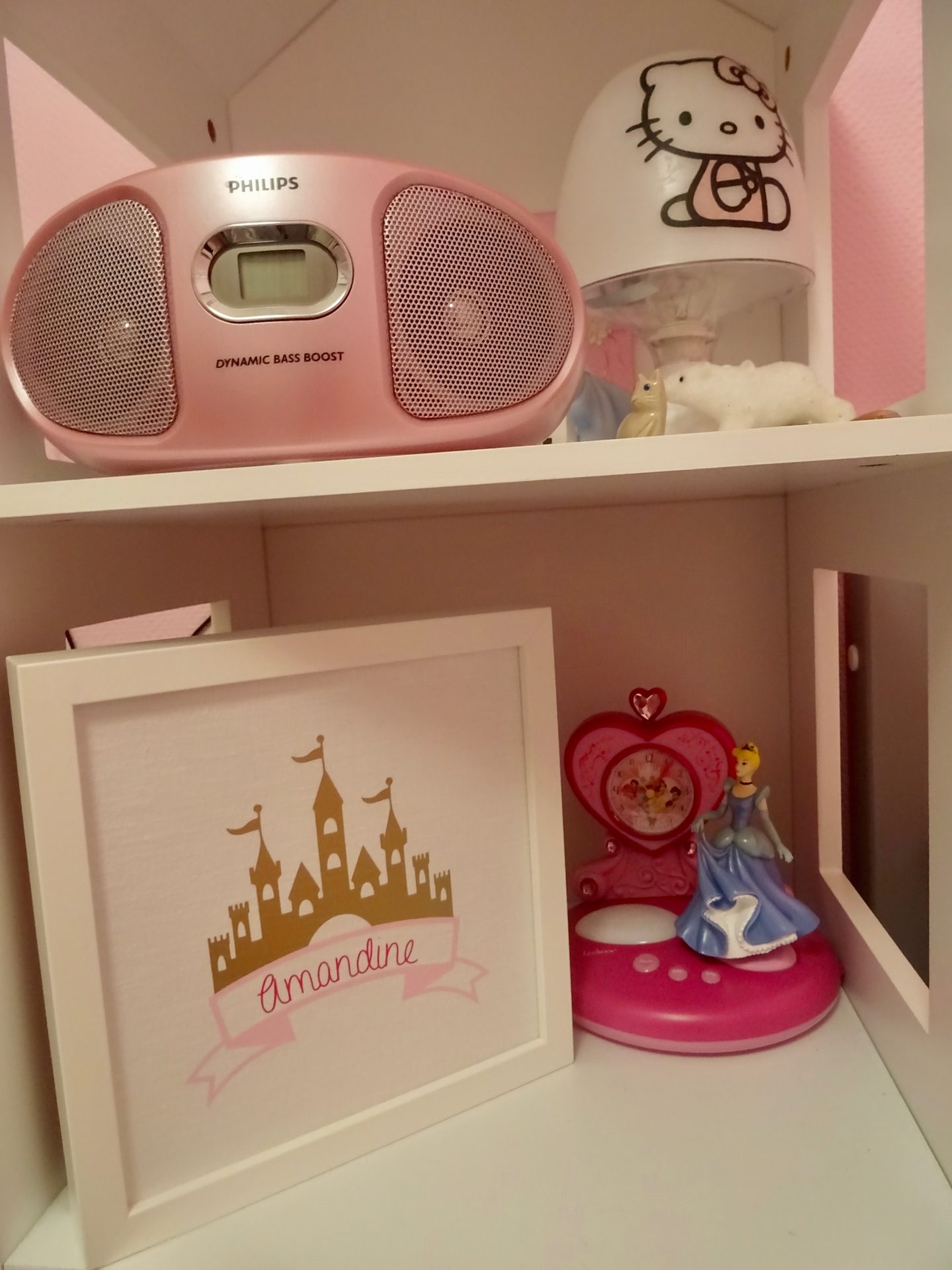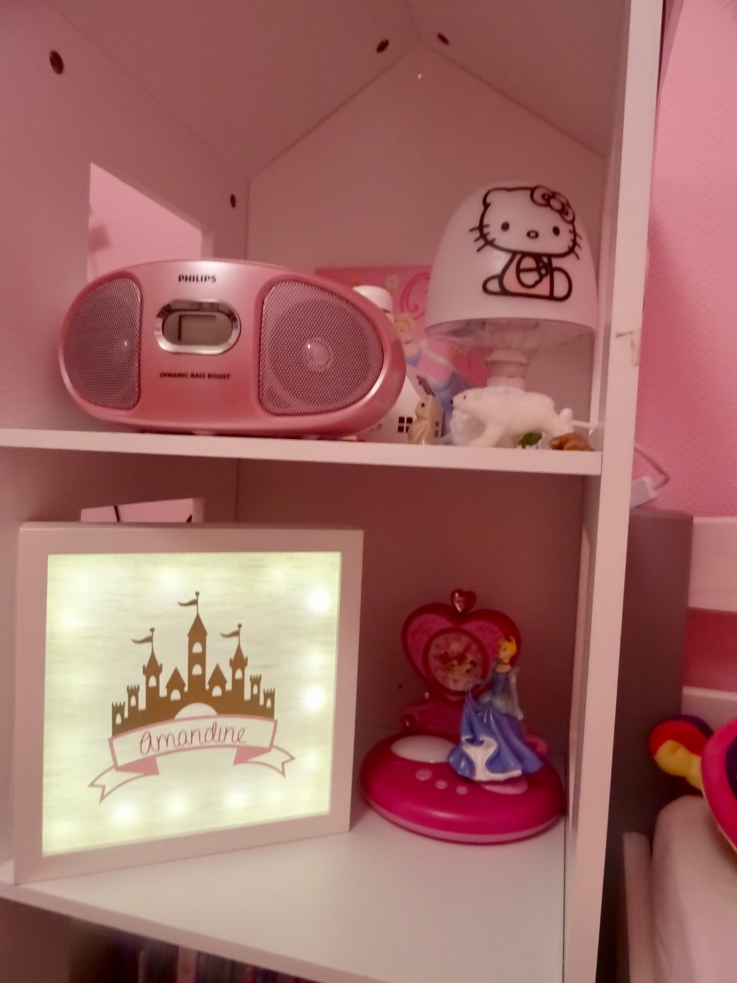 j’ai donc fait de la place sur son étagère placée à proximité de son lit afin qu’elle puisse l’allumer ou l’éteindre comme elle veut.