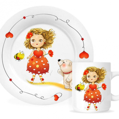 Cet ensemble Déjeuner contient : Un mug imprimé avec une jeune fille digne d’un compte de Charles Perrault. Un buste en forme de cœur et une fleur à la main. Un décors aux pays des merveilles ! Une assiette creuse imprimée sur fond blanc avec un chien ours laissant aller l’imagination des enfants. Et une assiette plate imprimée sur fond blanc avec la jeune fille et l’animal réuni !