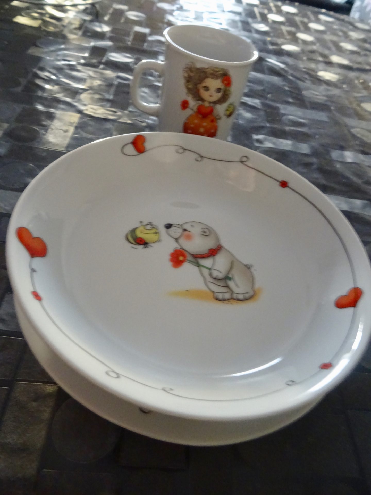 Alors bébé les services étaient en plastique, mais maintenant que chipie est grande, elle mange avec de vraies couverts et il était temps de laisser au placard les assiettes en plastique et floqué de ses héros préférés.