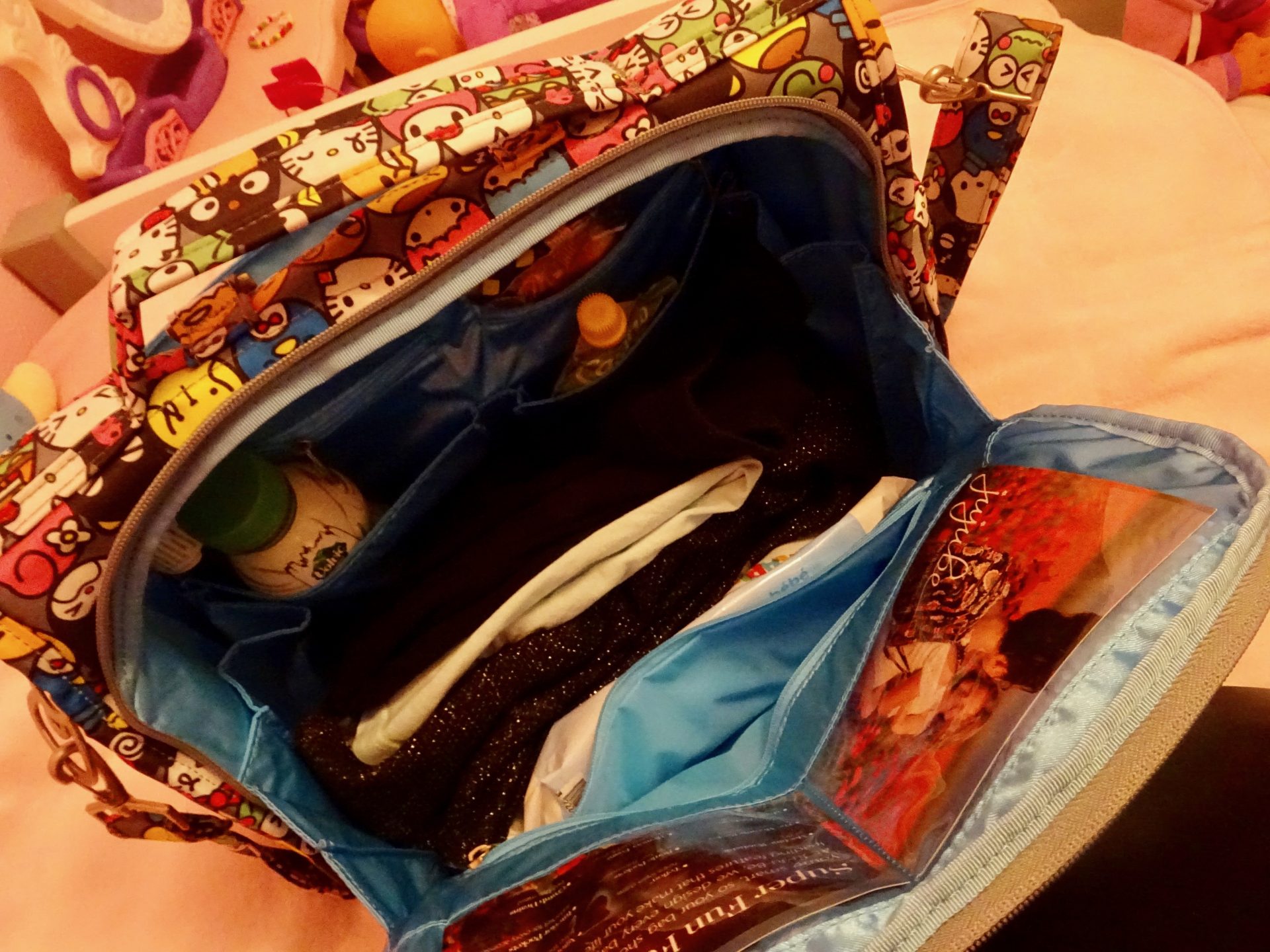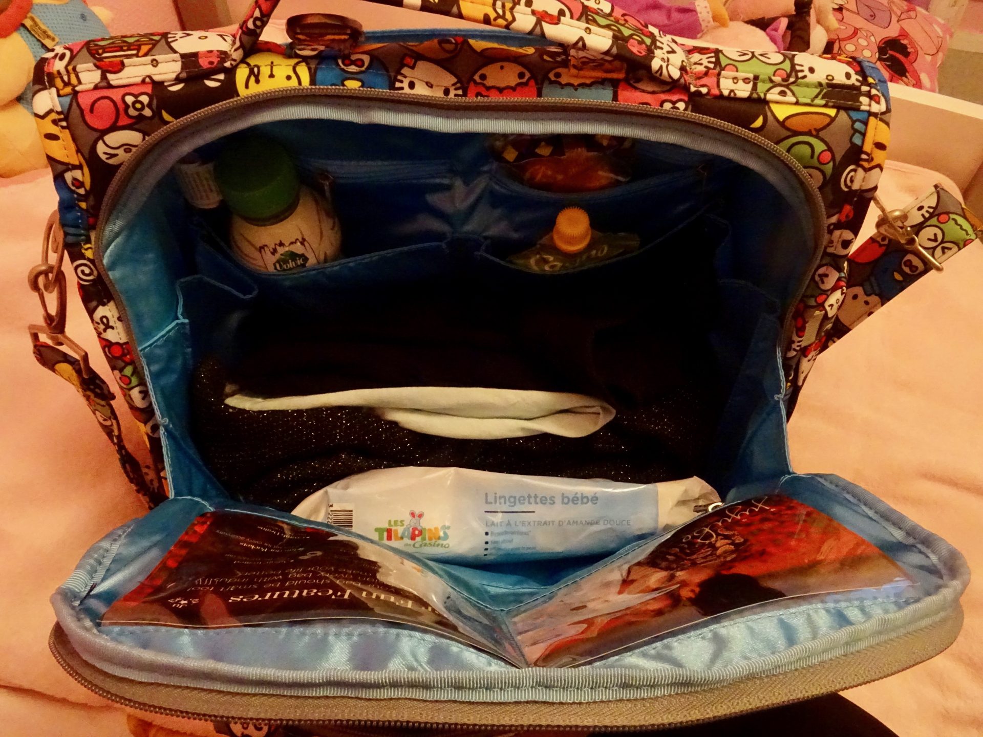 et oui dans la pochette avant, j’y est glissé ces lingettes, ses tétines, doudous et un jeu de cartes et même le goûter!