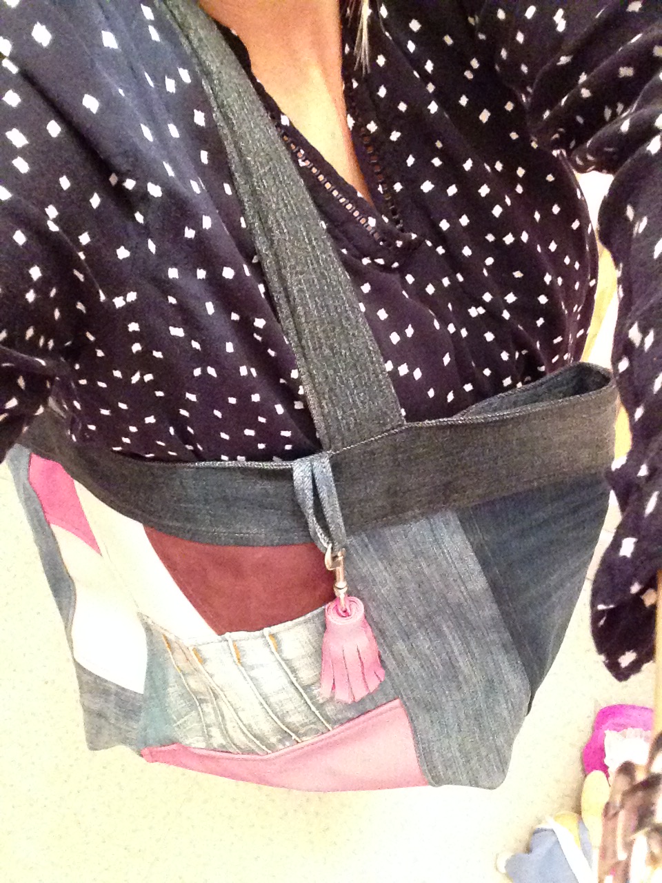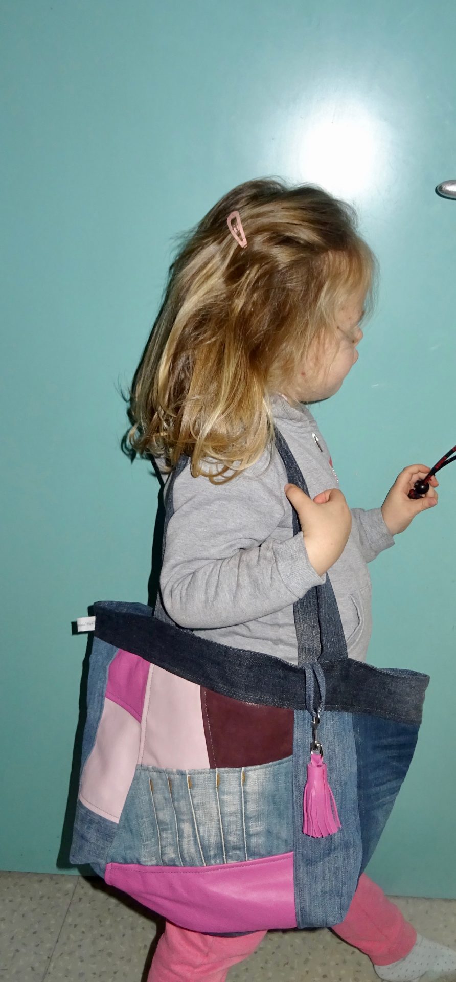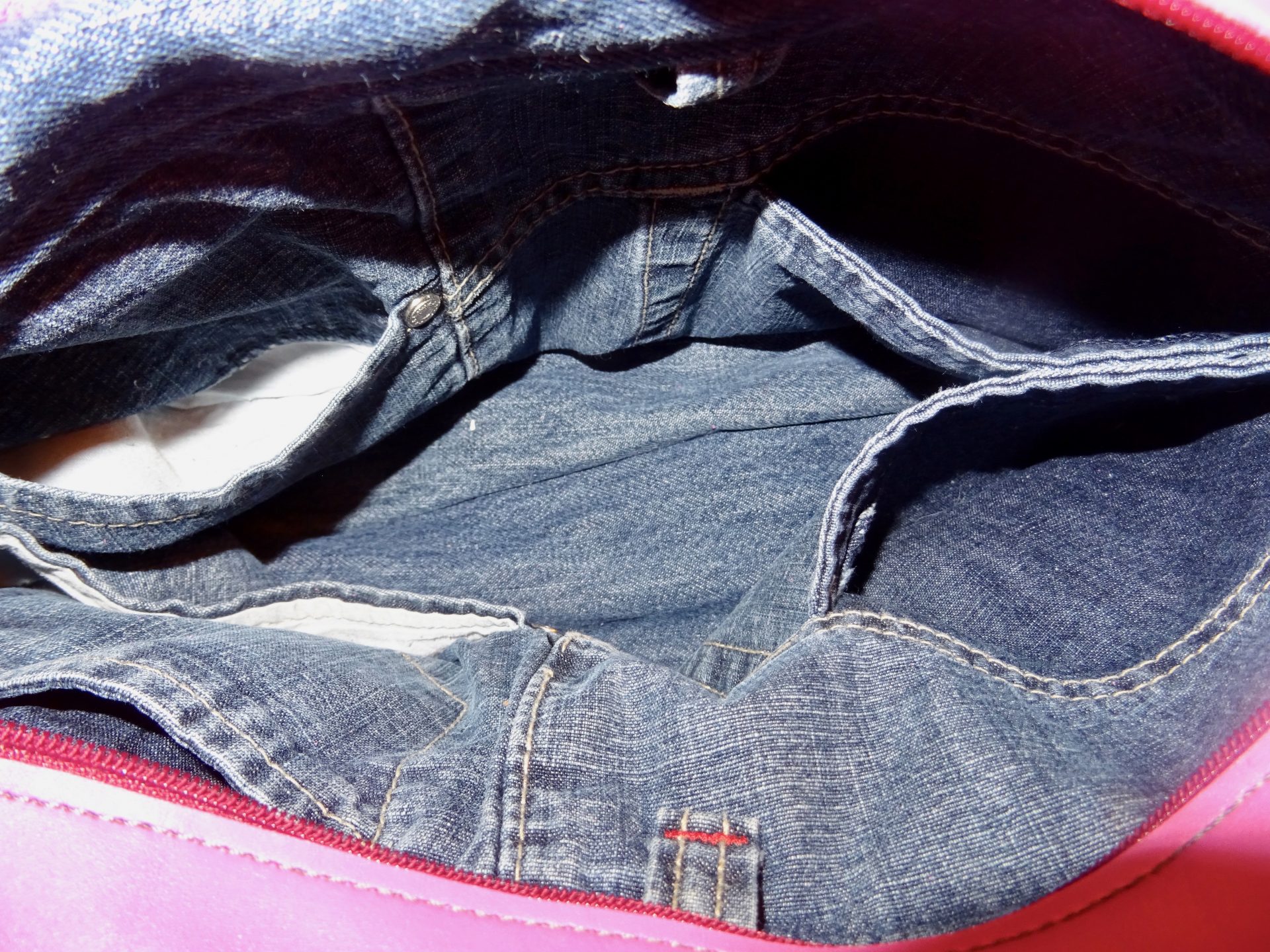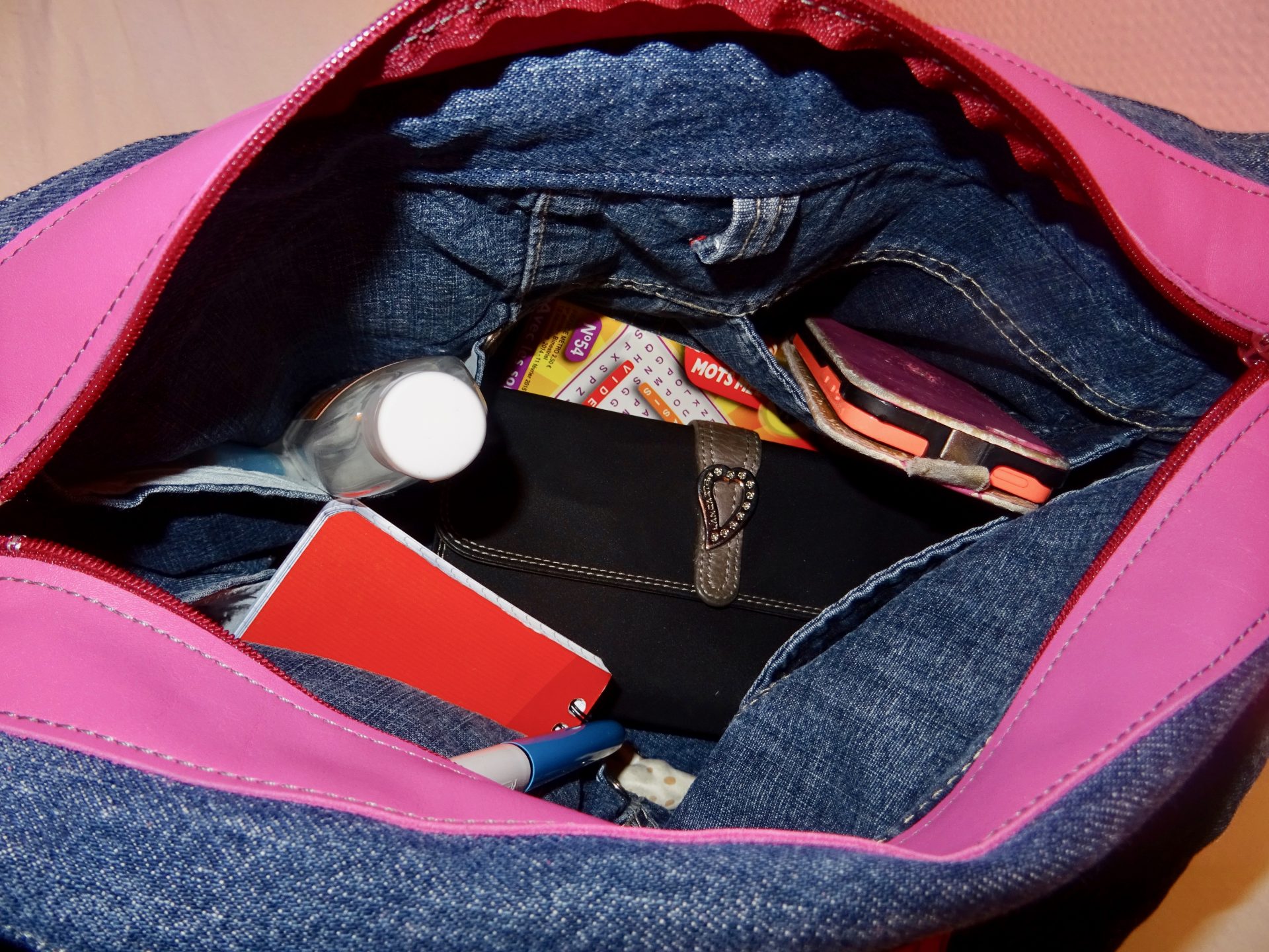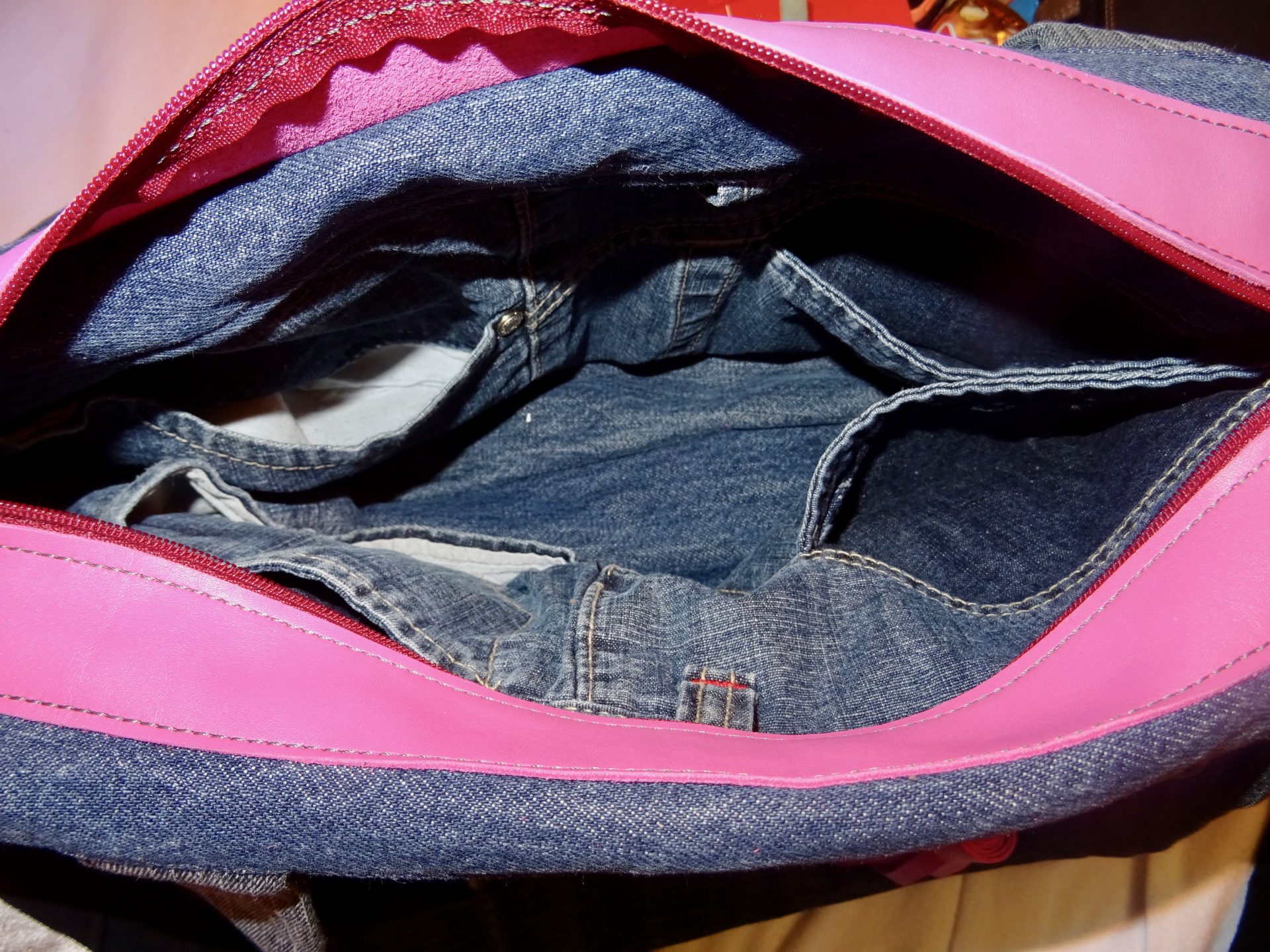 Les poches de l’ancien jean sont recyclées en pochettes de rangement interne, tout ce que j’aime…