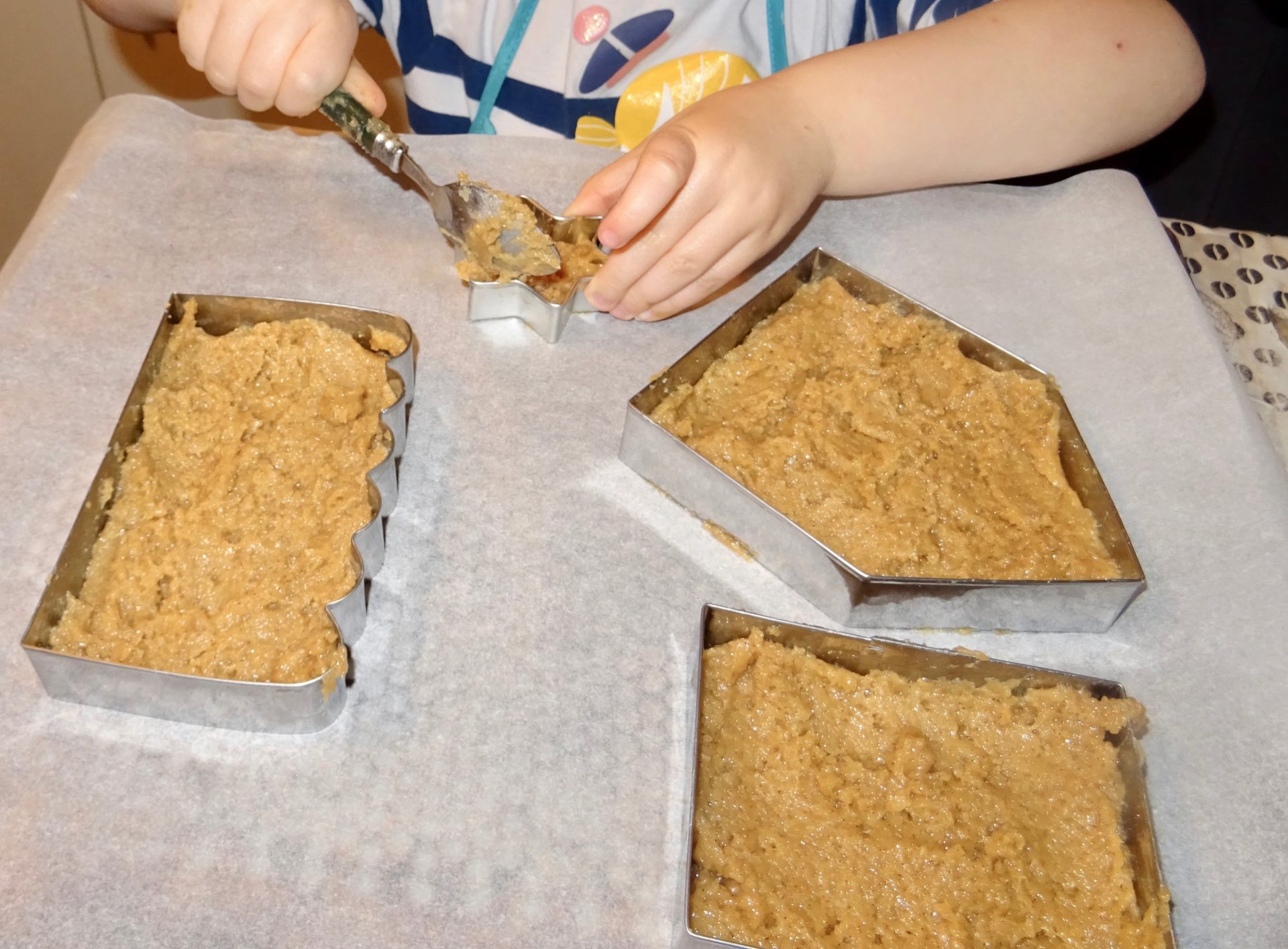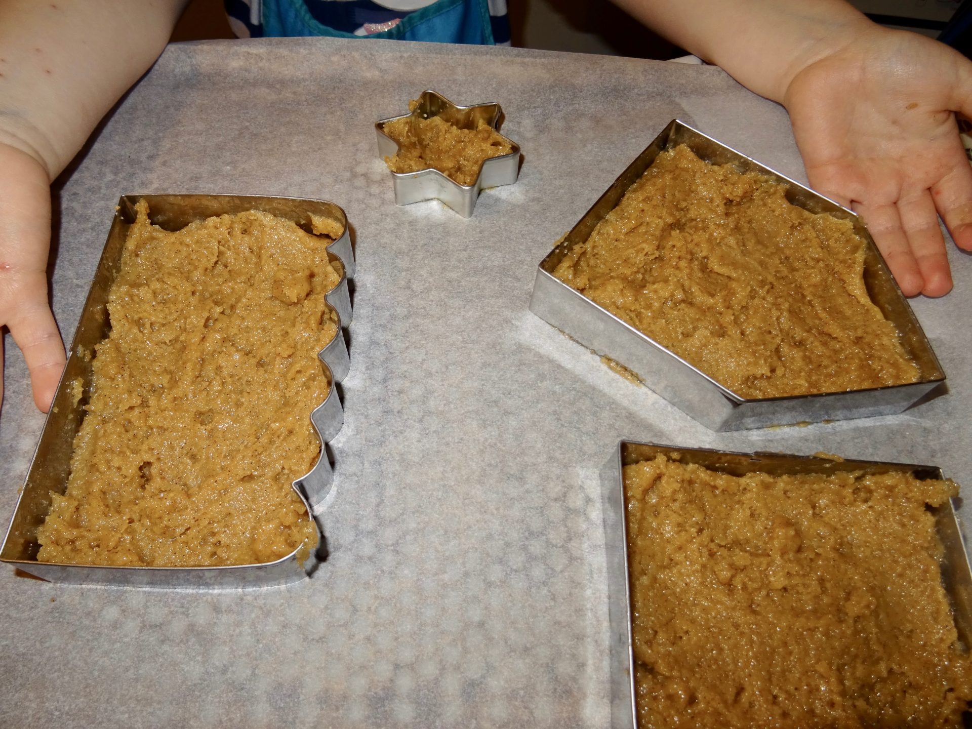 Deux façon de faire soit faire une grande plaque de pâte de pain d’épices et découper une fois cuit avec les découpoirs, soit notre option qui fonctionne aussi, faire cuire la pâte comme dans des moules… A vous de voir la méthode qui vous convient le mieux !