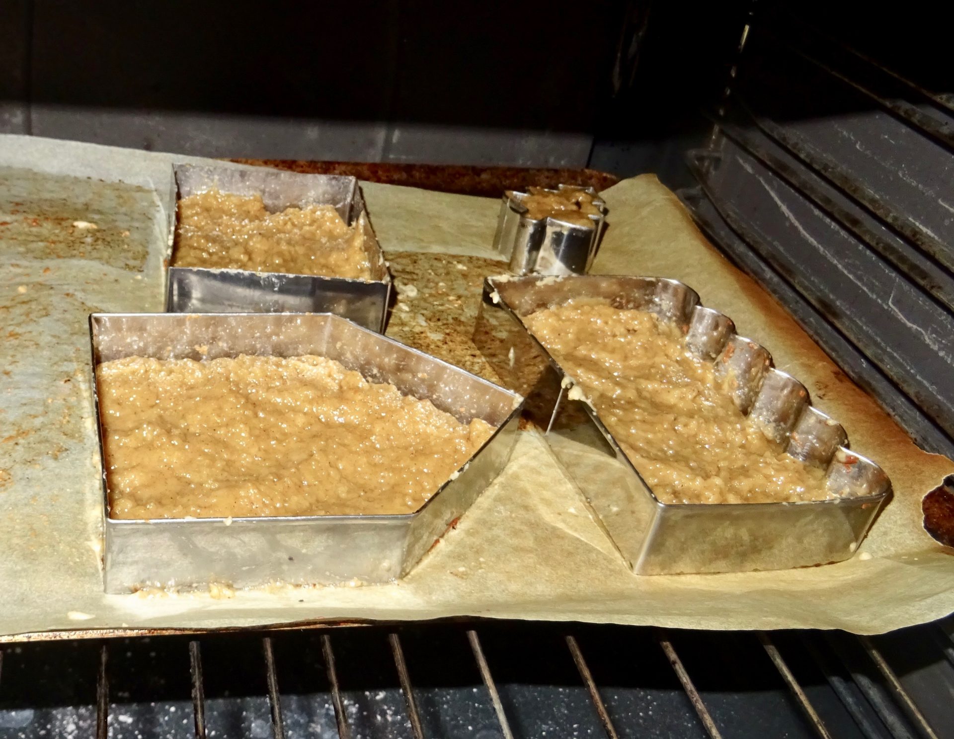 On dispose sur une plaque de cuisson du papier de cuisson avec les 3 découpoirs en inox qui constitue la structure de la maison ( il faudra don deux fournées).