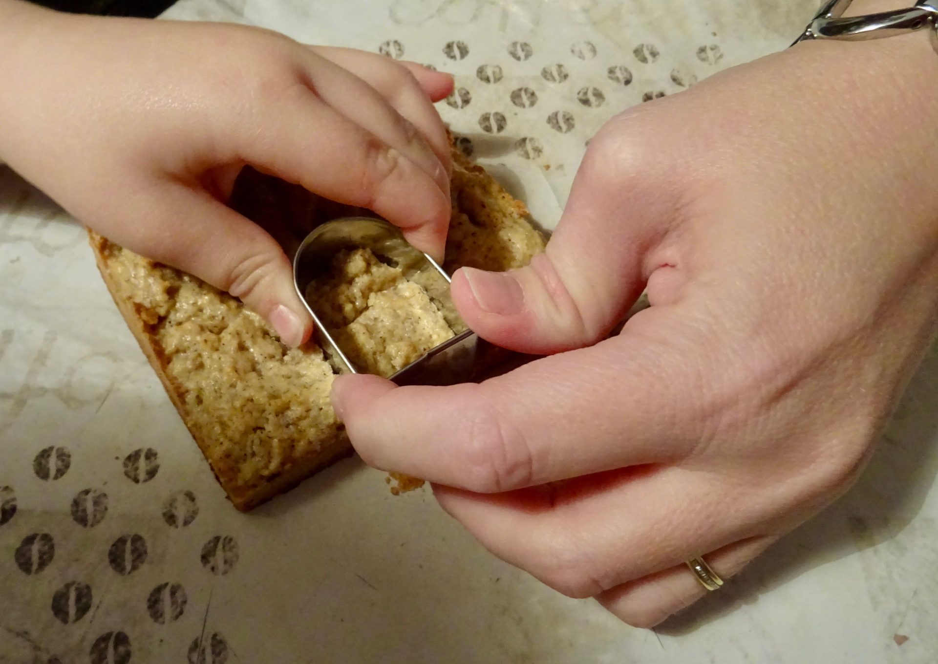 Il est donc temps de laisser refroidir notre première fournée pour en cuire une autre pour l’autre partie de la maison … Puis chipie en a profiter pour découper la petiote porte elle-même avec le découpoir prévu à cet effet !