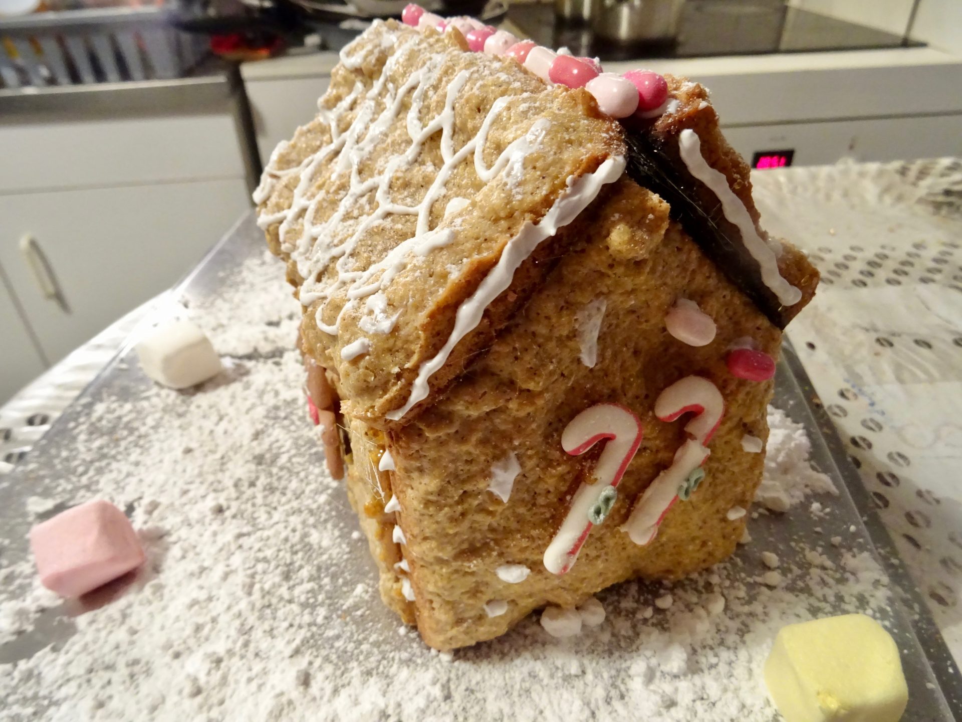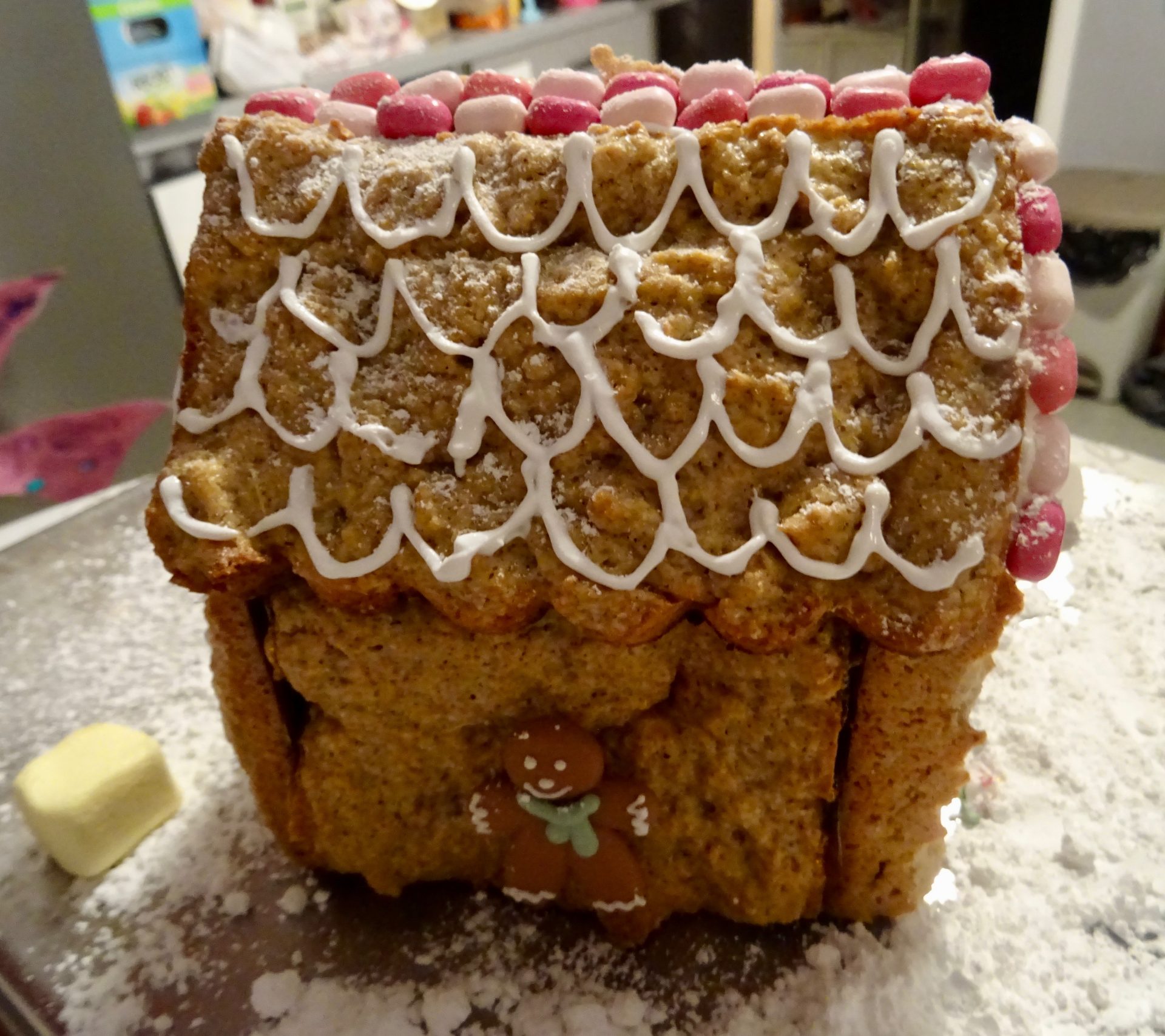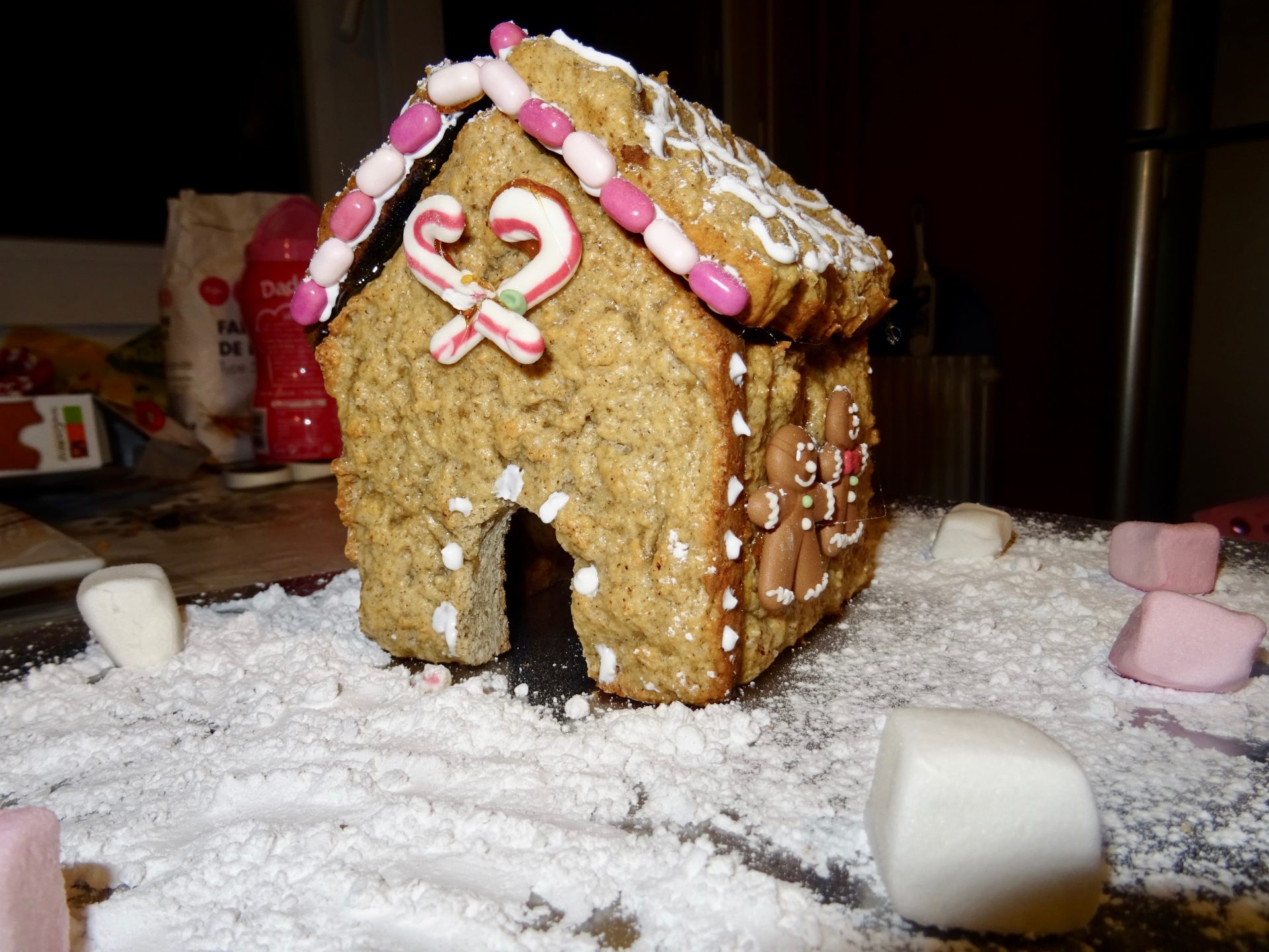 Ici une année ma mère avait acheté un kit pour en faire une mais les murs étaient déjà fait en biscuit, il fallait juste les « coller » oui ben les murs et toits n’étais pas super droit alors bon … ce fut une galère et c’est moi qui m’y suis collée aussi ! (merci maman !)