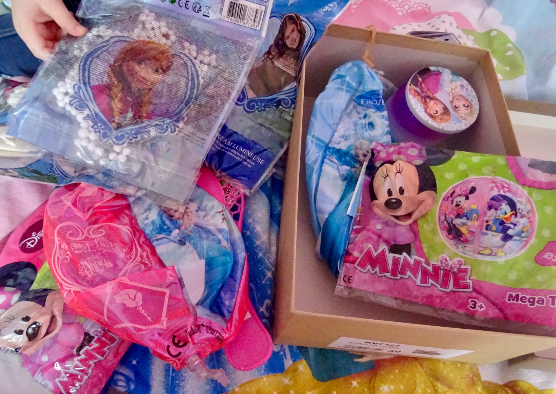 2 Tapball Peppa Pig – 1 Funny Twist Reine des neiges – 1 baguette magique Reine des neiges – 2 baguettes magiques lumineuses (une Pat Patrouille et une Reine des neiges ) – 1 maillet géant Cars – 1 crazy bumper Spiderman – 1 mega Tapball Minnie -1 sachet de 3 ballons géants gonflables Cars !