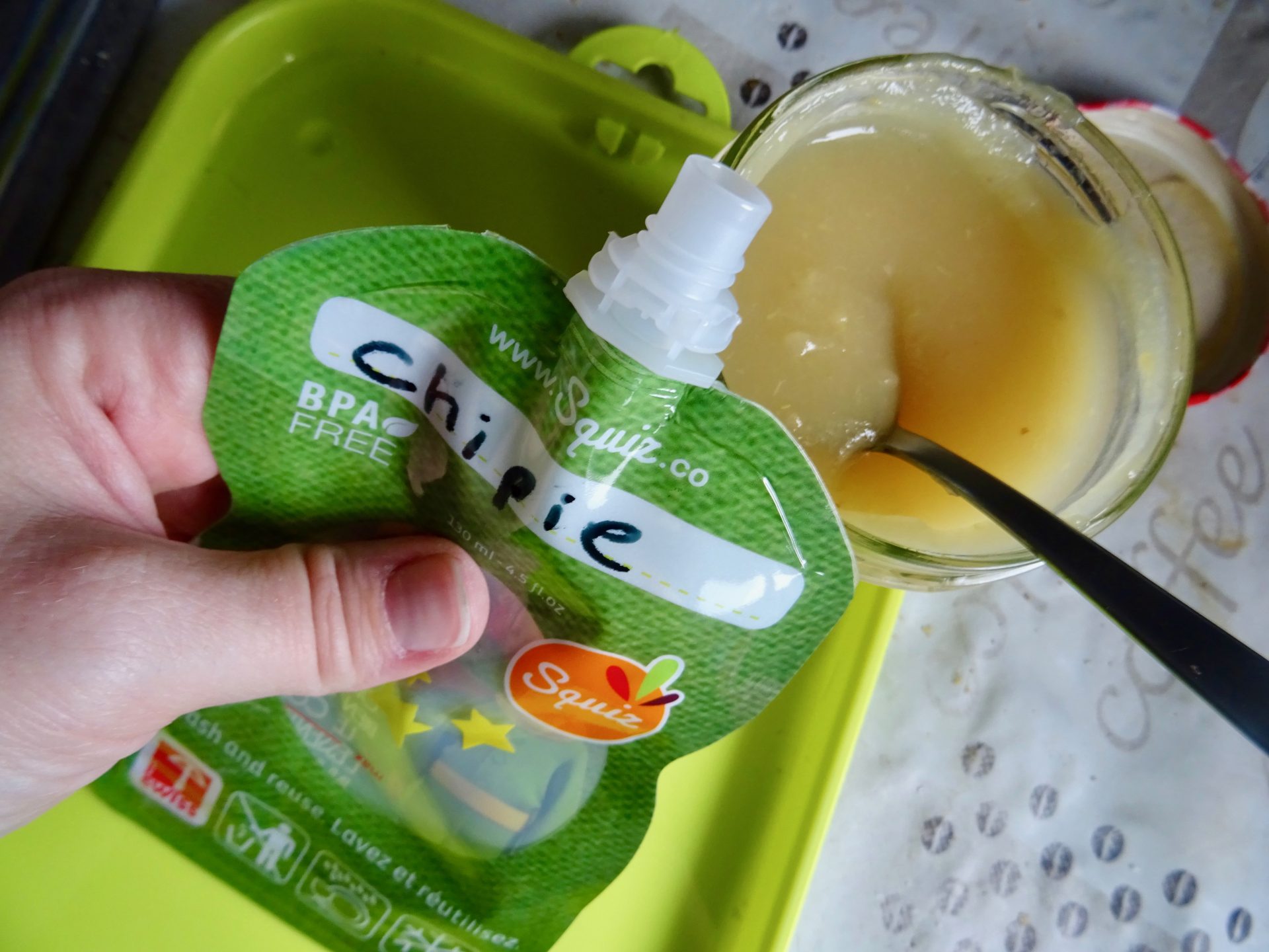 Squiz c’est la gourde réutilisable écolo, certifiée B Corp et fabriquée en Suisse, pour emporter les repas des bébés et encas des plus grands (compote, yaourt, purée).