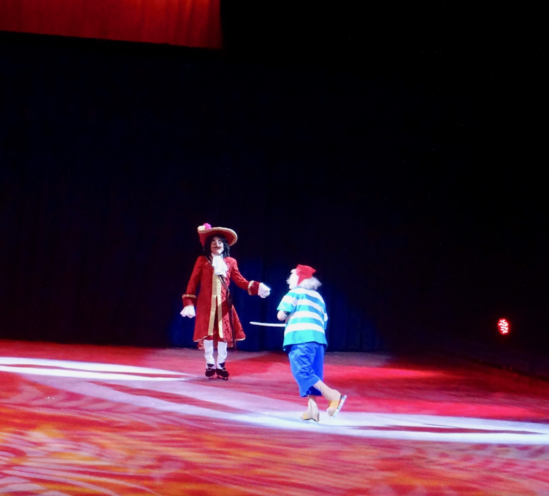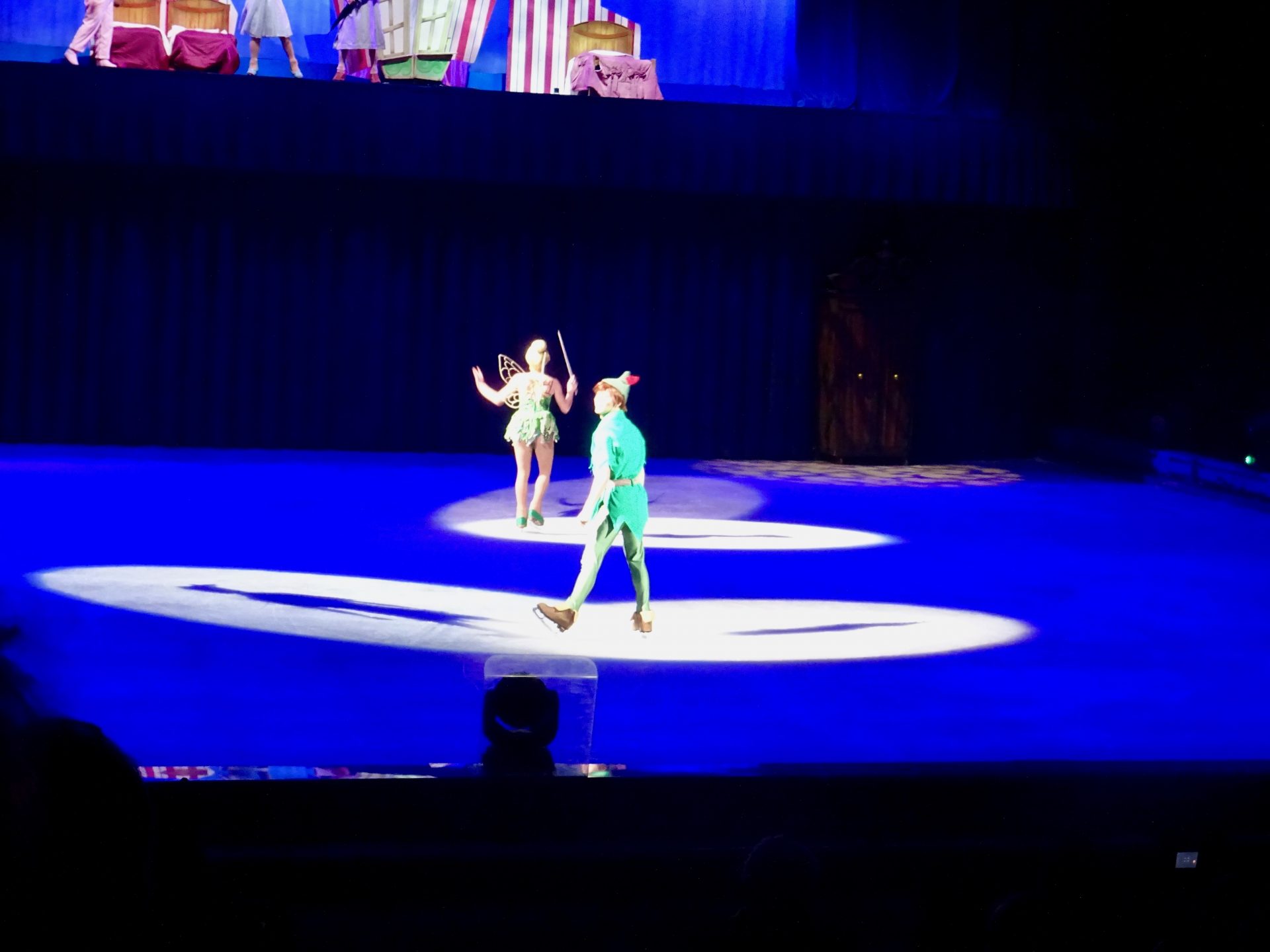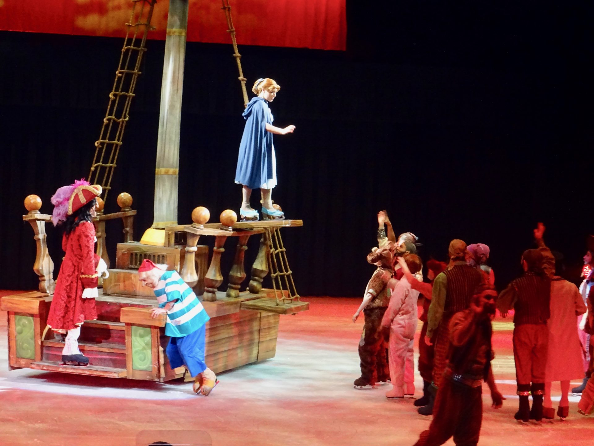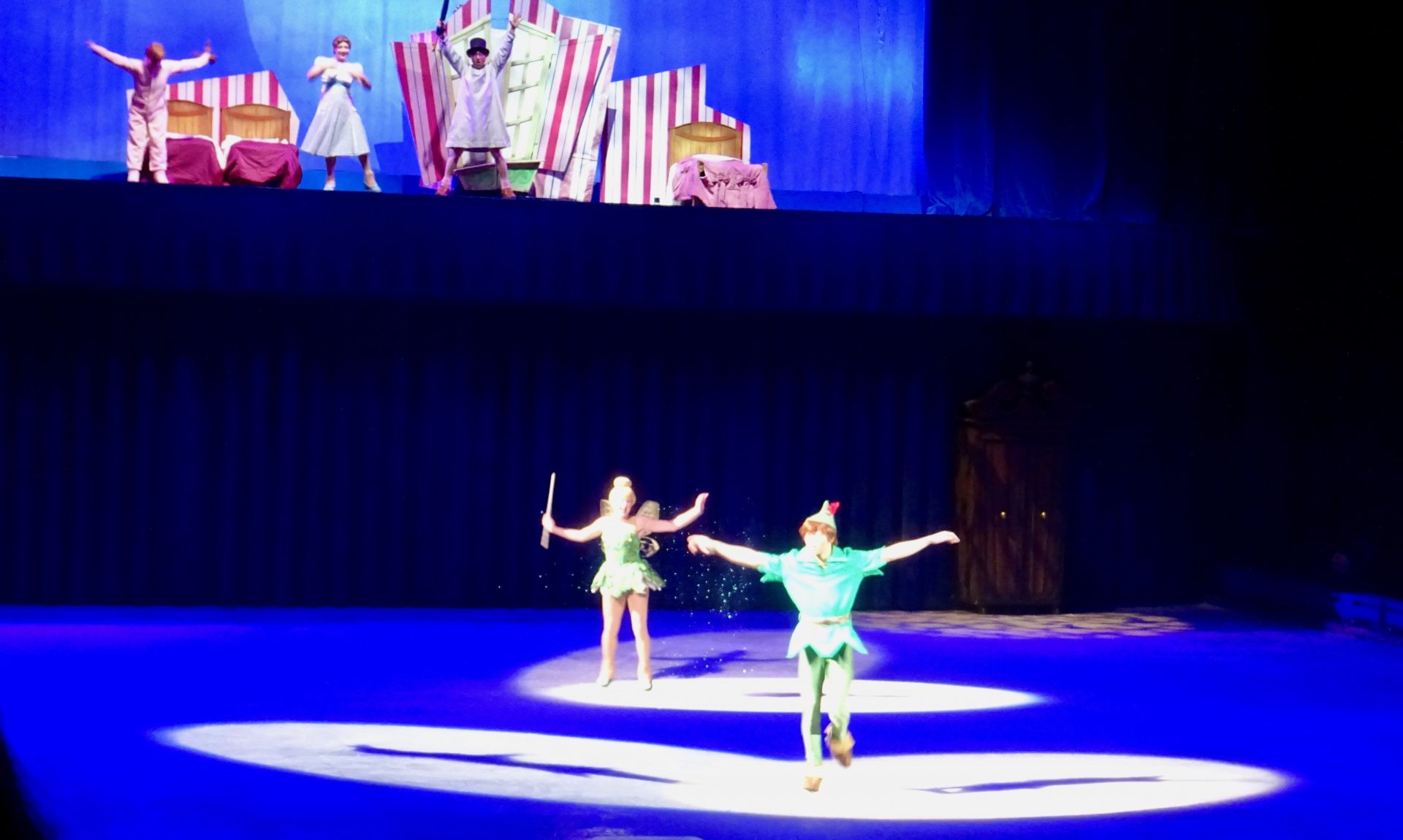 La première partie du spectacle dédié à Londres, Peter Pan, fée clochette et sa poudre magique, capitaine crochet, le conte des enfants perdus, le roi Lion et les personnages de Zootopie que ma chipie adore !