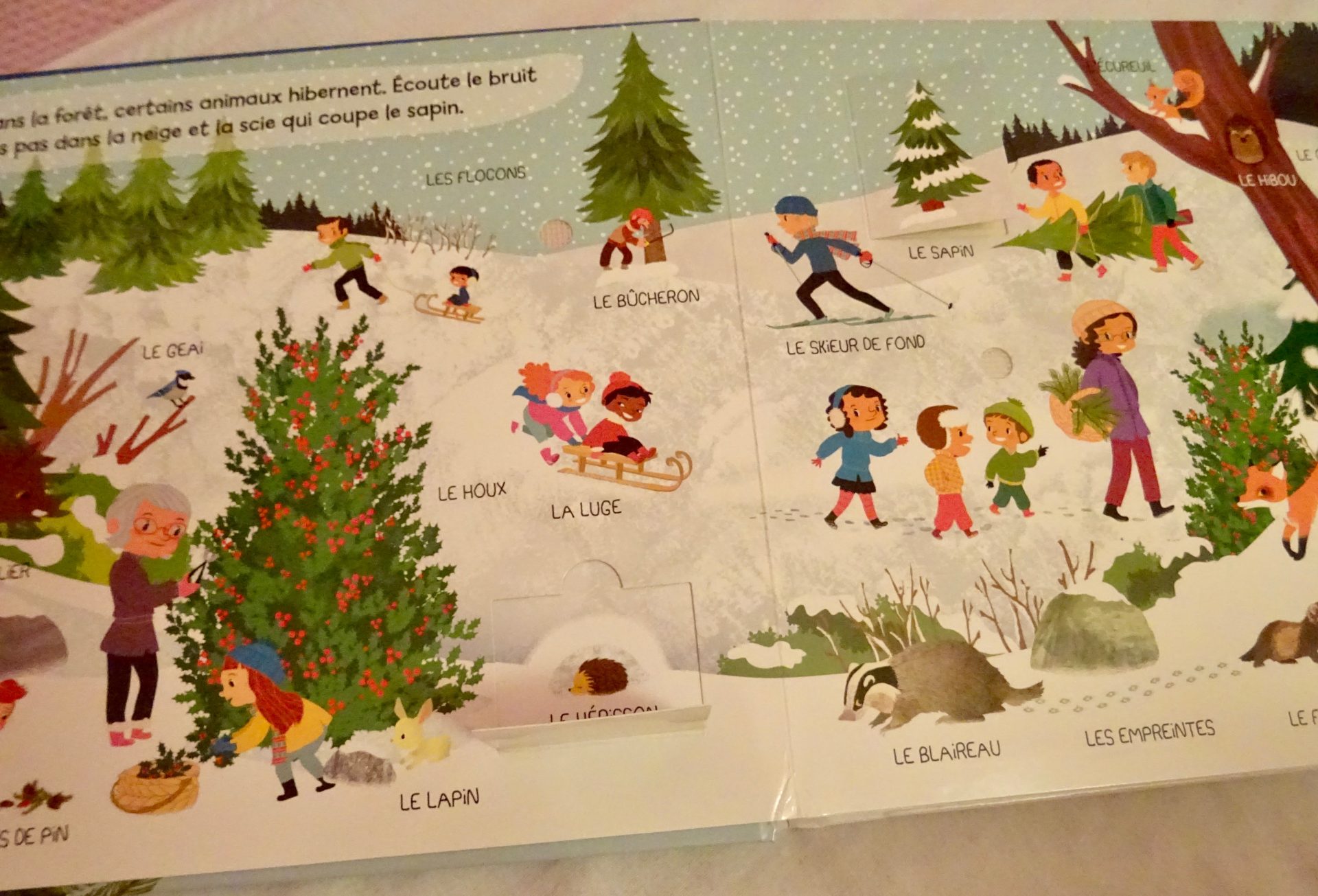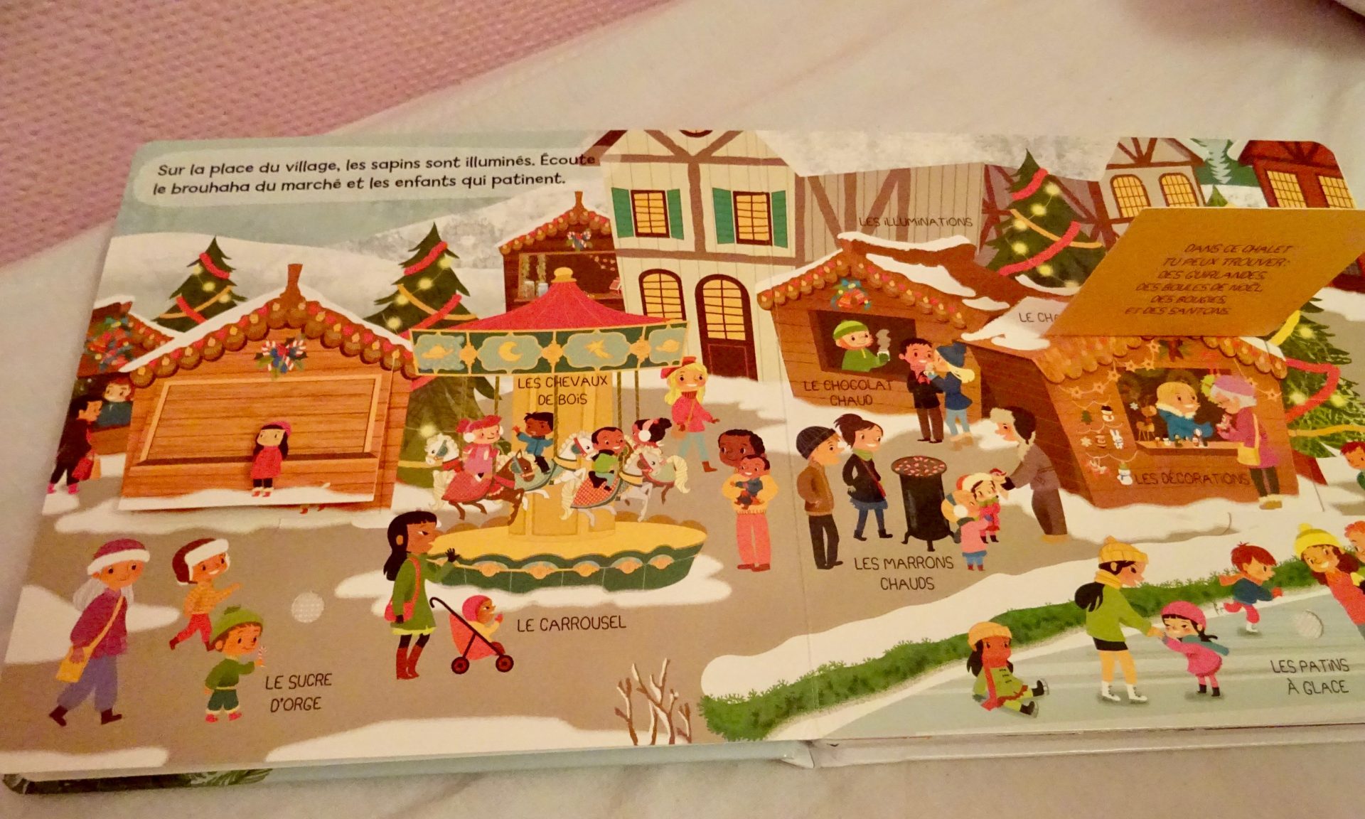 Toutes les activités de la saison de Noël sont illustrées : la forêt et ses sapins ; le marché de Noël ; les jeux et les batailles de boules de neige au parc ; la préparation de la soirée de Noël et bien sûr, l’arrivée du Père Noël et l’ouverture des cadeaux !