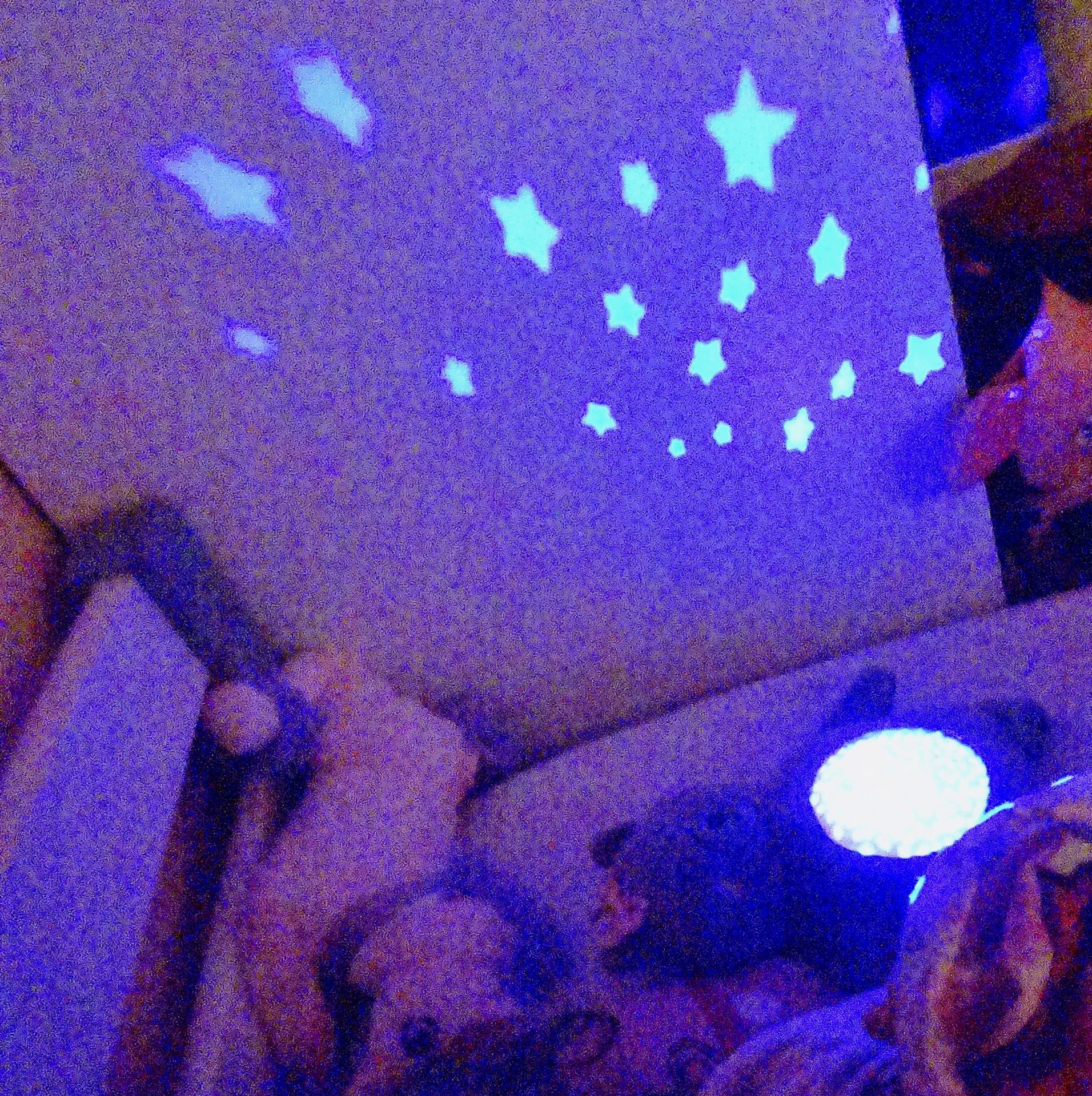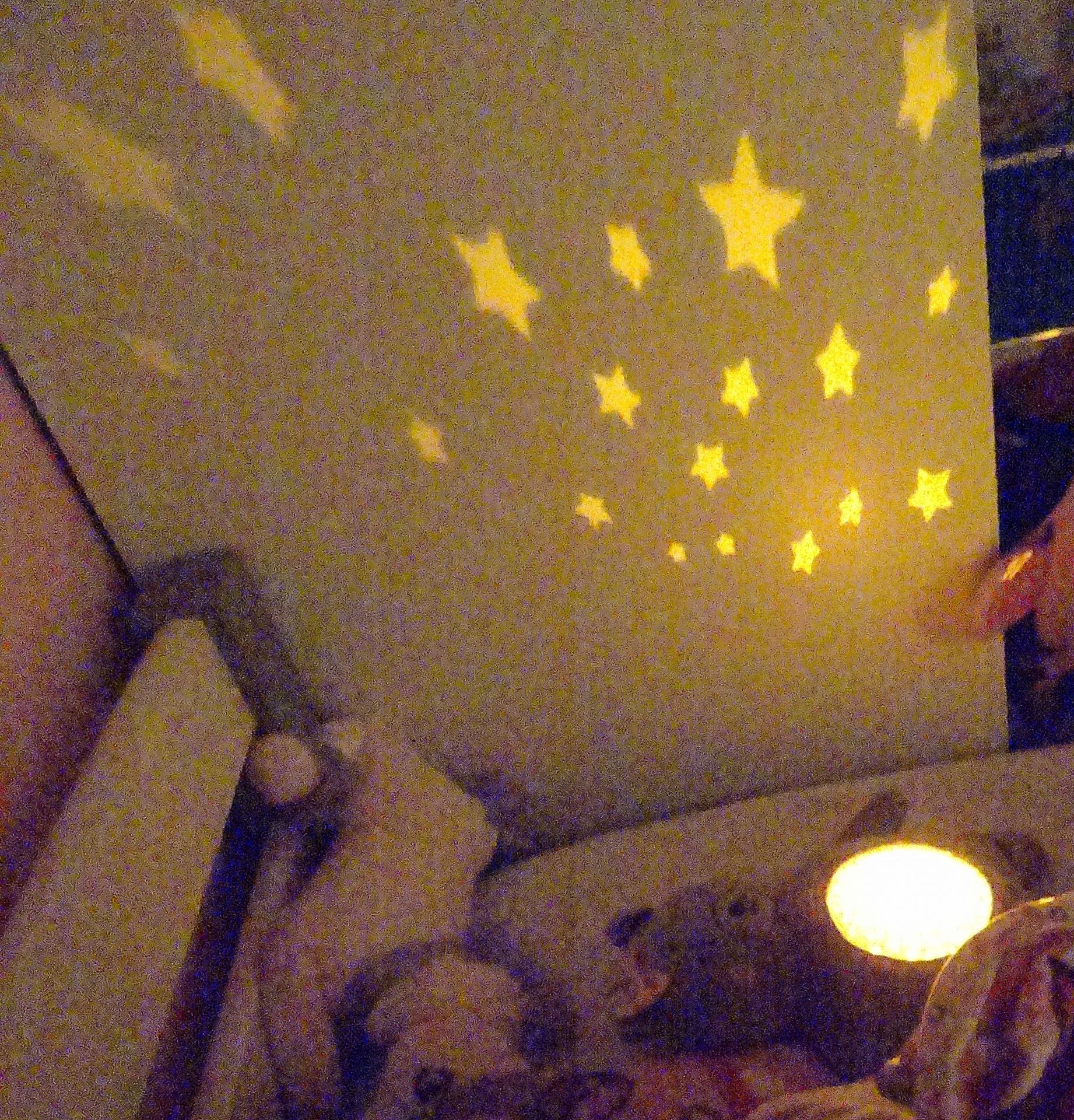 Chipie a toujours beaucoup de mal à s’endormir et a peur du noir. D’habitude on laisse la lumière du couloir allumé mais on a trouvé une autre solution.