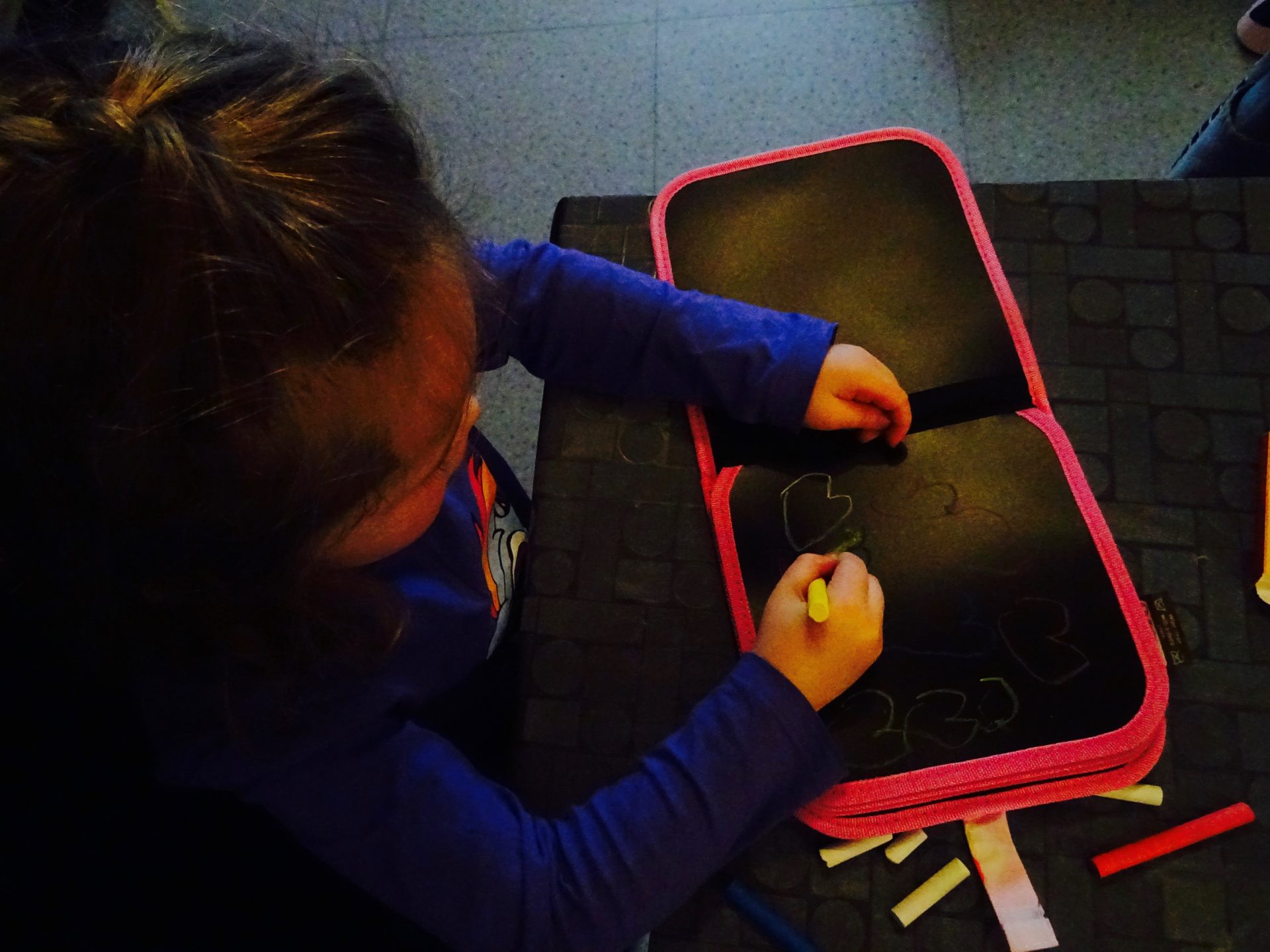 Je trouve ça vraiment génial, ça évite bien des tracas et en plus les craies sont de bonne qualité ! La grande feuille aussi, c’est une bonne idée pour mon petit lion qui se met toujours par terre pour dessiner lol !