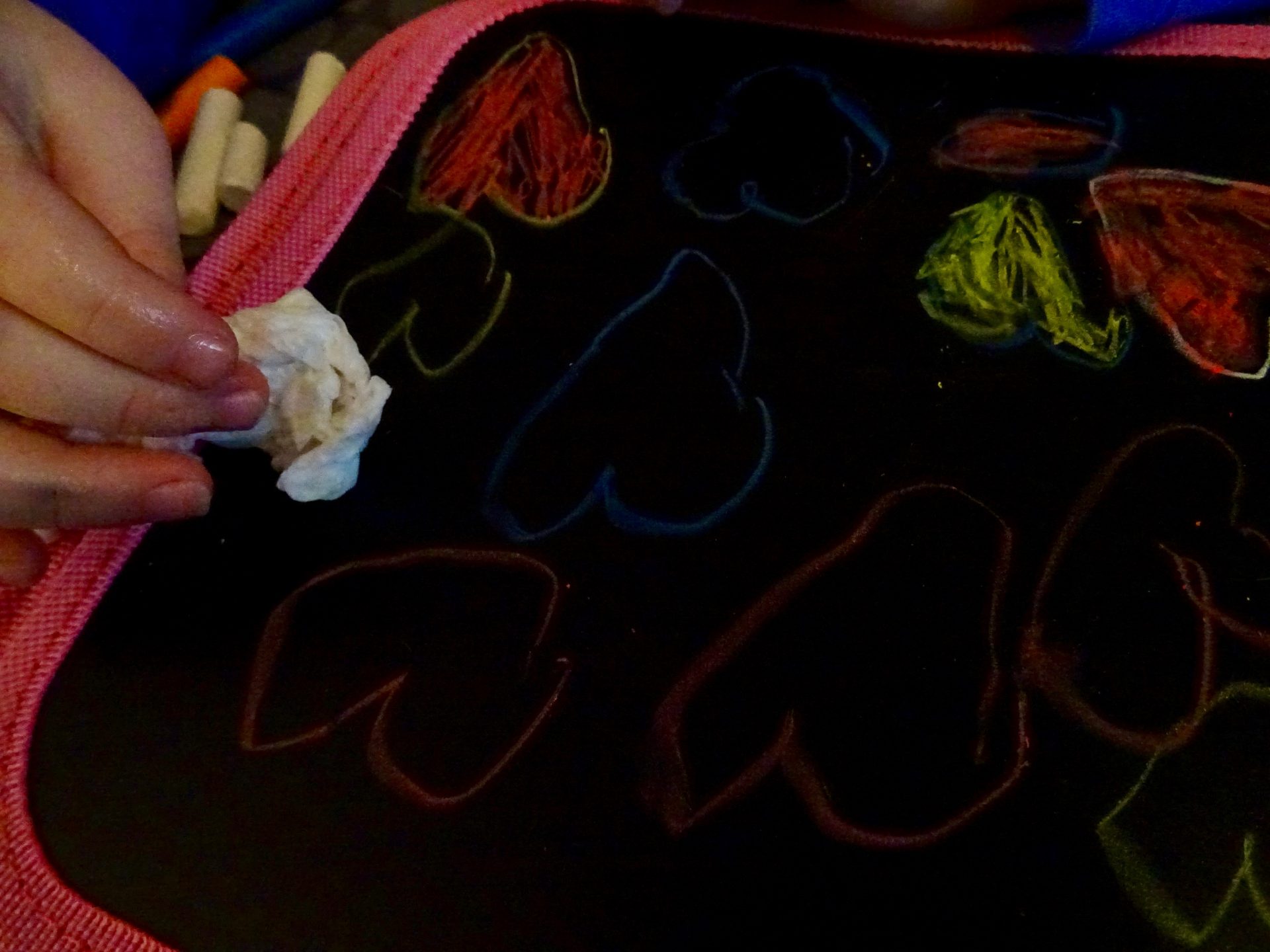 On peut passer ses mains sur le dessin ou ses vêtements aucun risque que cela ne part pas! Et hop un coup de chiffon mouillé et on repart sur une page vierge.