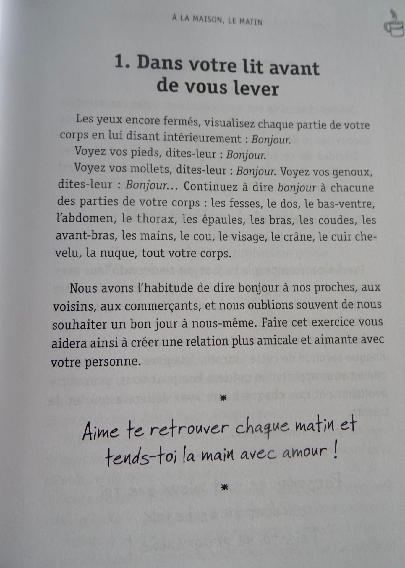 le 1er est juste parfait : j’ai un peu de mal avec les livres sur le developpement personnel qui sont longs à lire, alors là, une page, 5 minutes : de petits exercices simples et accessibles : je valide !