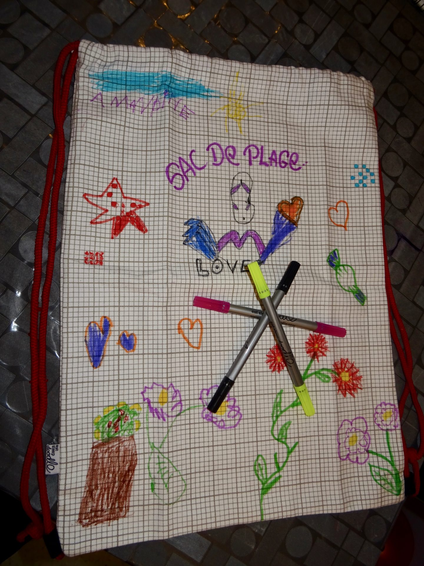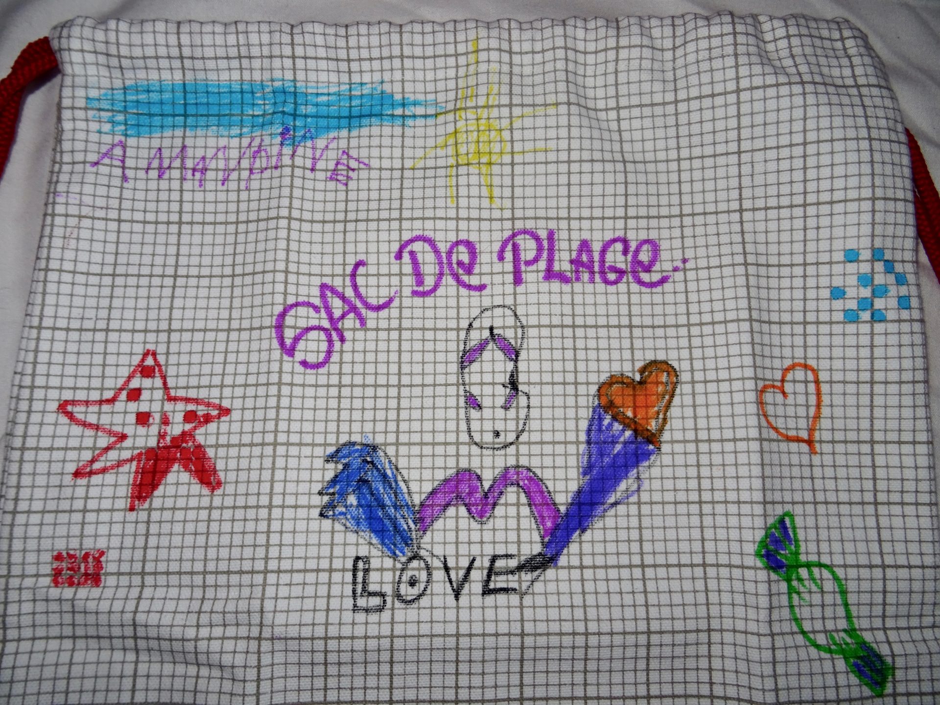 Nous avons passées un super moment avec chipie, car je l’ai aidée et nous avons réalisées un super sac de plage pour y glisser un maillot de bain, un gouter et des jeux !
