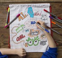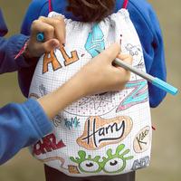 Regardez comme elle est ravi de pouvoir personnaliser ce sac à dos avec des stylos de vives couleurs !