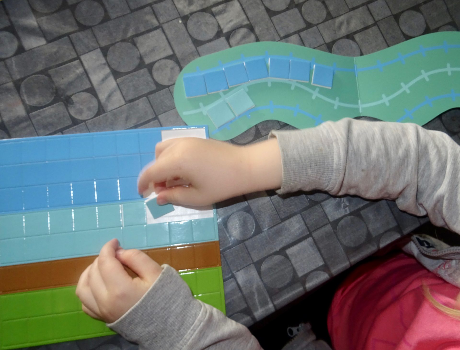 Puis c’est parti pour la mosaïque avec des planches autocollantes de carrés et de triangles.