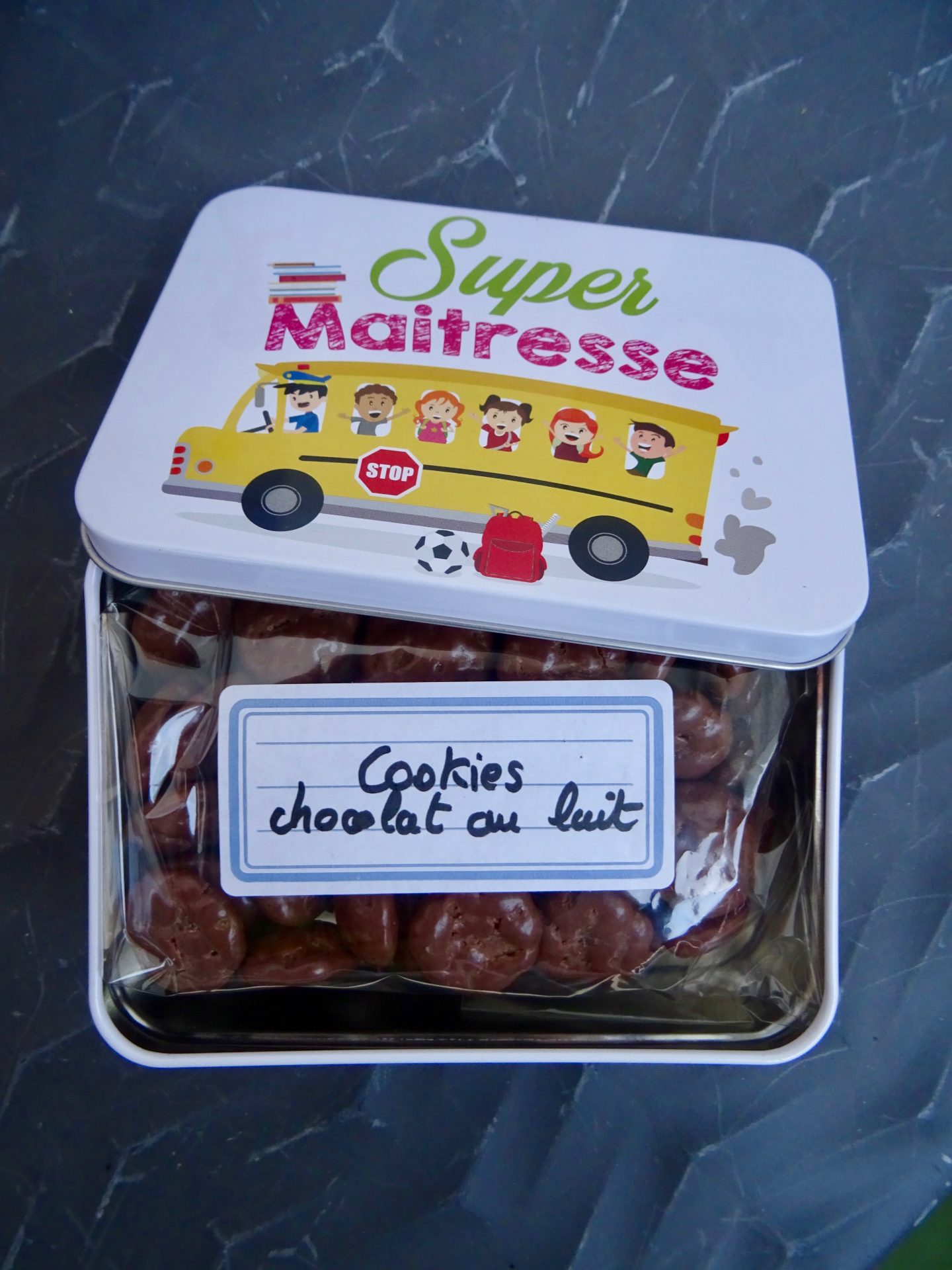 Boite en métal « Super maitresse » garnie de Dragées Cookies chocolat au lait !