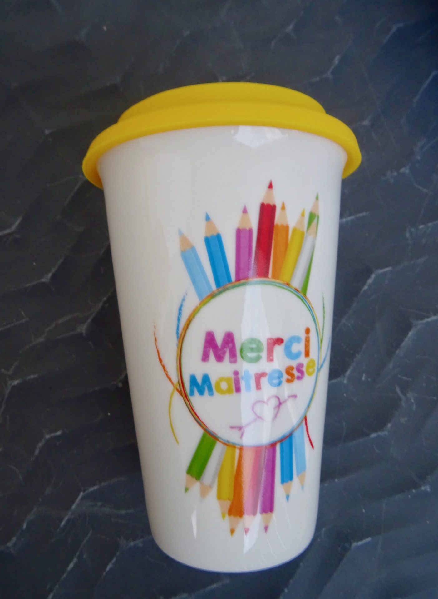 Gobelet « Merci Maitresse » en porcelaine avec couvercle. Idéal pour ses pauses vitaminées et caféinées.