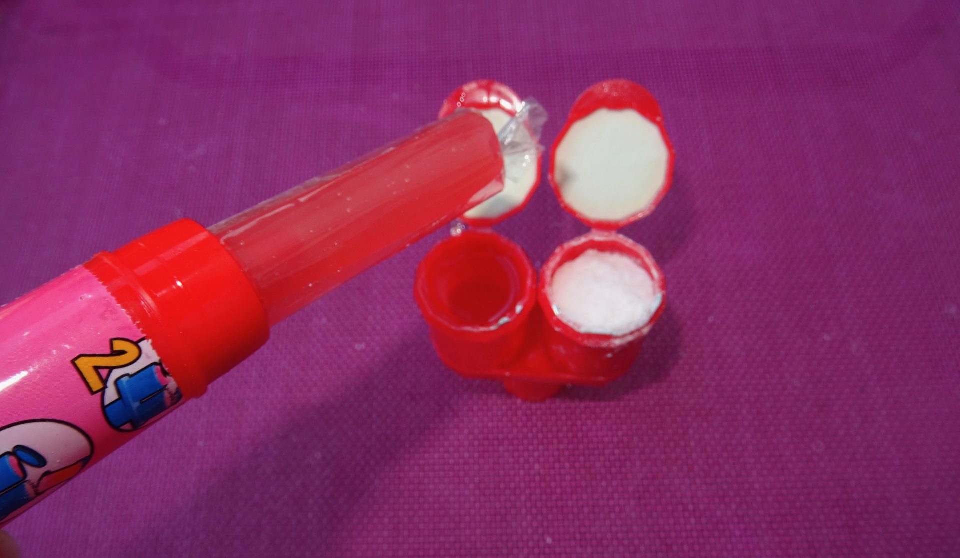 Une sucette trempée dans la poudre citrique (goût fraise).