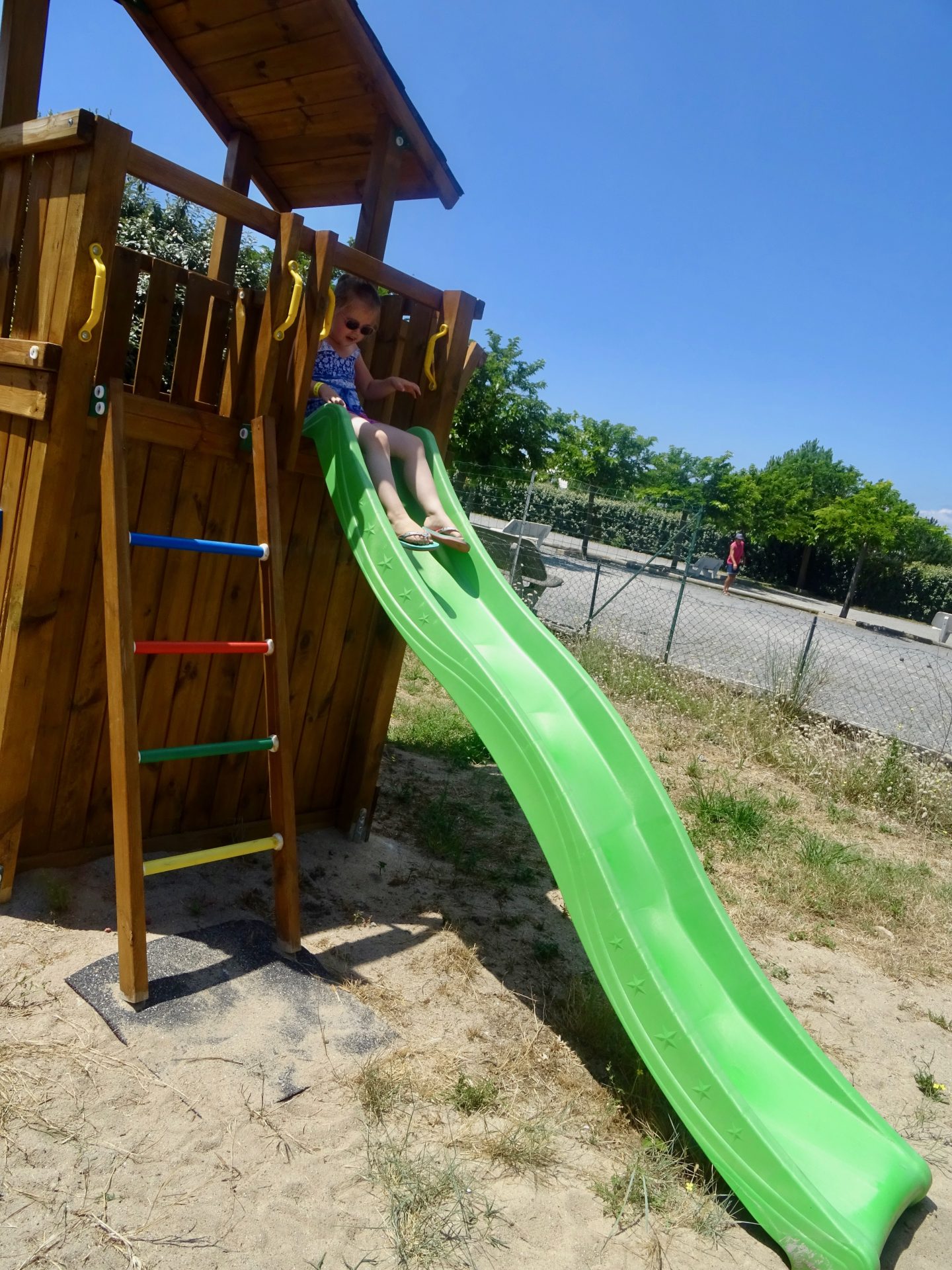 Bien sûr chipie a de suite repéré la jolie structure en bois en forme de bateau de pirate, équipée d’un toboggan, de jumelles pour voir l’ennemi au loin, d’une passerelle etc.. Elle y a passé un long moment malgré une journée très chaude.