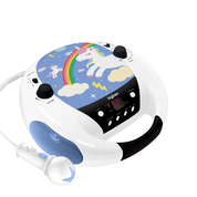 Léger et robuste, ce lecteur CD portable, décoré de licornes, dispose d’une anse qui permettra à votre enfant de l’emporter partout !