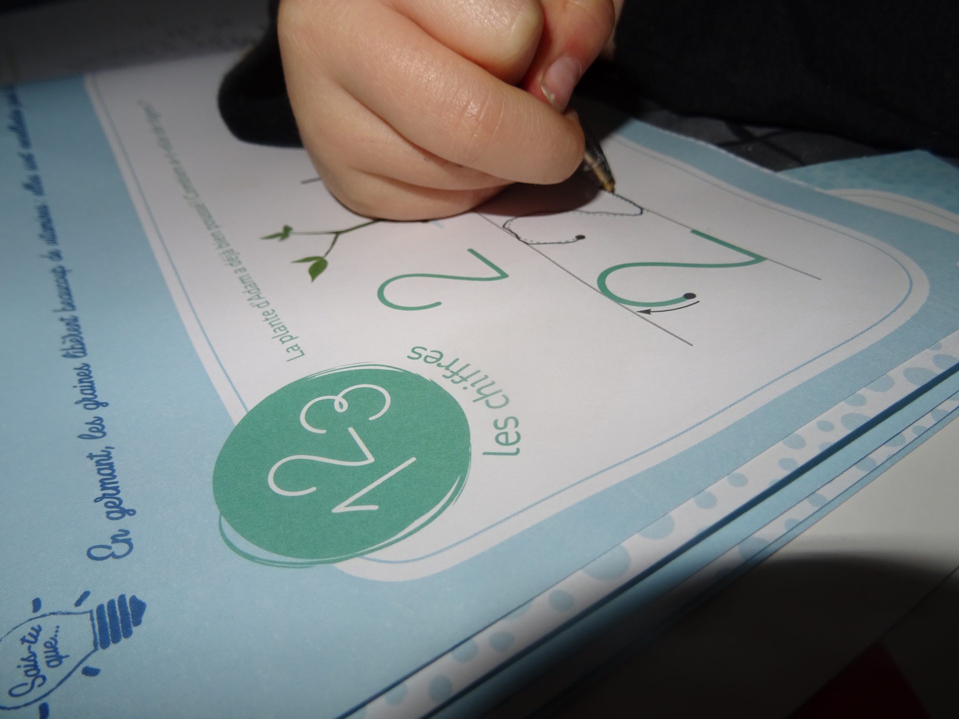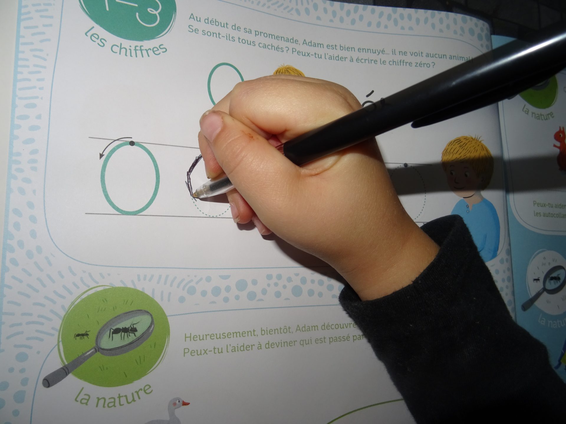On apprend à tracer dans le bon sens les lettres et les chiffres, grâce à une flèche directionnelle. Cela aide beaucoup chipie qui a tendance à commencer par le bas pour faire ses chiffres.