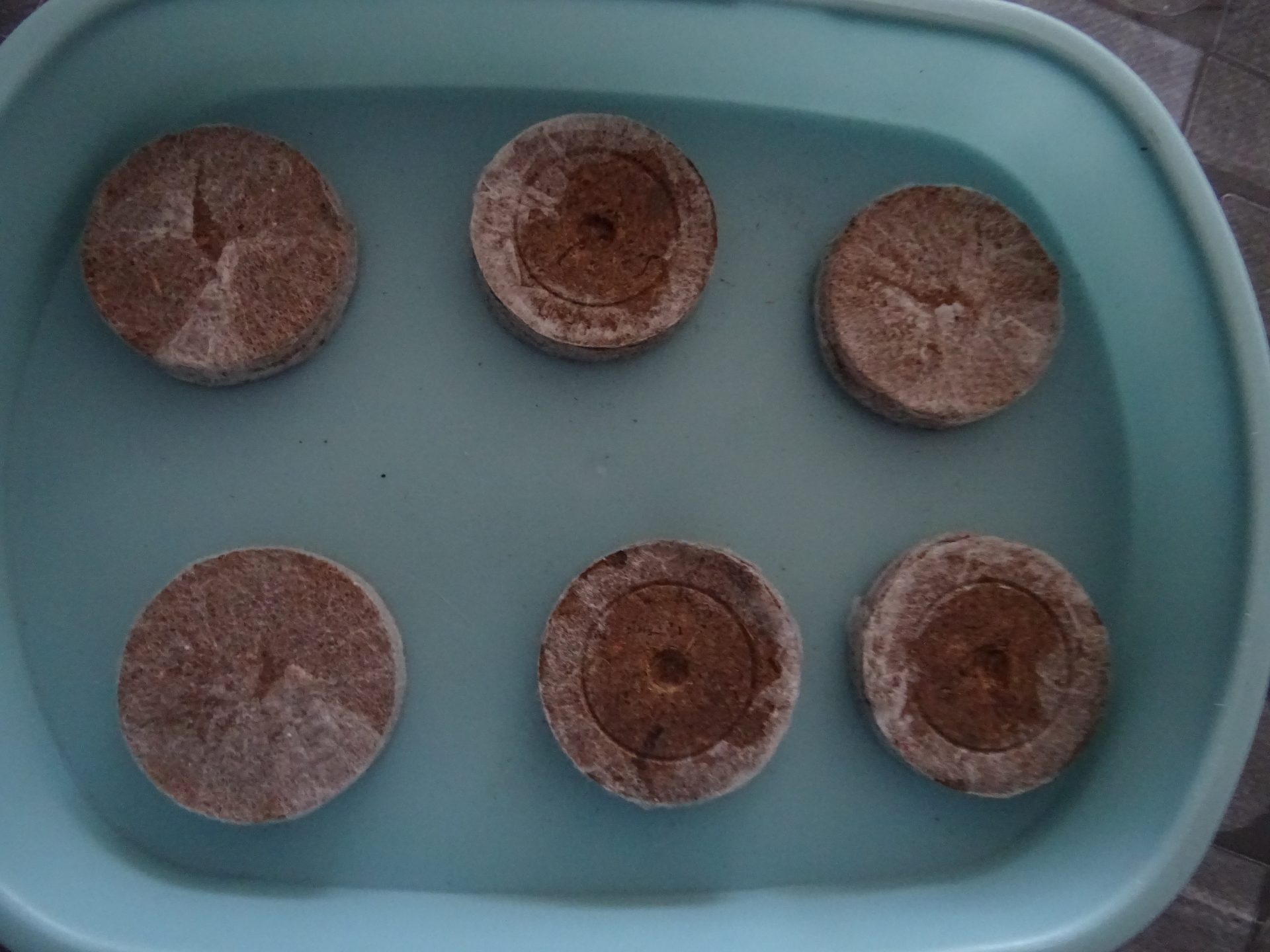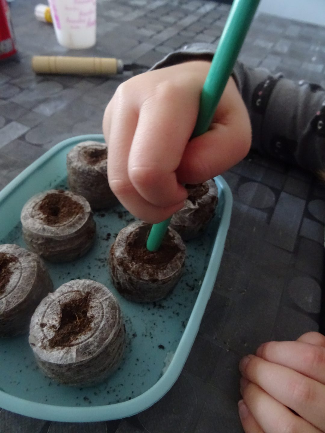 Alors avec chipie on commence par trouver une boite pour mettre nos 6 pastilles, on les imprègne d’eau. Après 10 minutes d’attente, les pastilles ont gonflées et doublé de volumes du coup il est temps de réaliser des petits trous pour planter les graines.