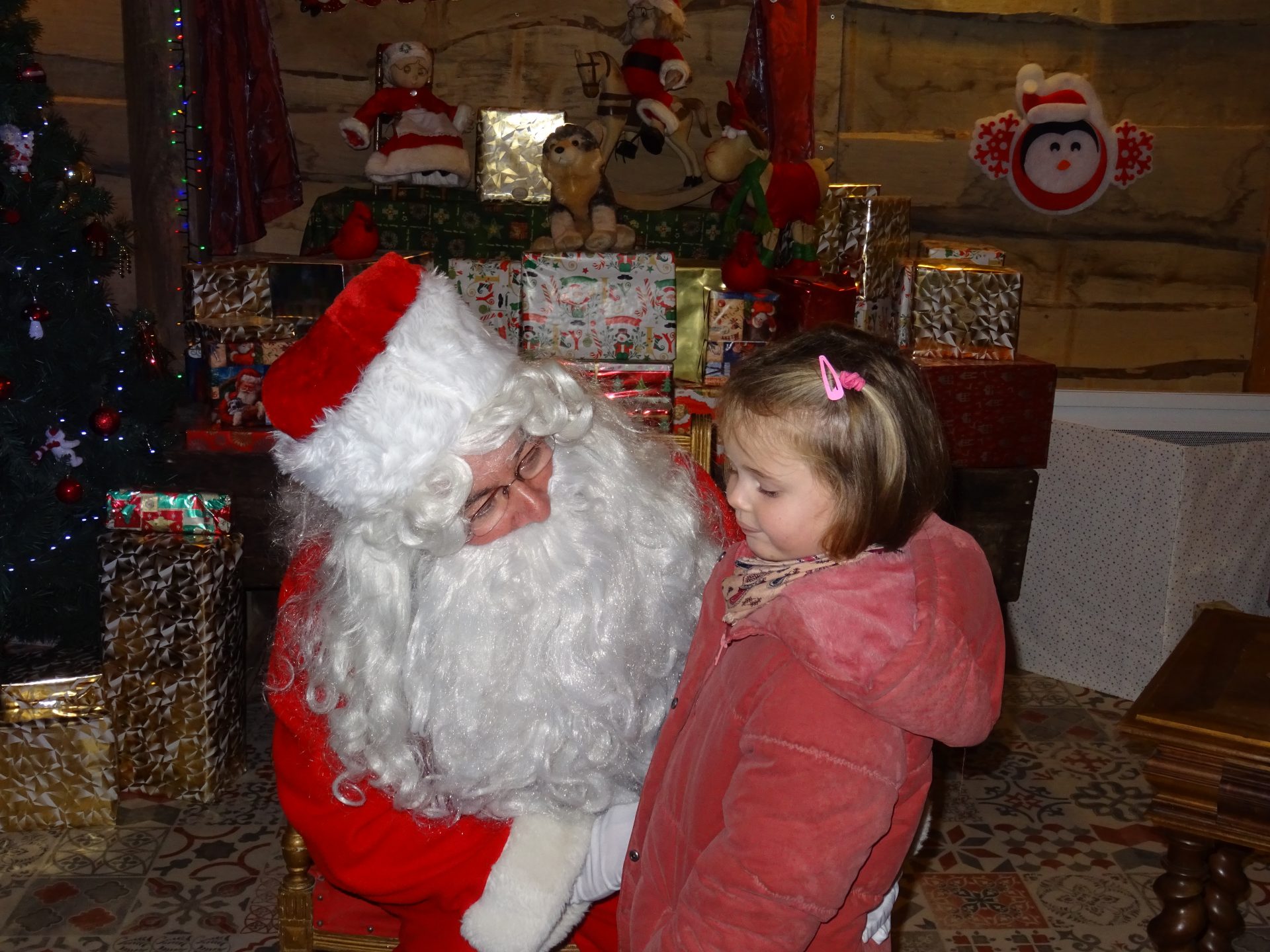 Le déguisement est plus réaliste que les années précédentes… Un Père Noël a l’ecoute de chaque enfant qui a posé à chipie plein de questions : son âge, sa classe, sa commande de Noël etc.. Chipie était aux anges et un peu intimidée!