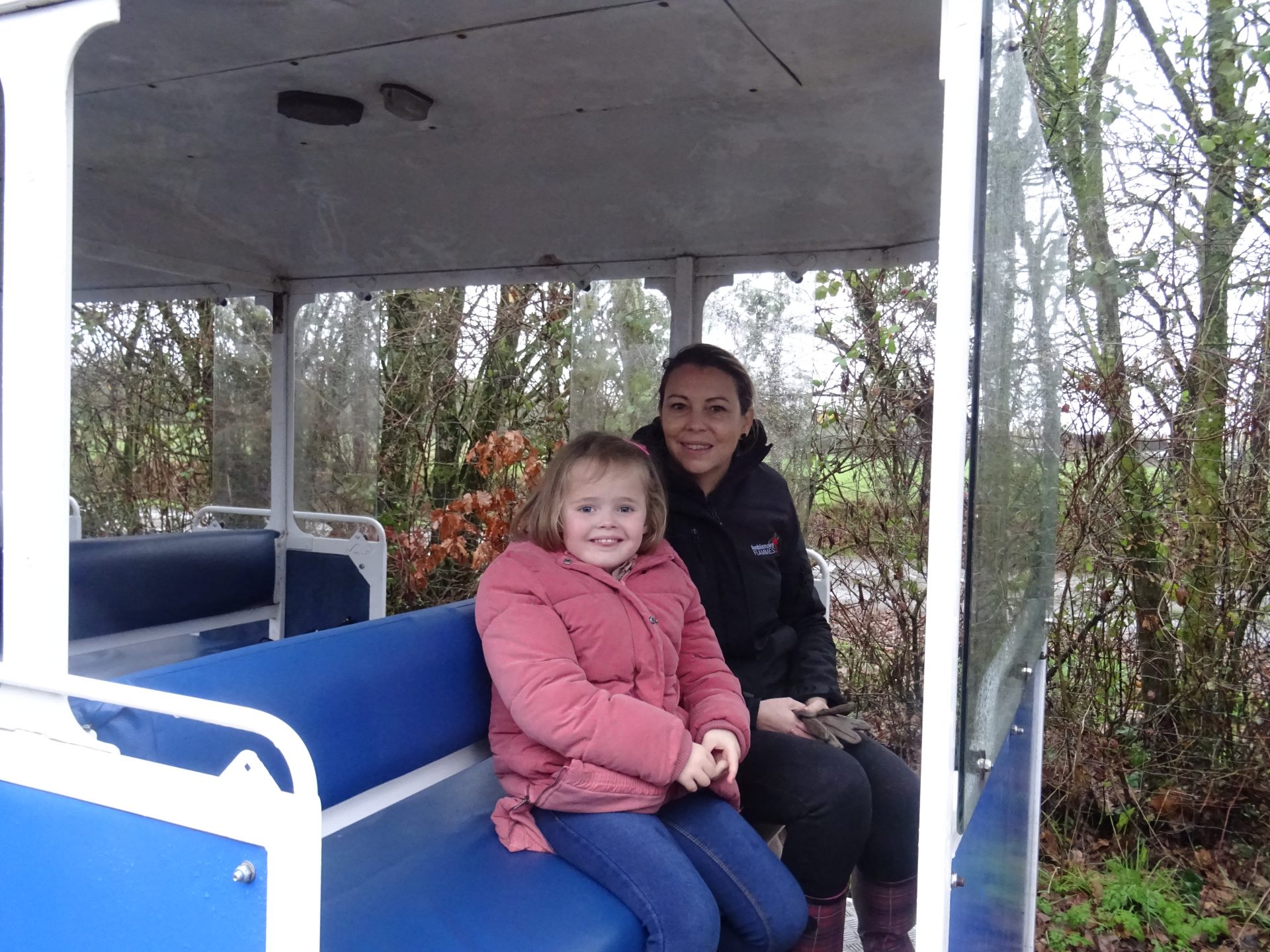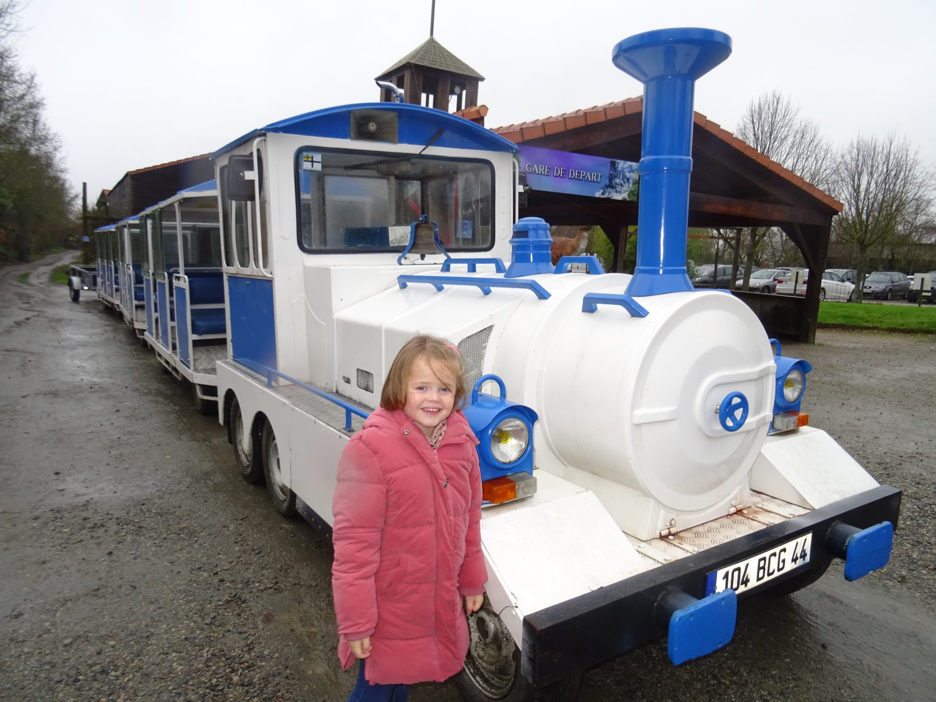 Puis avant de partir nous avons eut la chance de rencontrer le chef de gare qui nous a fait faire un tour de train même si il pleuvait à torrent. Du coup nous ne sommes pas descendu à l’arrêt prévu pour faire le tour du parc mais au moins chipie aura eut le droit de faire son petit tour de train et de voir les élans, les walibis, ..