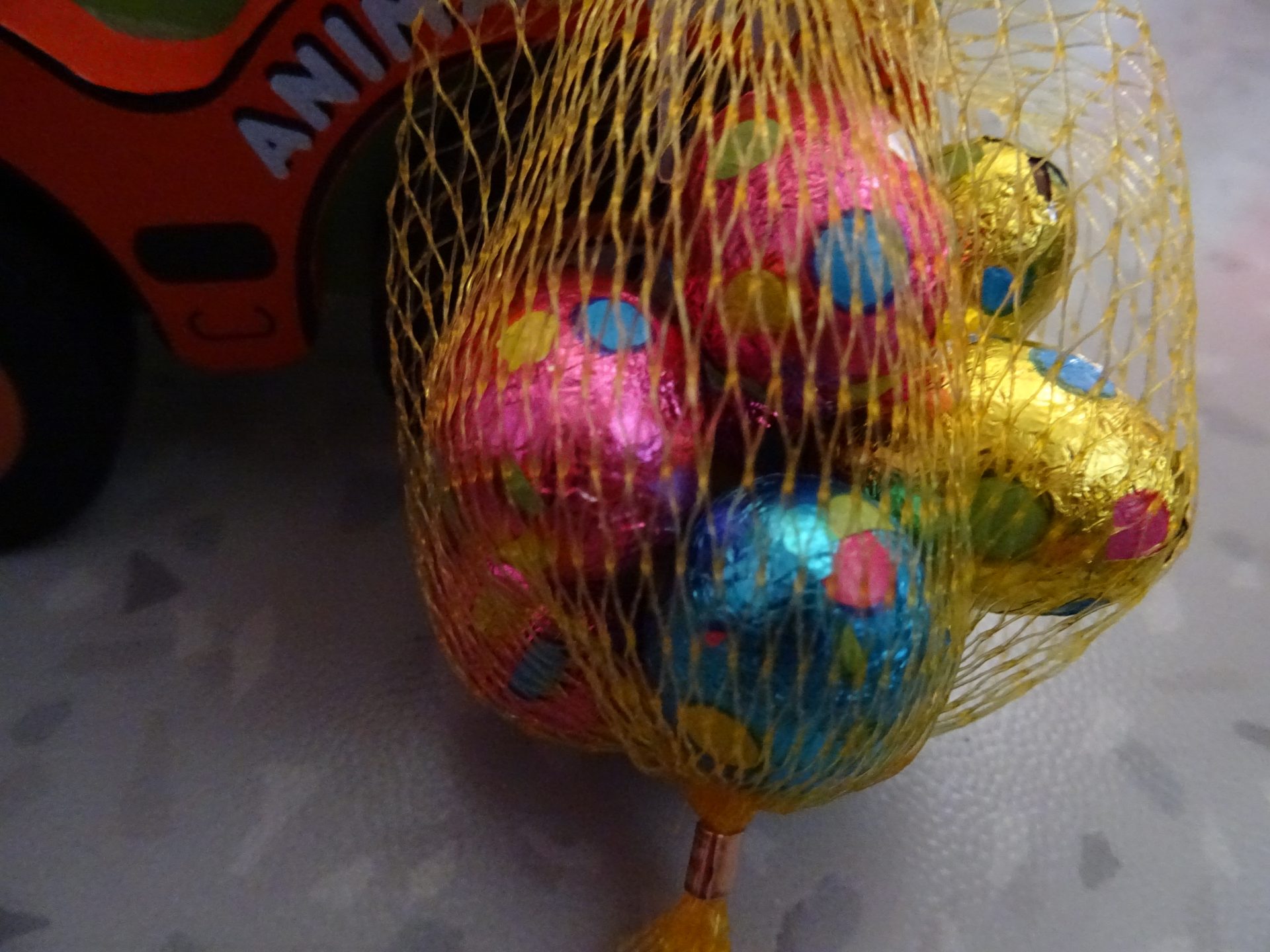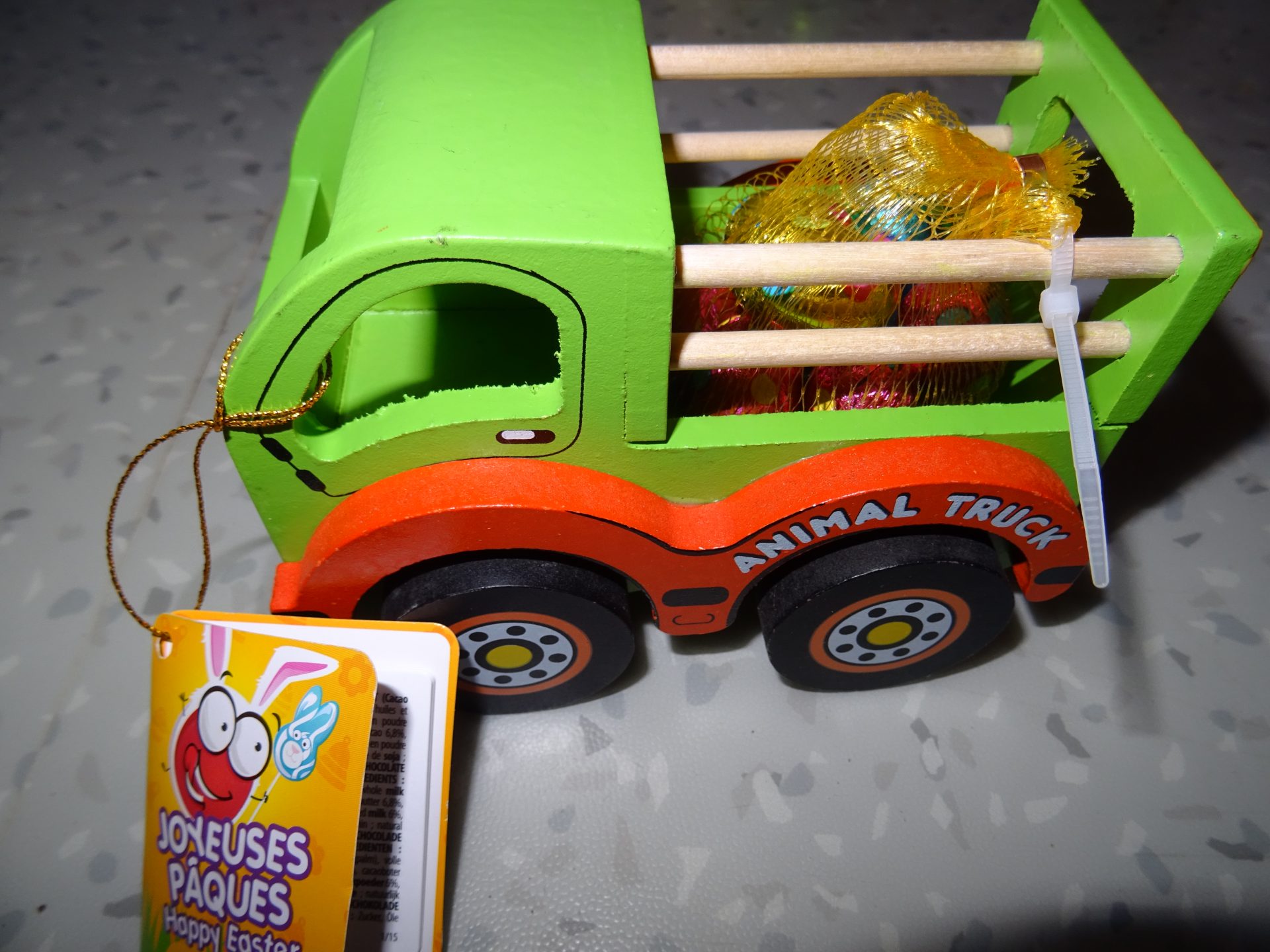 On a reçu un tracteur en bois que chipie adore déjà. Et on complète nos petits œufs de pâques avec ce sachet de pralinés.