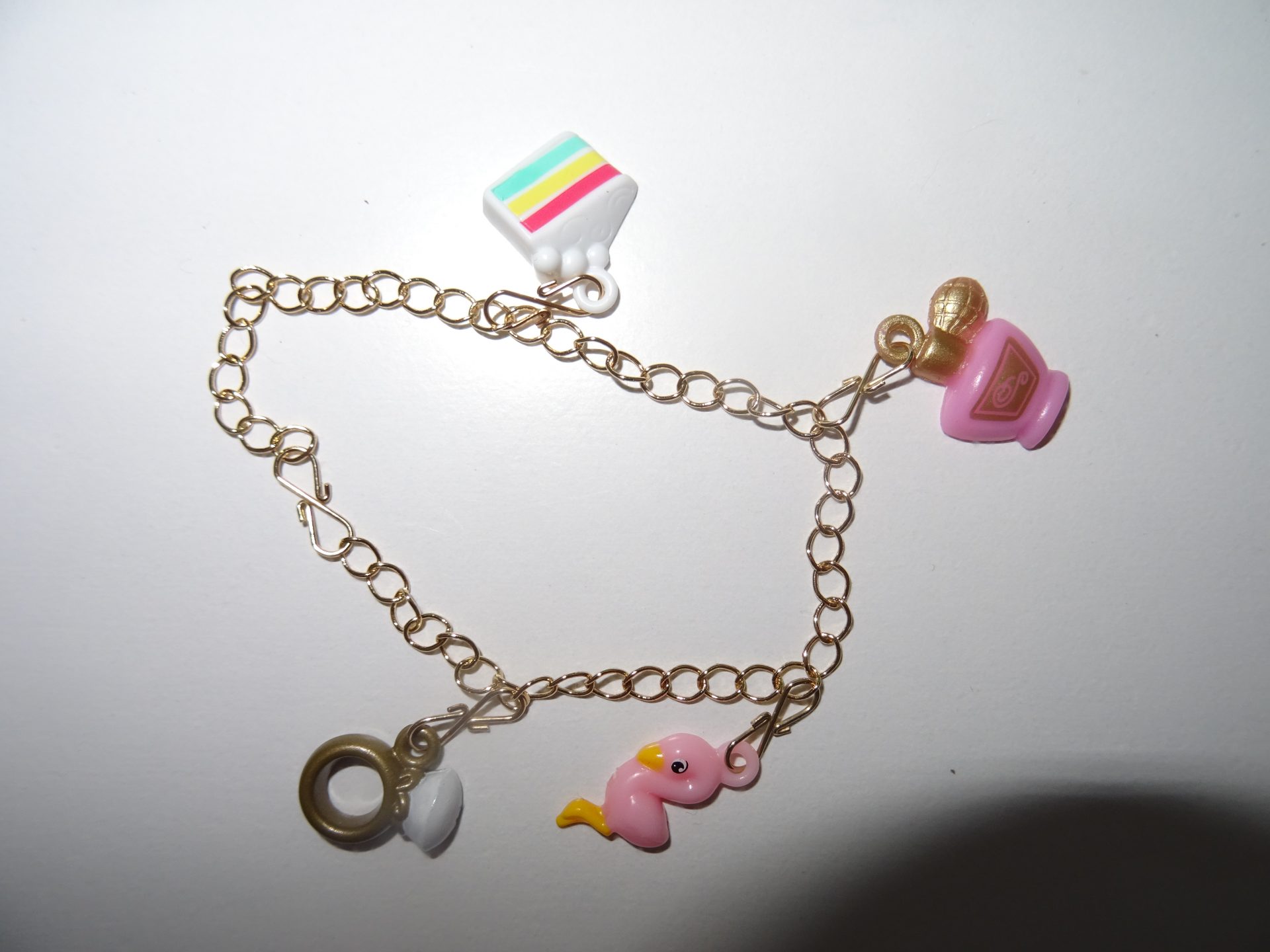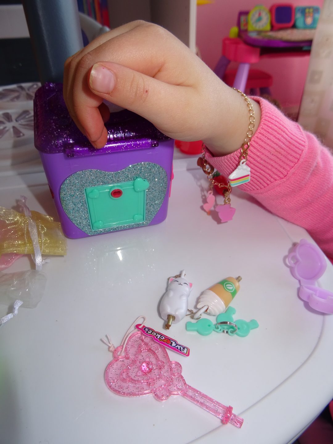 La dernière clé ouvre le haut de la boîte où l’on découvre un joli cœur rose qui renferme un bracelet pour accrocher les charms déjà récoltés.
