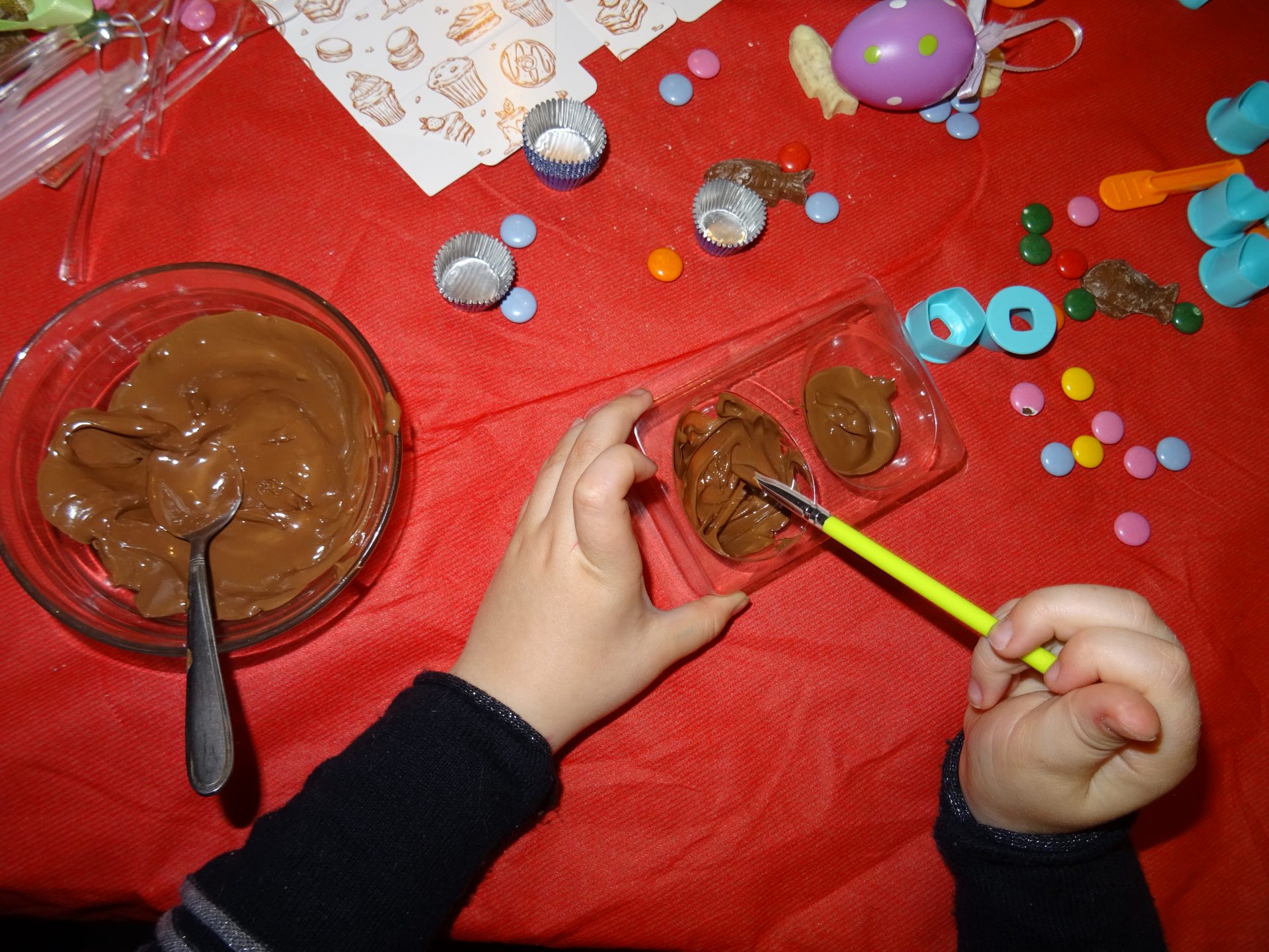 On utilise les moules œufs surprise et le pinceau et c’est parti pour la première couche !