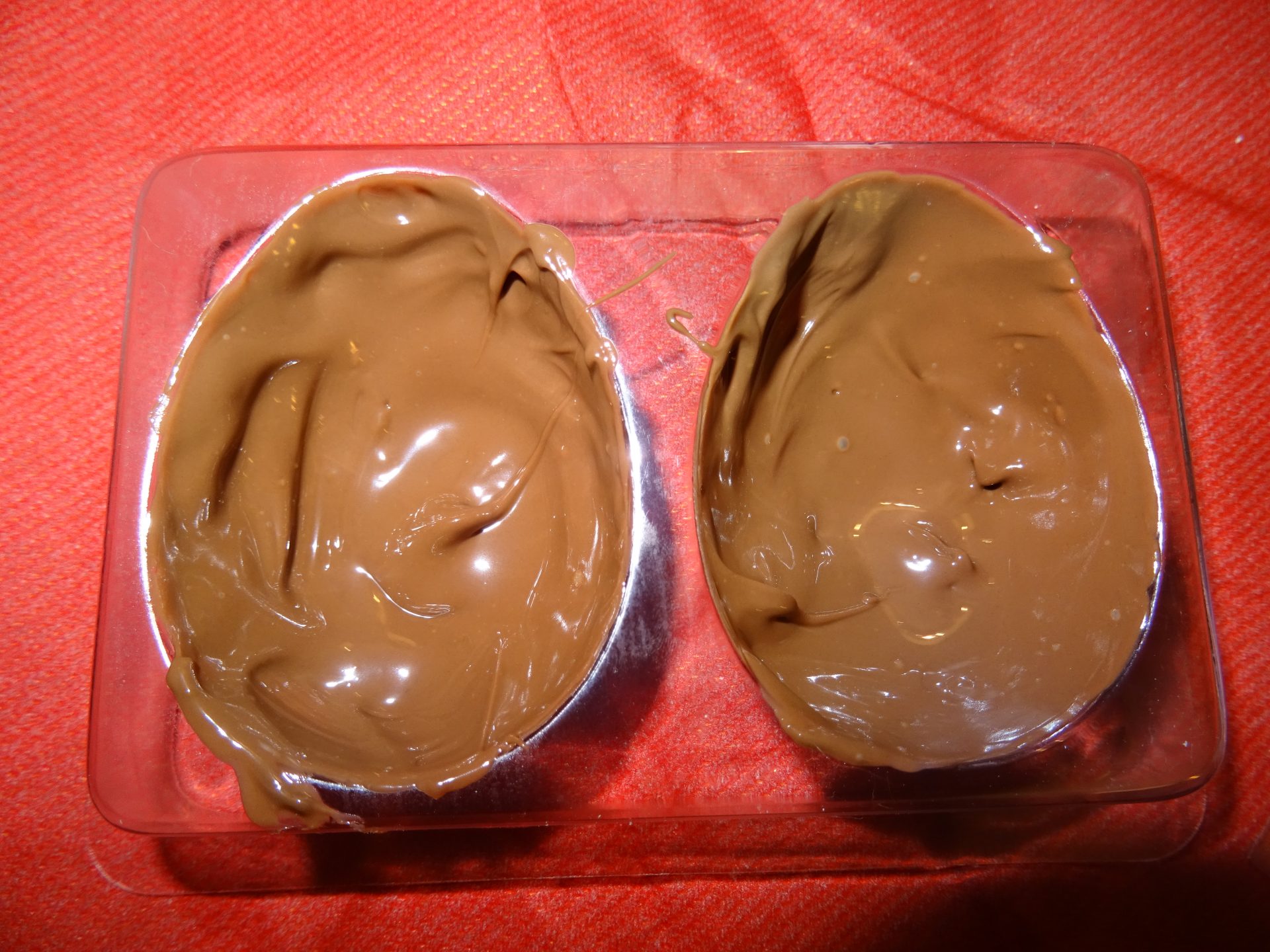 Wahoo je trouve qu’il est super bien fait pour un premier ! Chipie décide de le garnir avec des bonbons chocolatés bien connus … Et hop on referme l’œuf puis colle les 2 œufs avec du chocolat encore chaud. Puis au congélateur pour une prise finale.