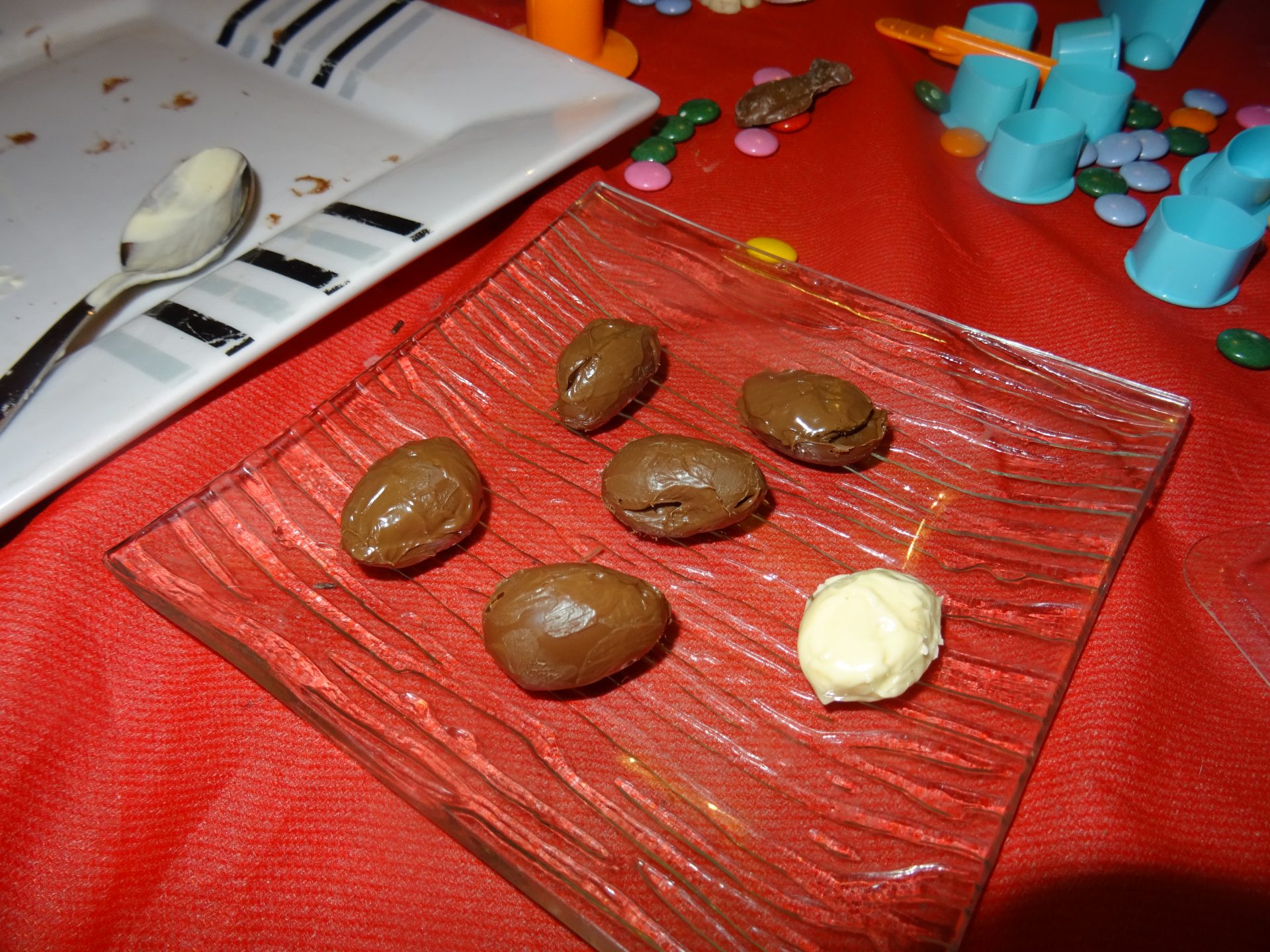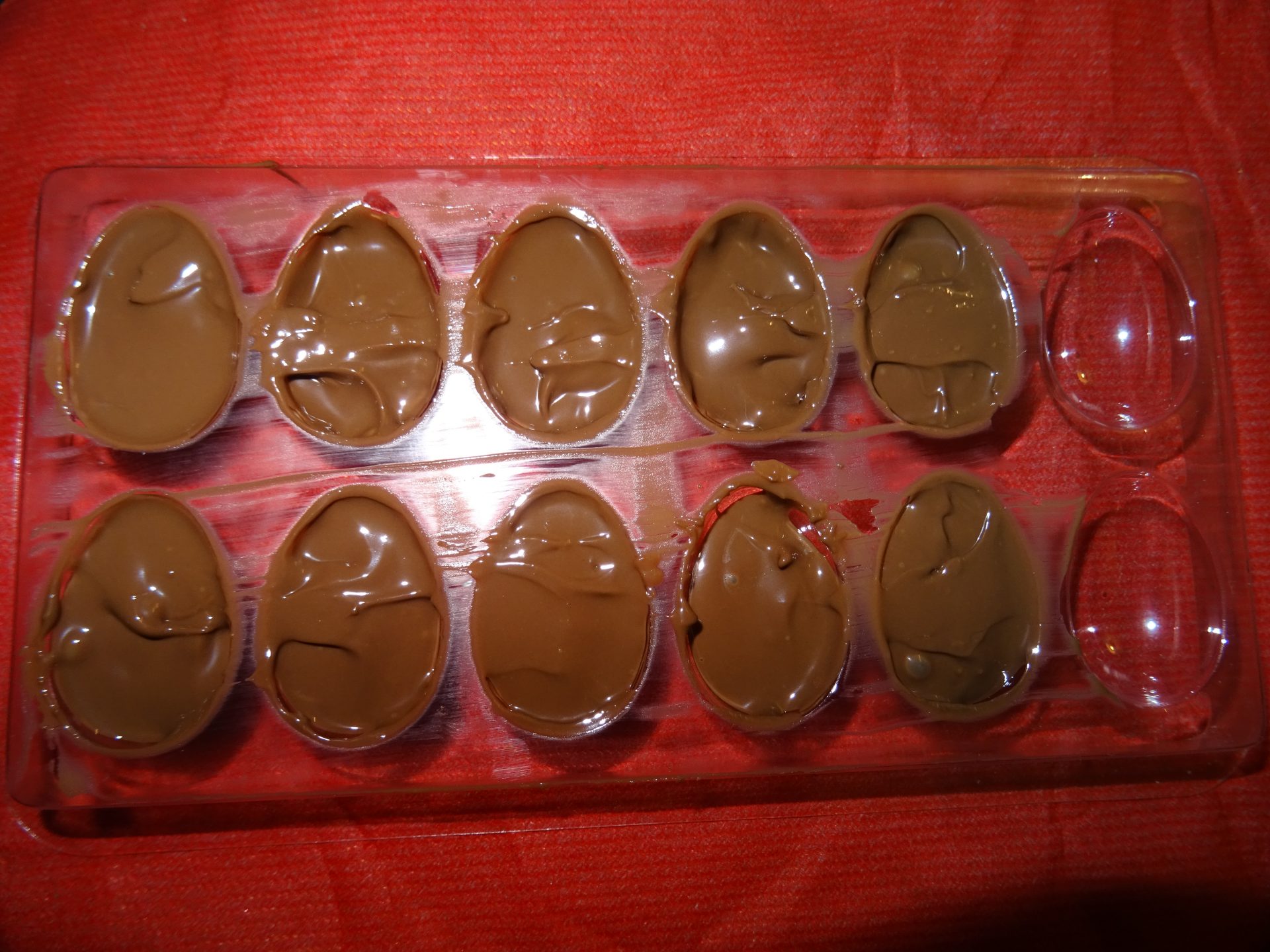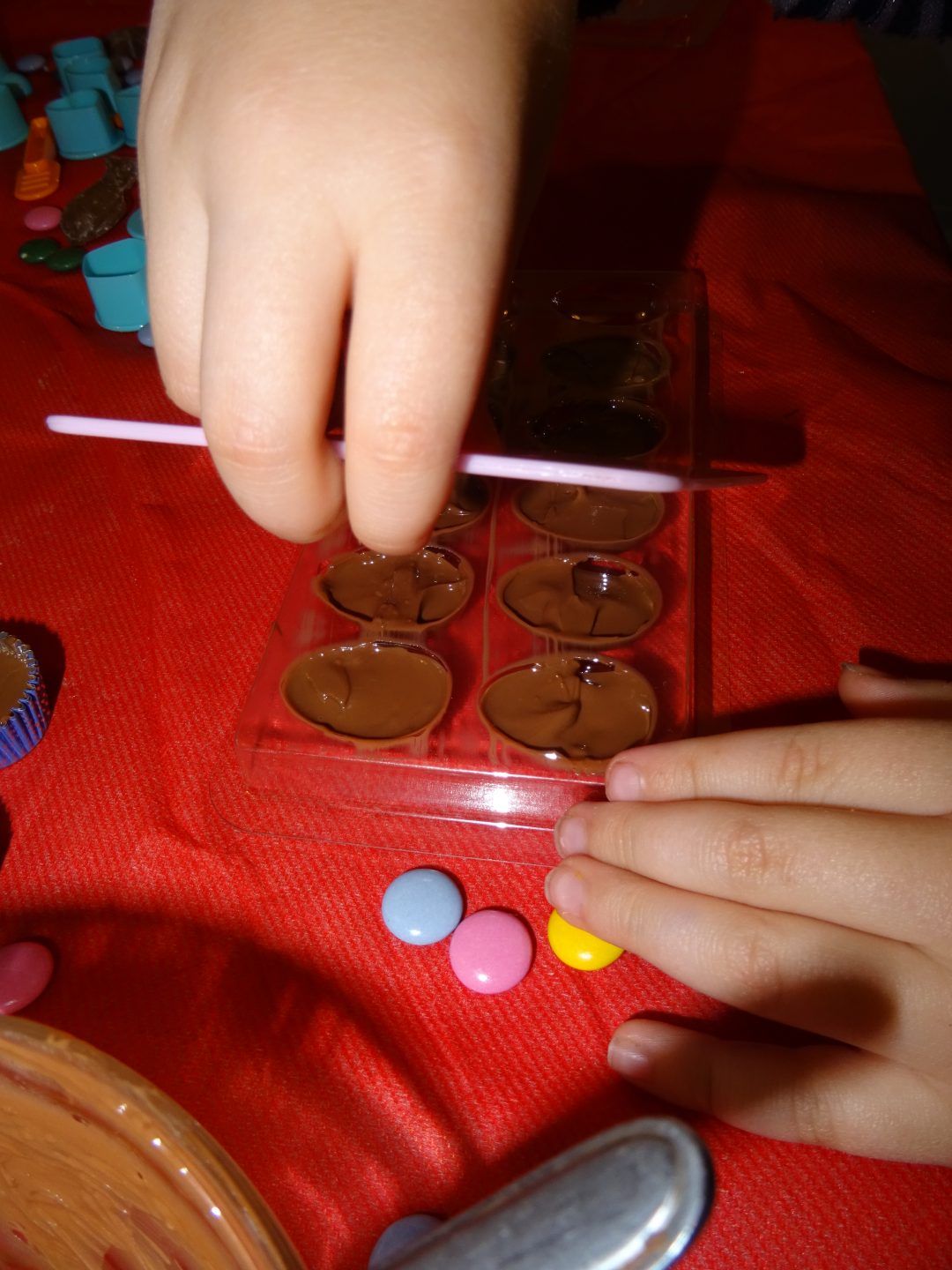 Petit astuce : on ne sait pas si on doit mettre au froid au frigo ou au congélateur le chocolat à prendre. On s’est vite rendu compte qu’il fallait préférer le congélateur pour une prise plus rapide.