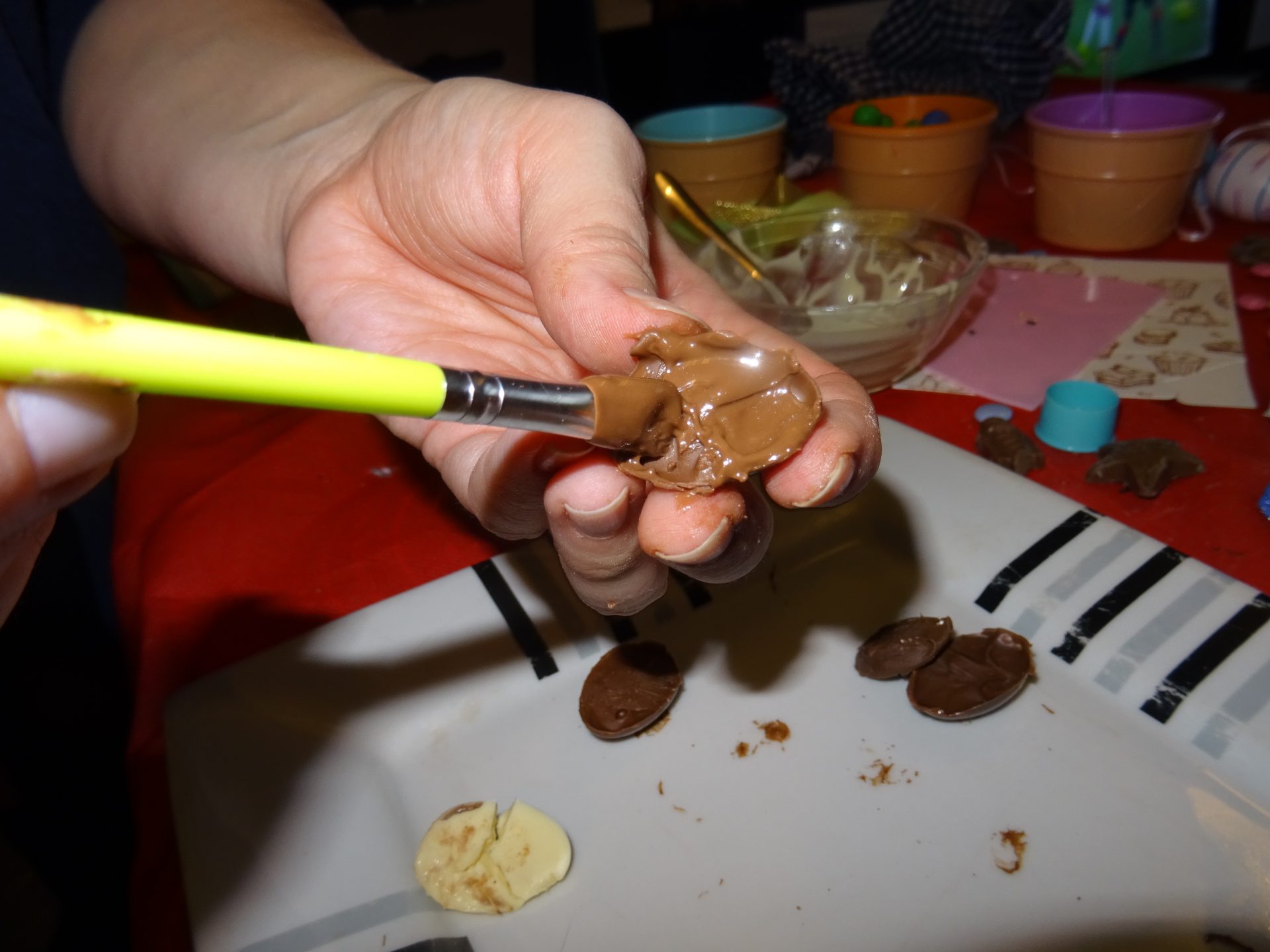 Puis on réalise avec ces petits moulages des petits œufs en chocolat, très facile à faire juste en mettant du chocolat chaud à l’aide du pinceau pour bien les arrondir.